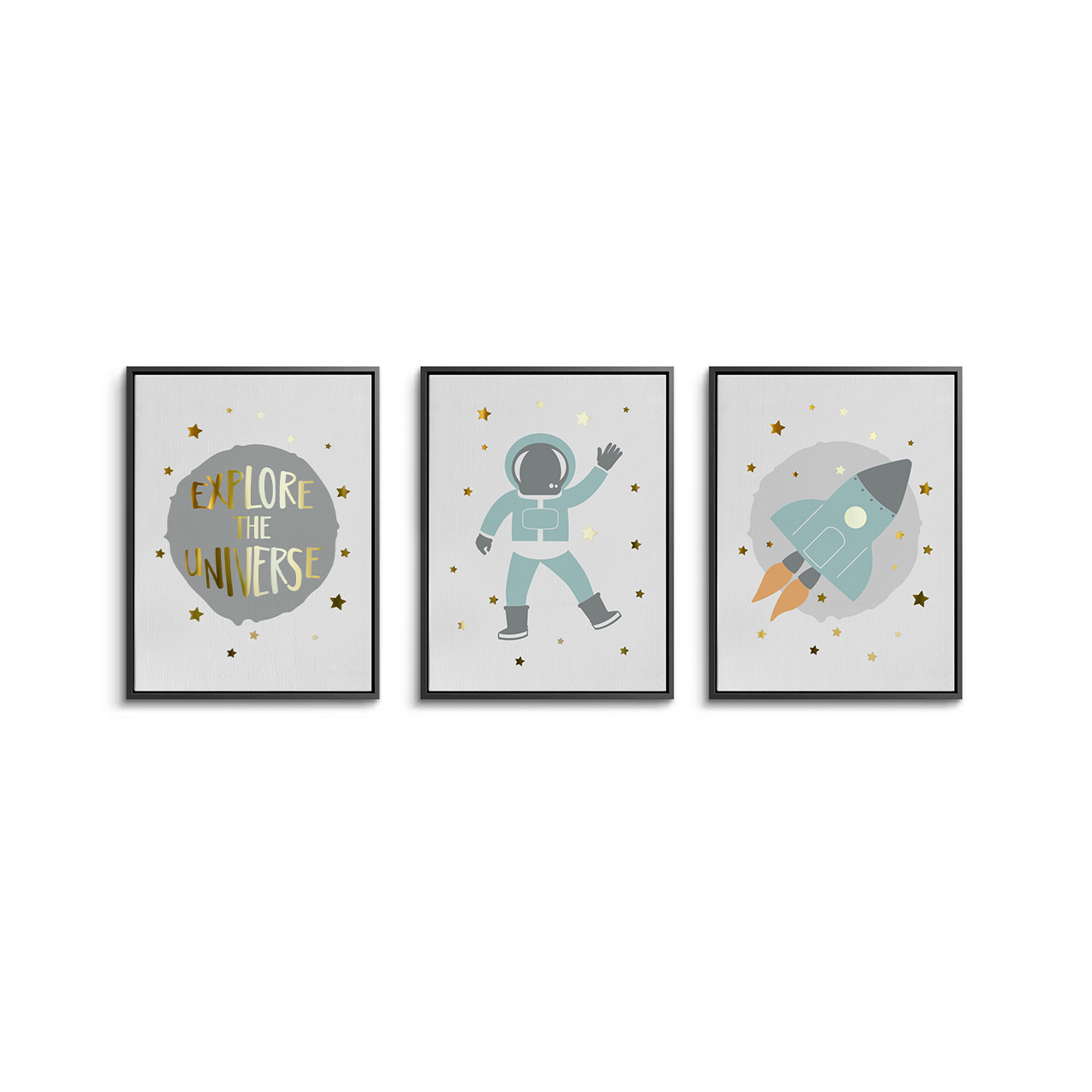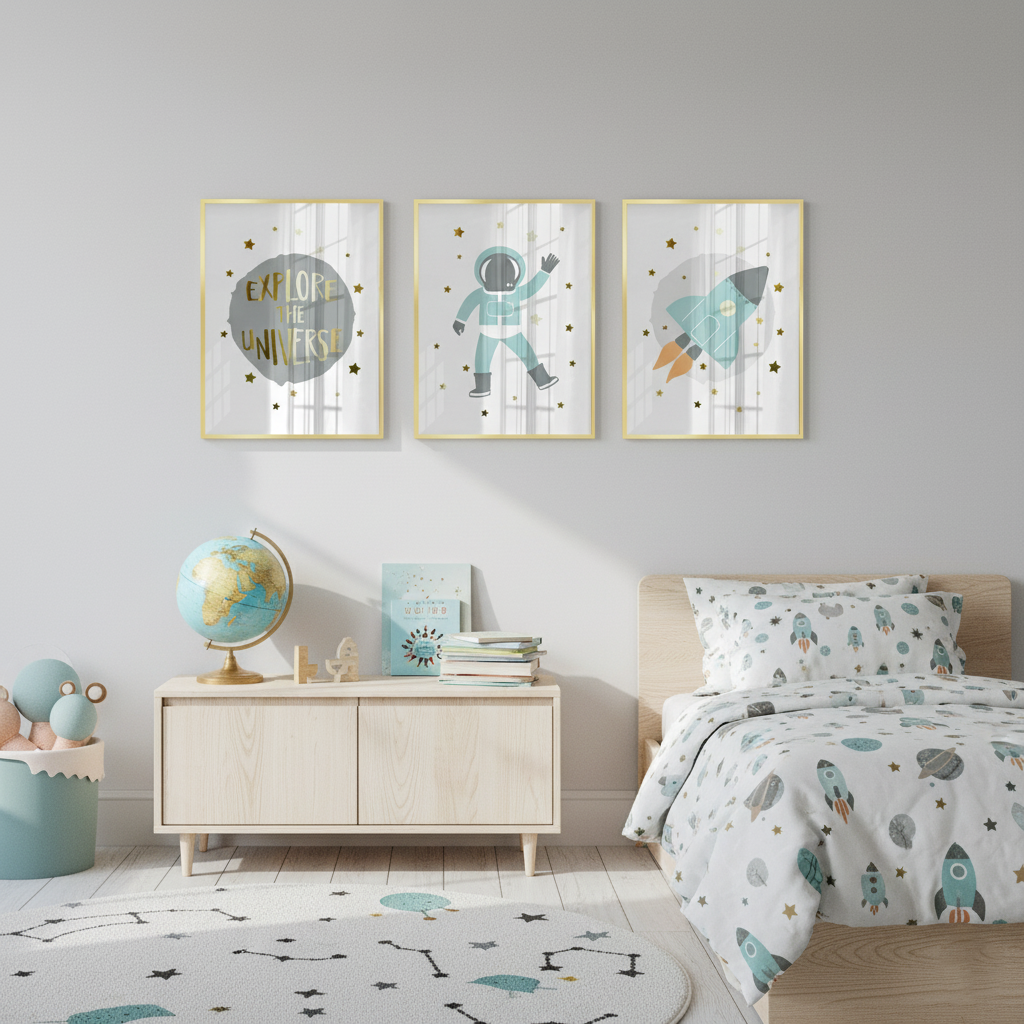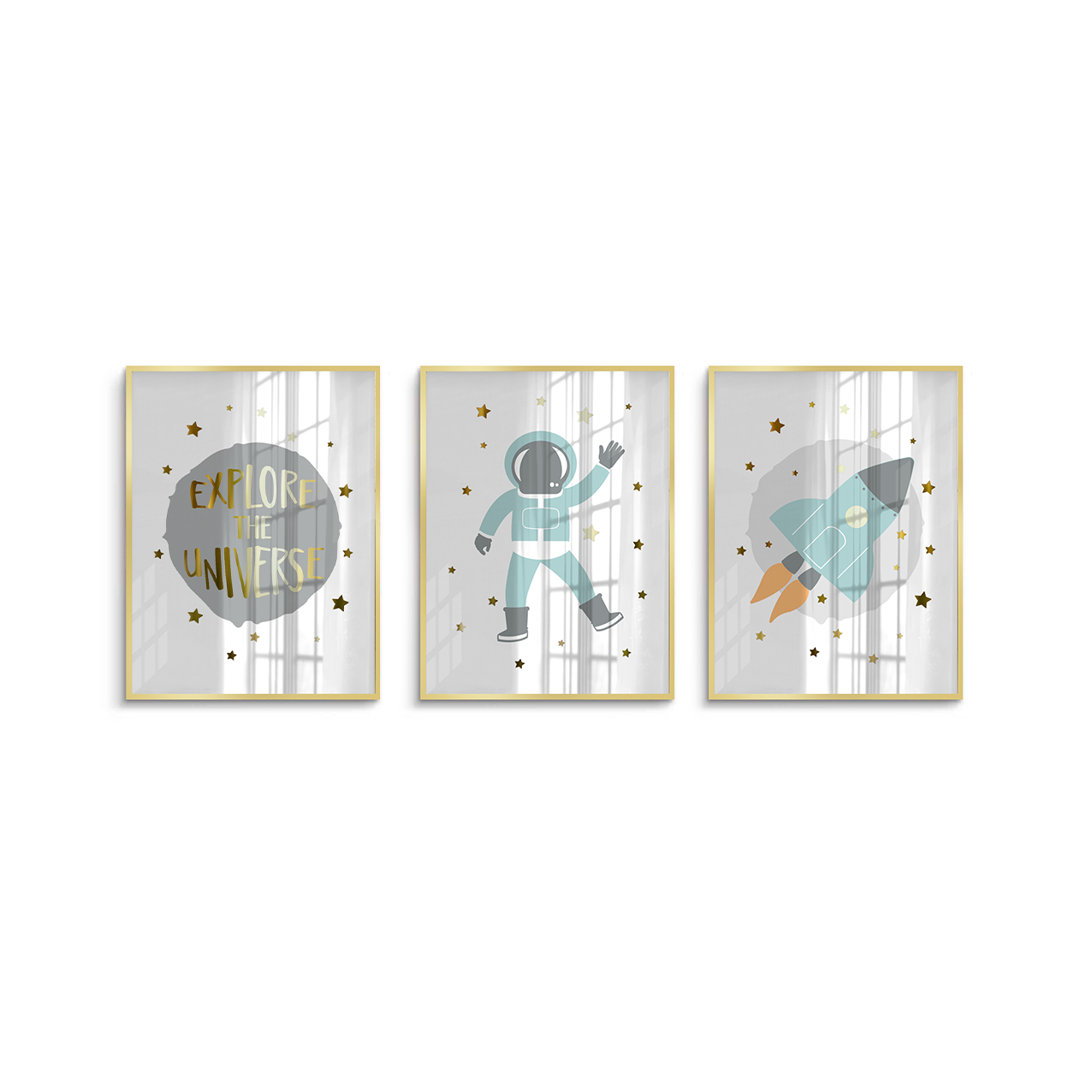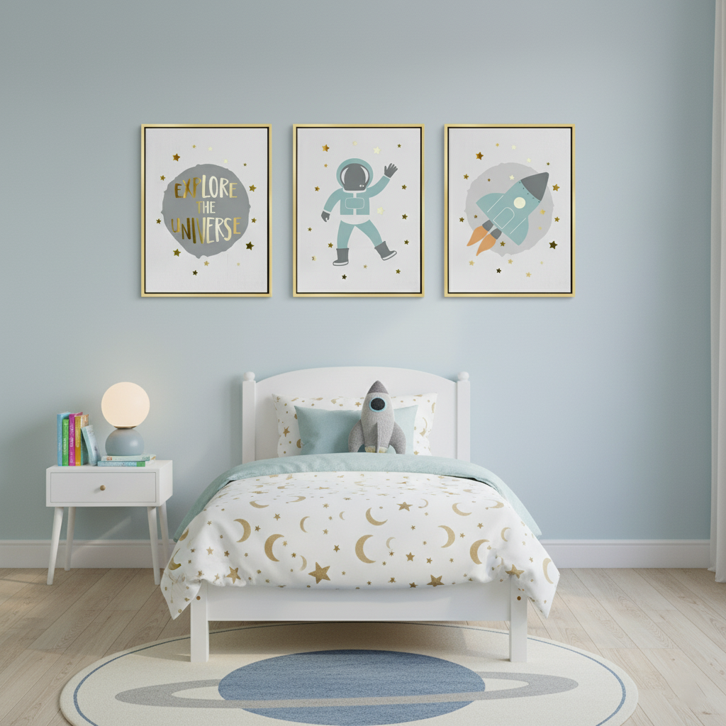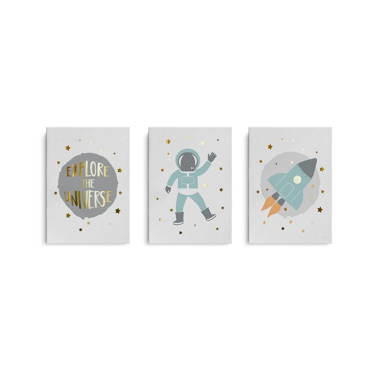 This adventurous gold foiled kids’ art set features a rocket, astronaut, and “Explore the Universe” design surrounded by golden stars. The shimmering gold foil details make it an exciting choice for nurseries, playrooms, or bedrooms.