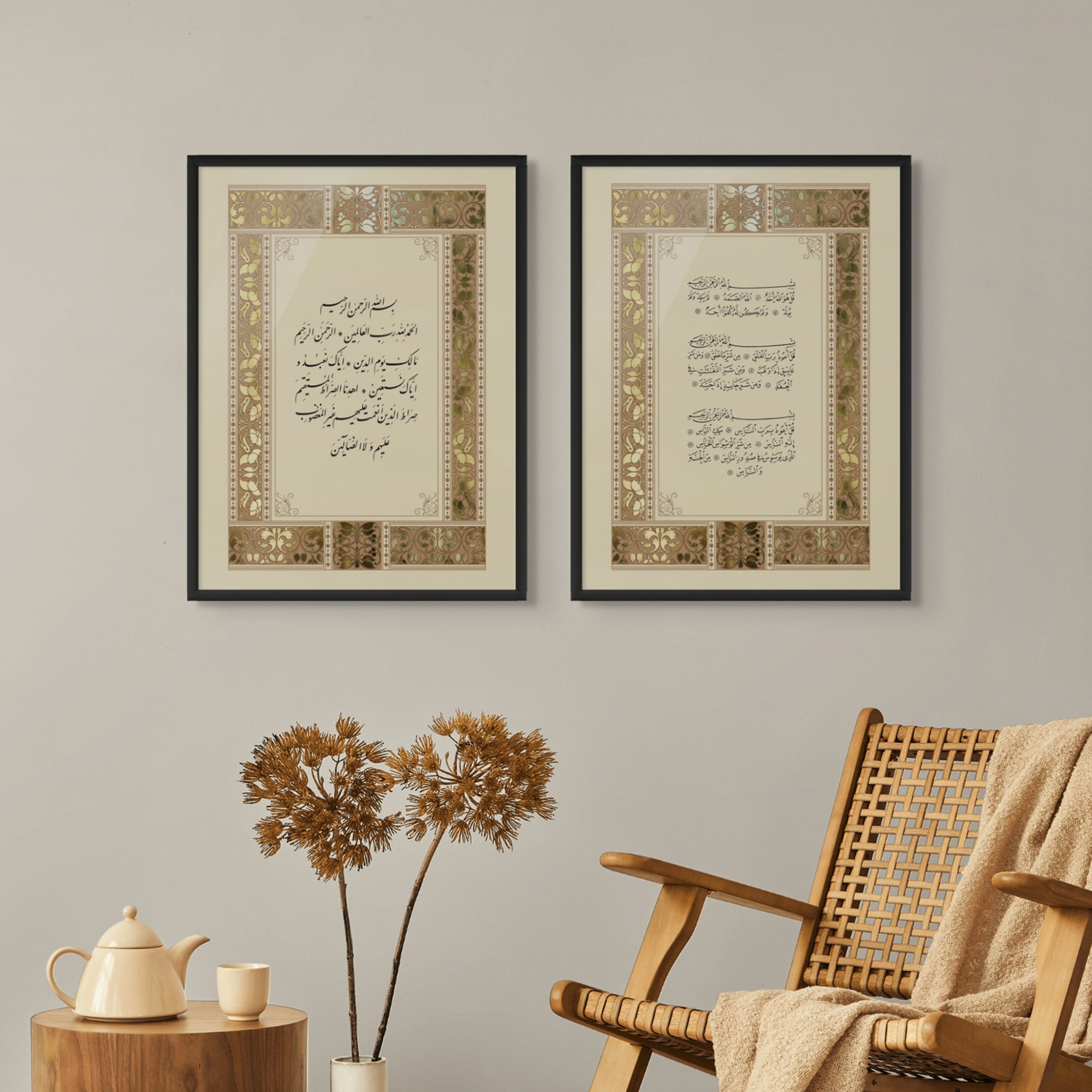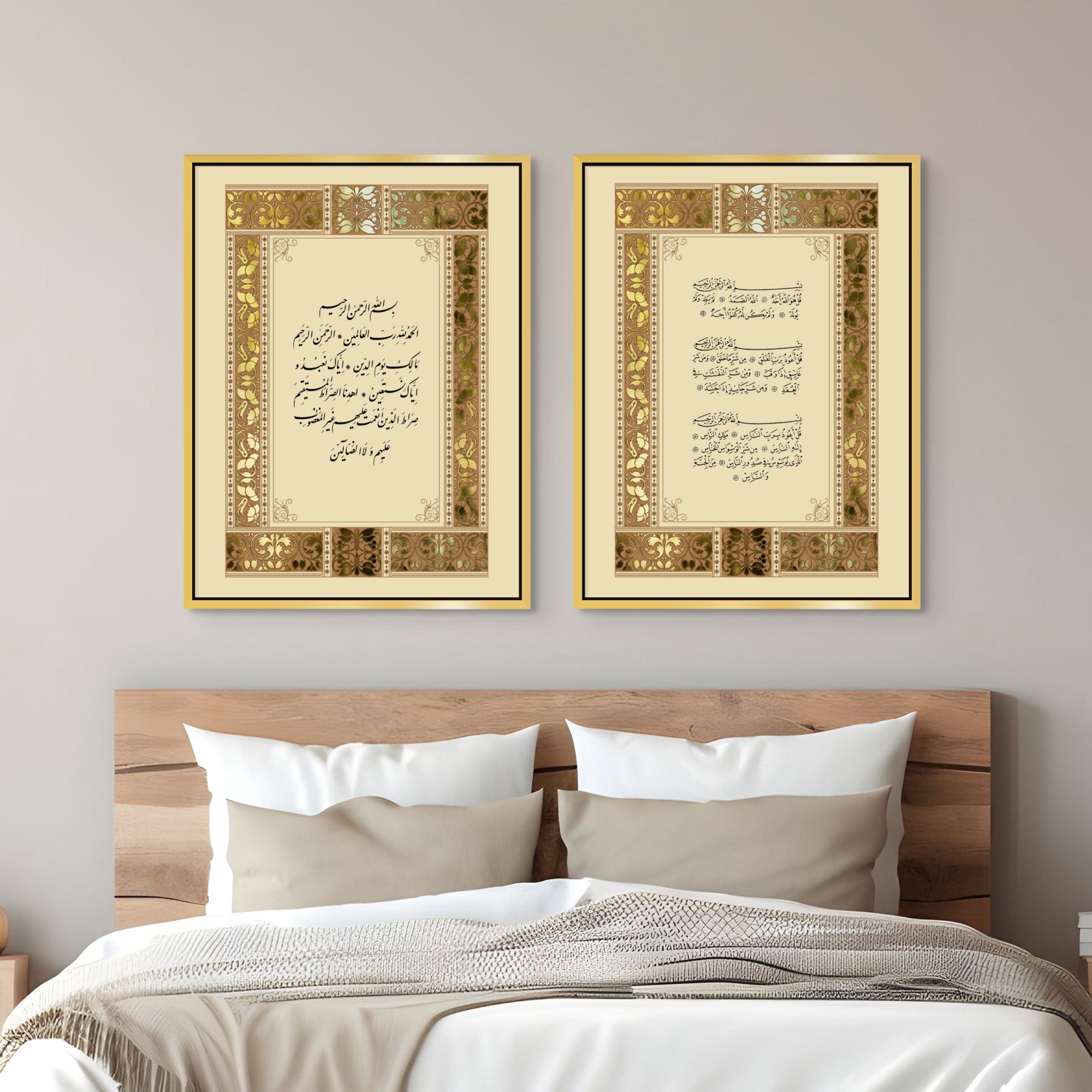This elegant set features Surah Al-Fatiha and the three Qul surahs in graceful Arabic script, framed with intricate traditional patterns. A spiritually grounded pair perfect for prayer rooms, bedrooms, living rooms, entryways, or above a reading nook.
