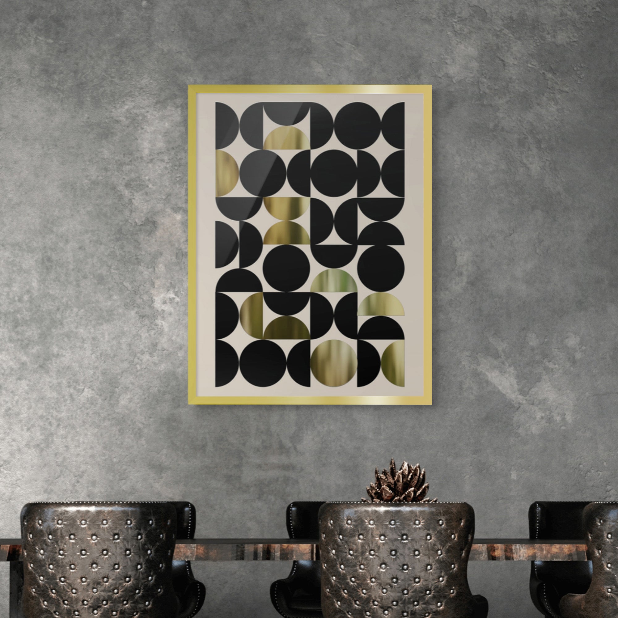 Celebrate form and structure with Golden Bauhaus, a bold geometric composition brought to life with real gold foiling. This striking artwork channels Bauhaus minimalism through sharp contrasts, clean shapes, and luxe metallic accents—perfect for contemporary, design-forward interiors.