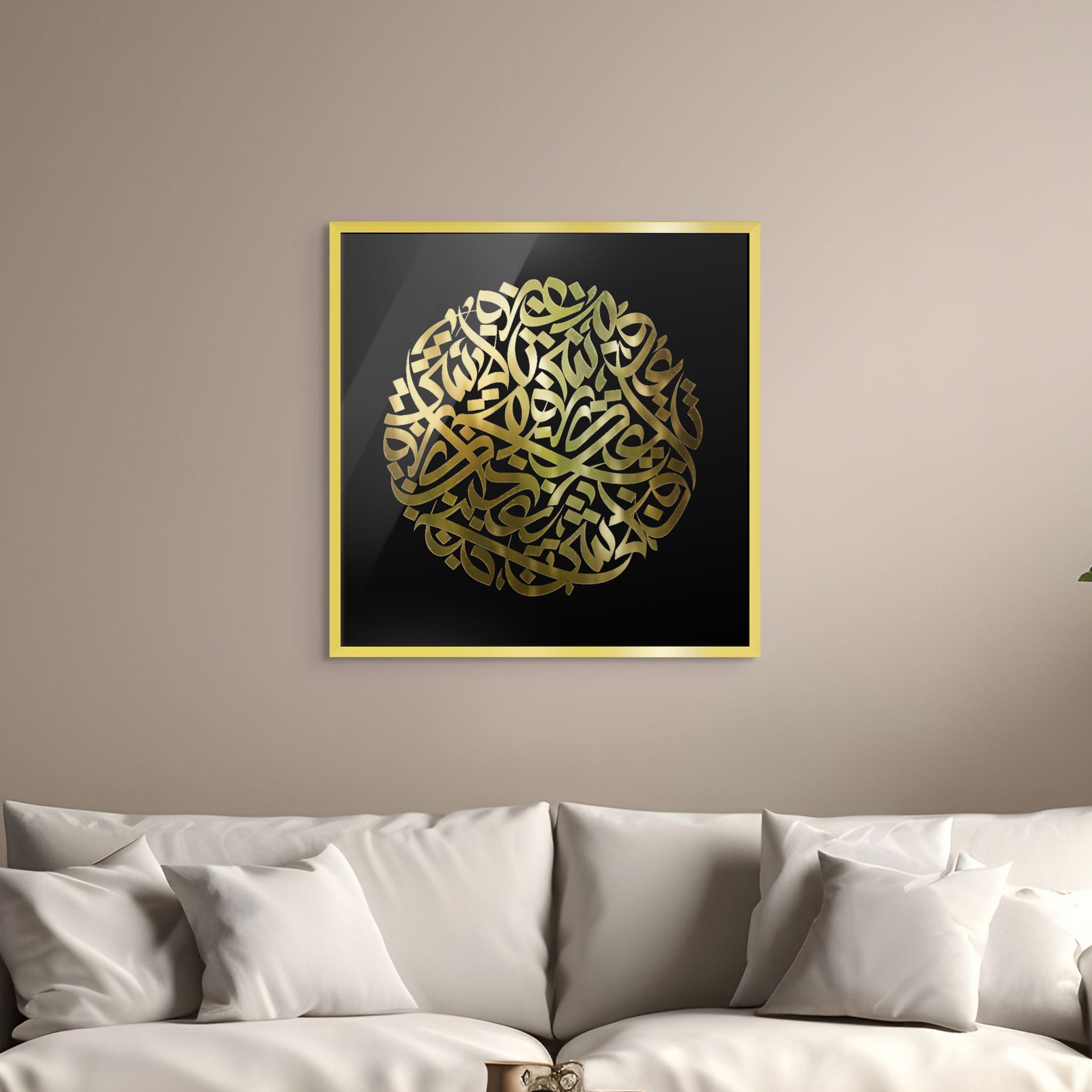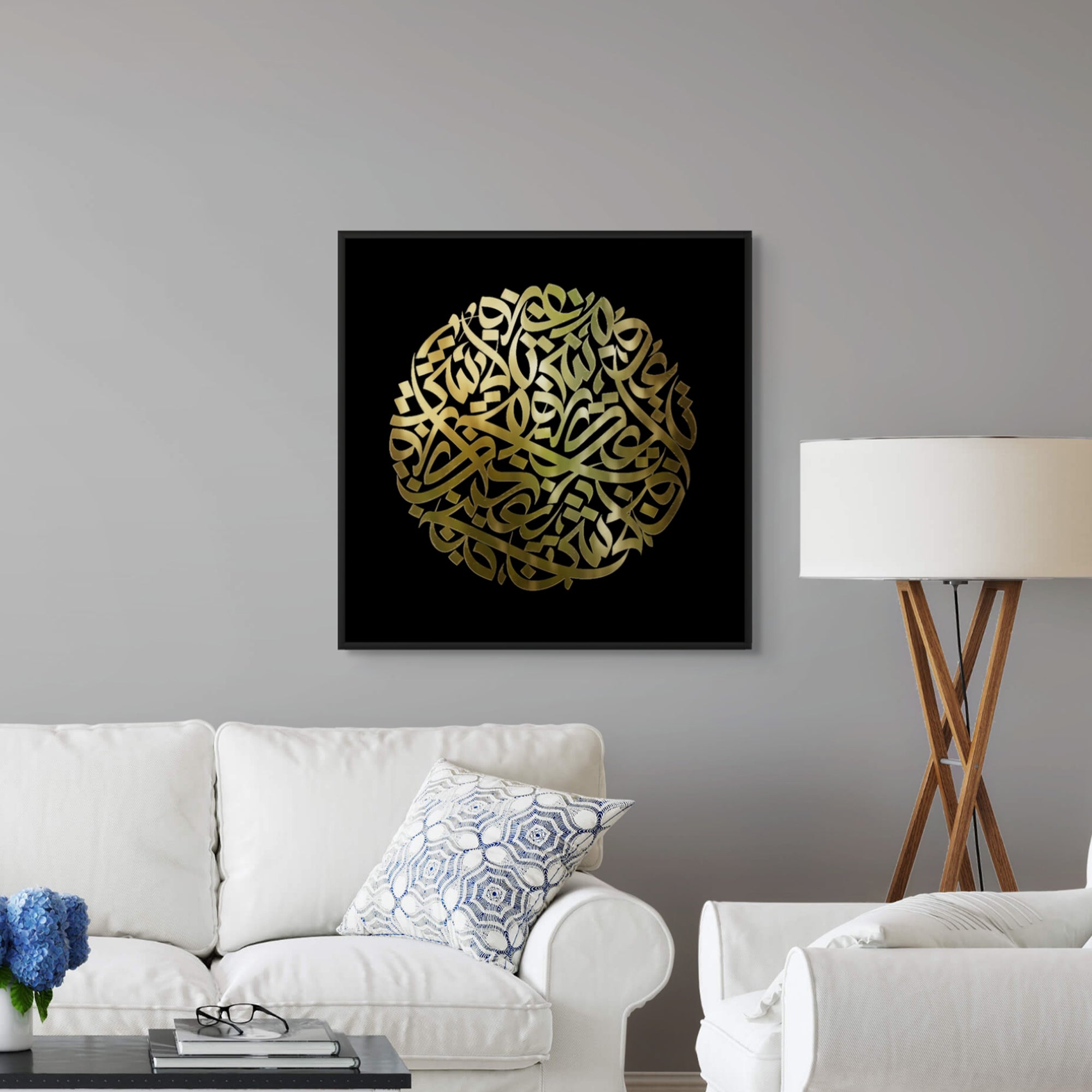 A bold panel of modern Arabic calligraphy bursts in black and white, intersected by a horizontal band of radiant gold. The artwork balance's structure and spontaneity in striking contrast. Ideal for monochrome, glam, or statement spaces.