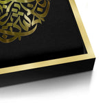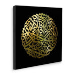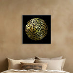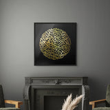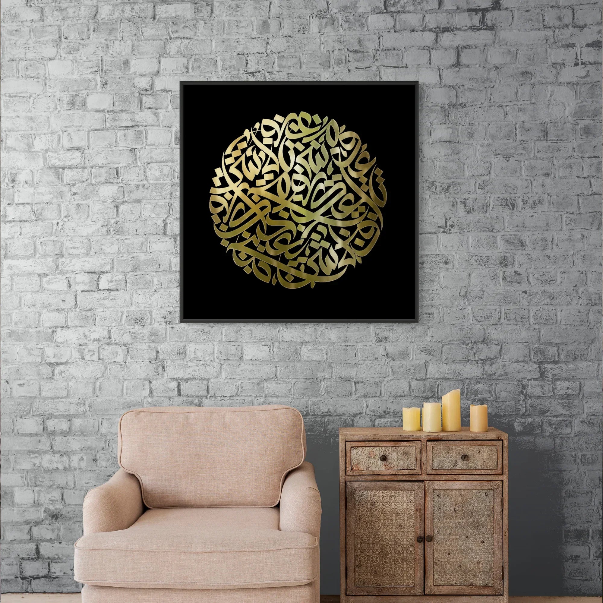 A bold panel of modern Arabic calligraphy bursts in black and white, intersected by a horizontal band of radiant gold. The artwork balance's structure and spontaneity in striking contrast. Ideal for monochrome, glam, or statement spaces.