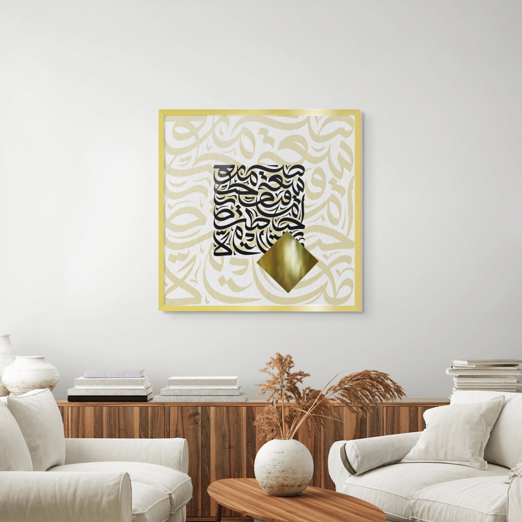 A striking fusion of modern form and calligraphic abstraction. Dense black Arabic strokes rest inside a rhythmic golden diamond, wrapped in a soft script-laced backdrop. This artwork speaks serenity through structure.
