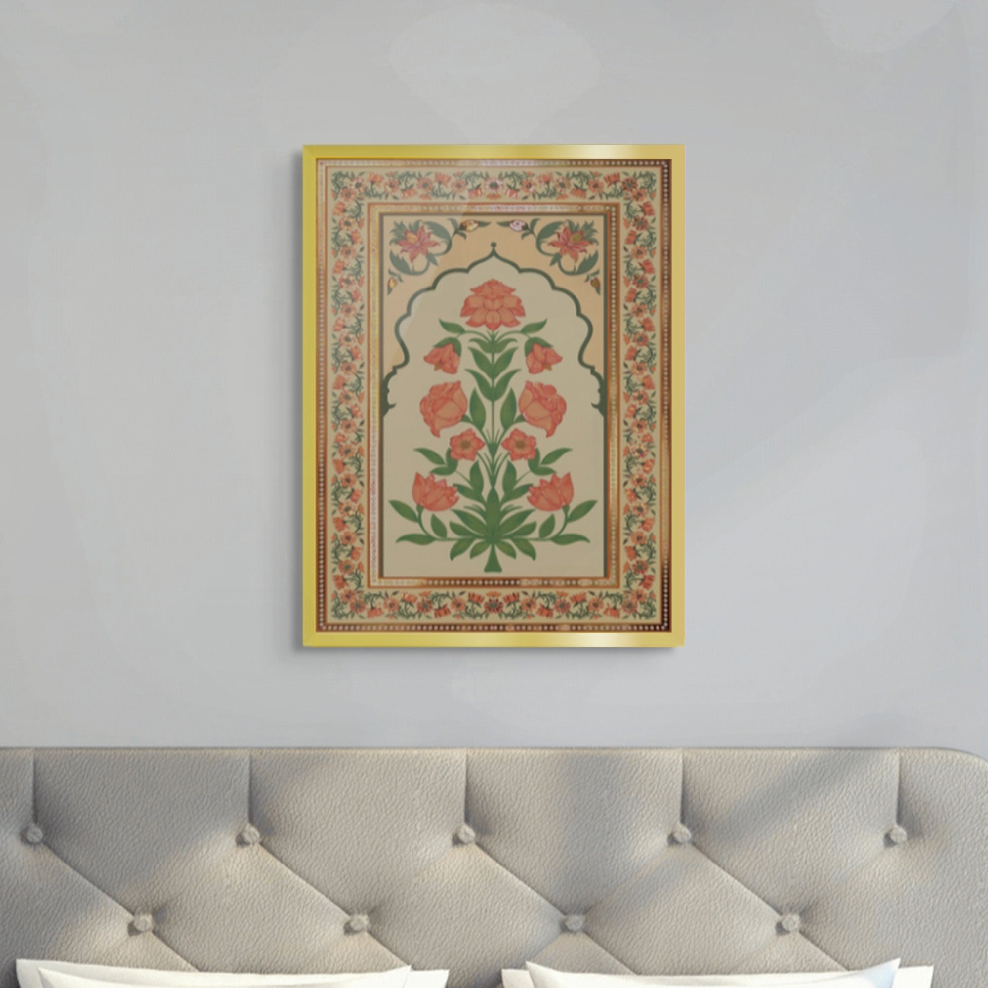 Meaning “spring blossom,” Gulbahaar is a celebration of renewal and Mughal florals. This arch-framed artwork features peach-toned flowers with green foliage and gold accents—perfect for brightening living rooms, bedrooms, hallways, or dressing areas.