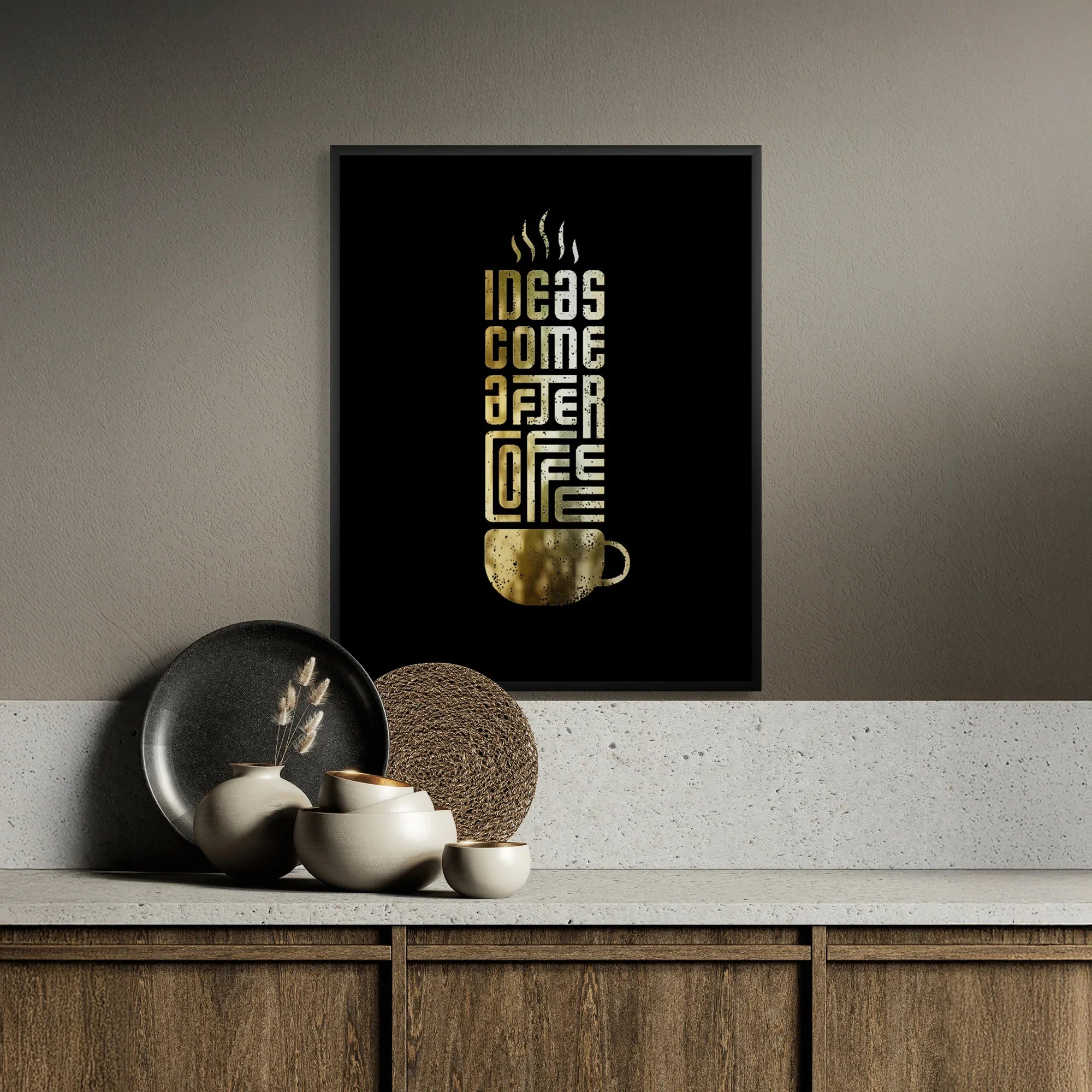 This artwork understands priorities. With distressed gold foiled type stacked into a coffee cup silhouette, it’s perfect for kitchens, studios, offices, or any space where caffeine comes first — and genius follows shortly after.