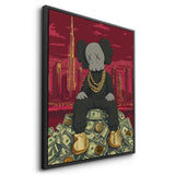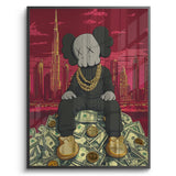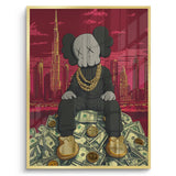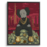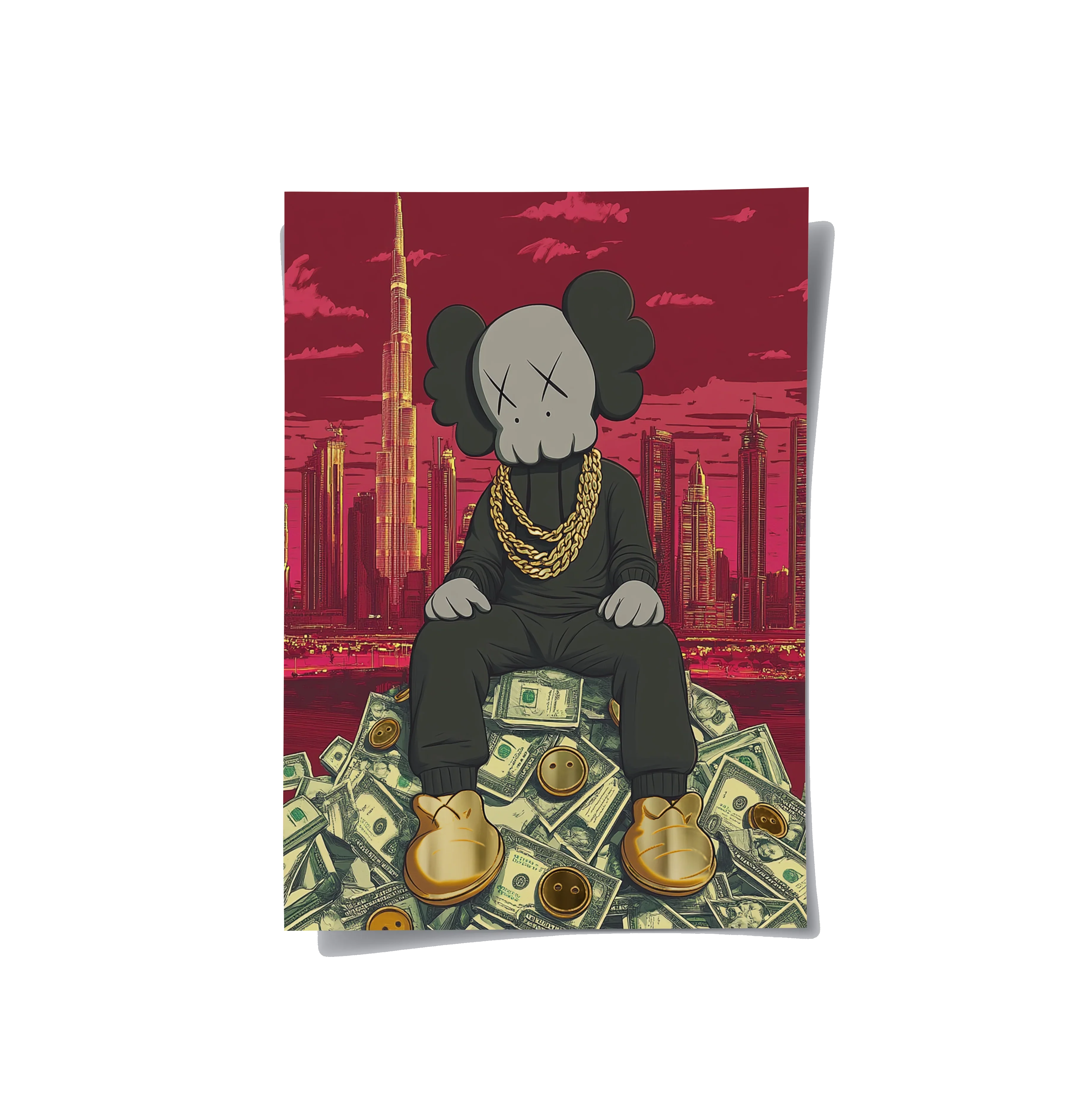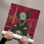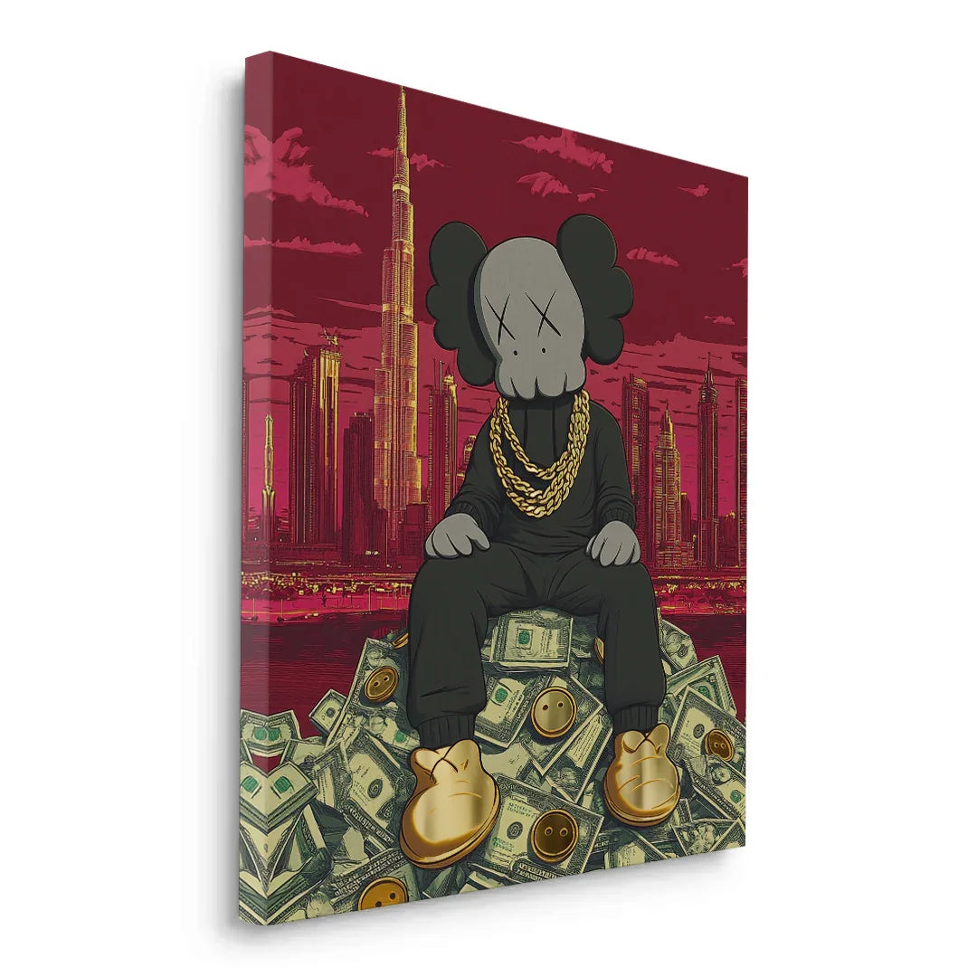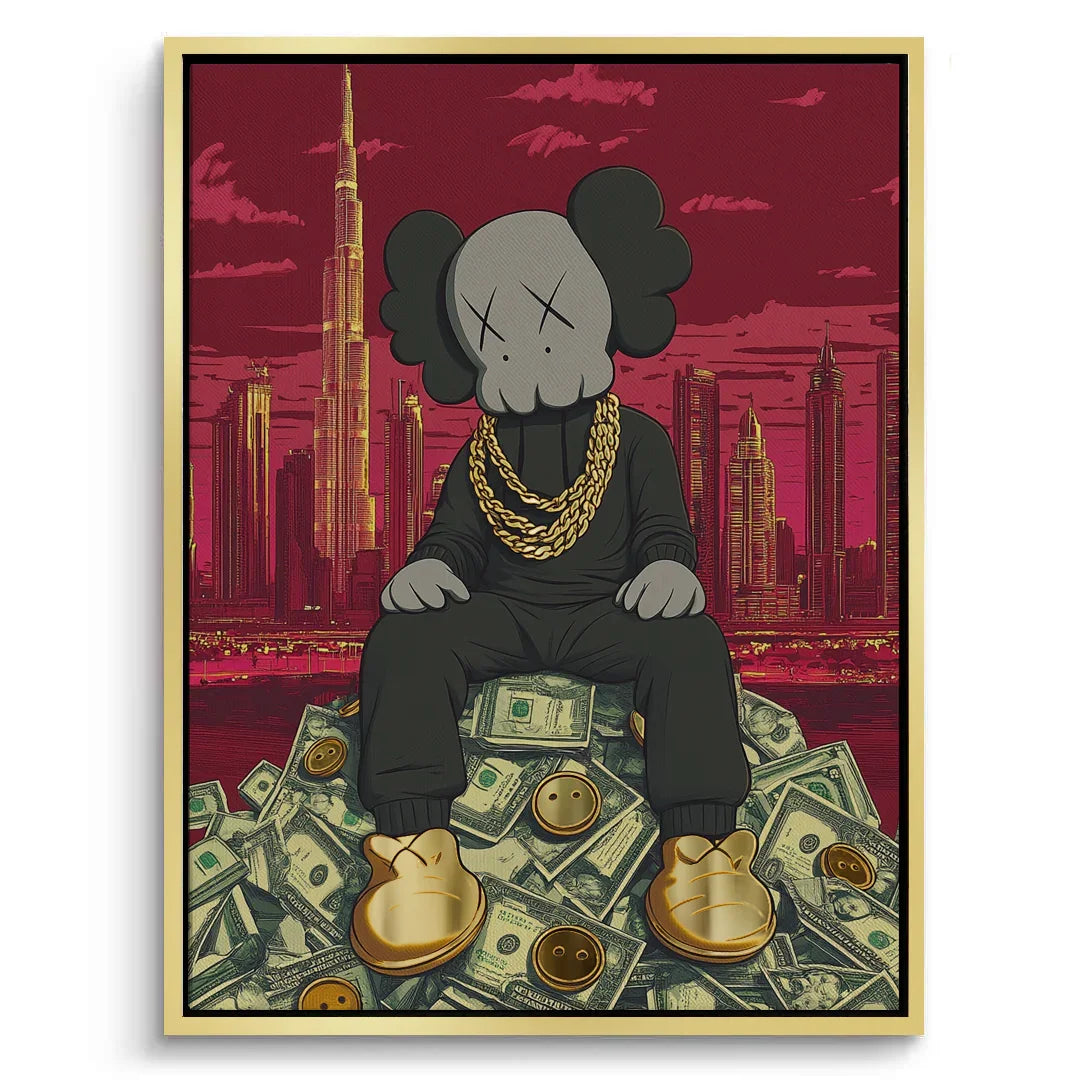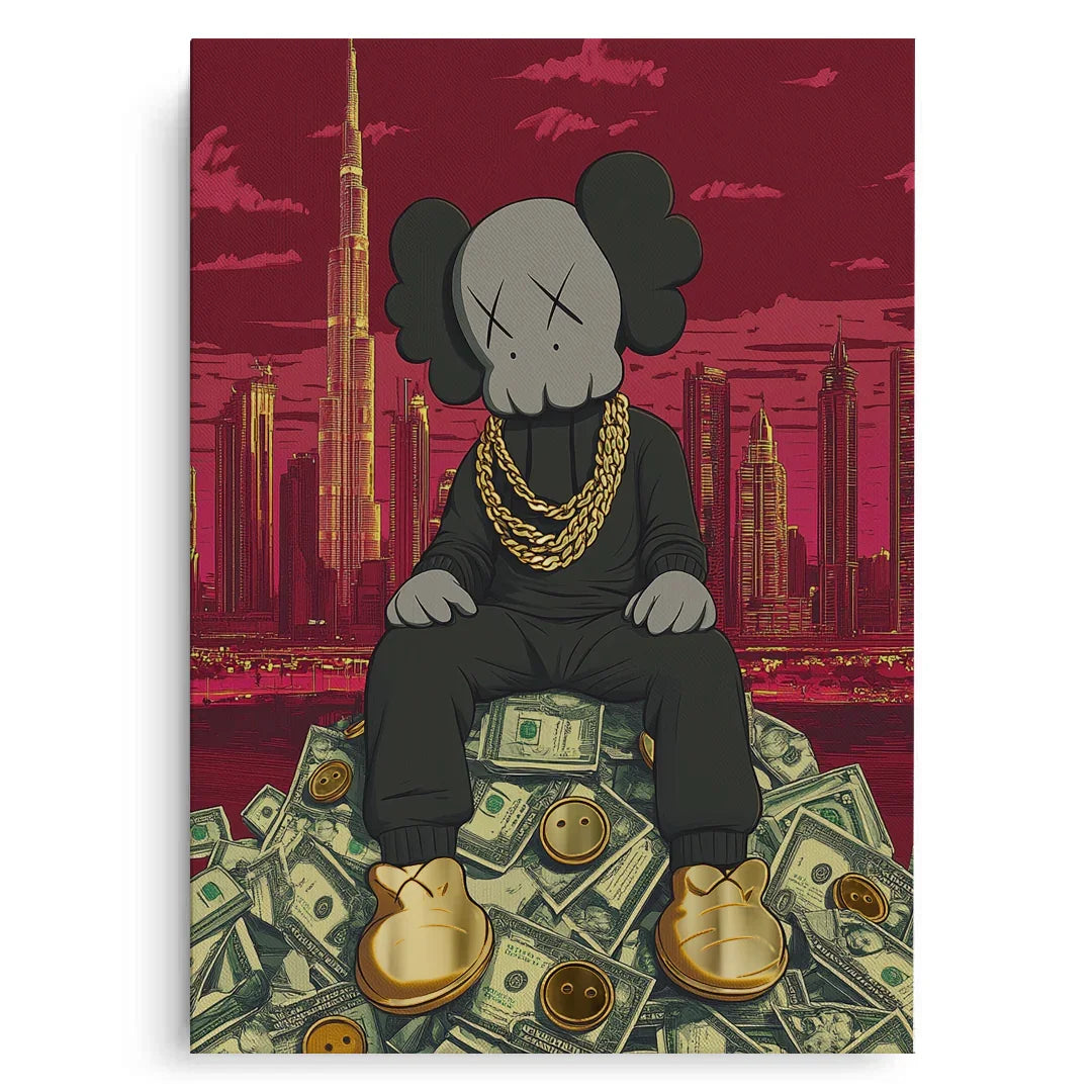 Kaws sits crowned atop a throne of dollars, with Dubai’s skyline and Burj Khalifa towering behind. A gold-foiled flex of wealth, ambition, and hustle—perfect for bold spaces, sneaker walls, or luxe contemporary collectors.