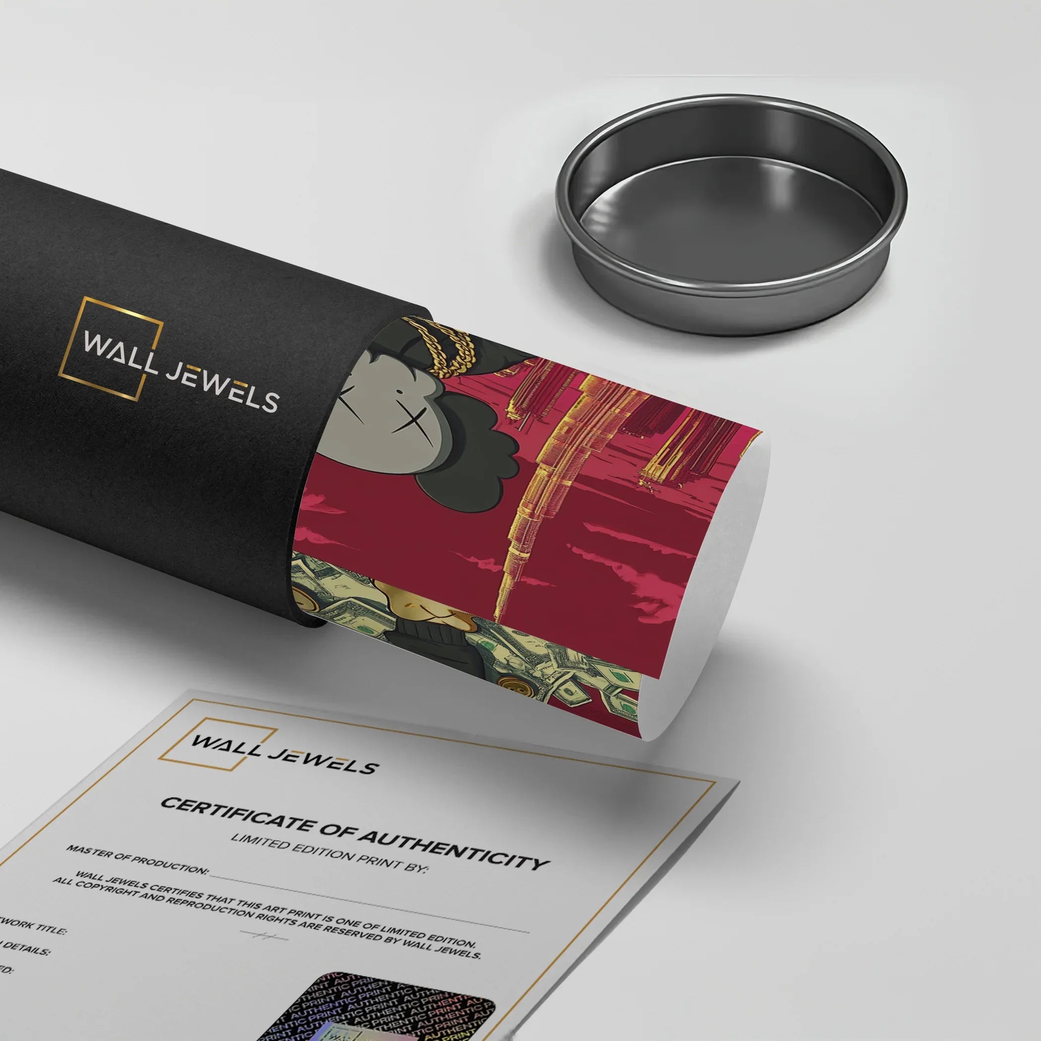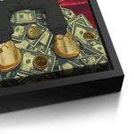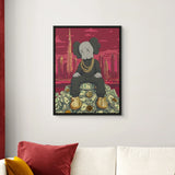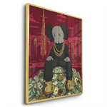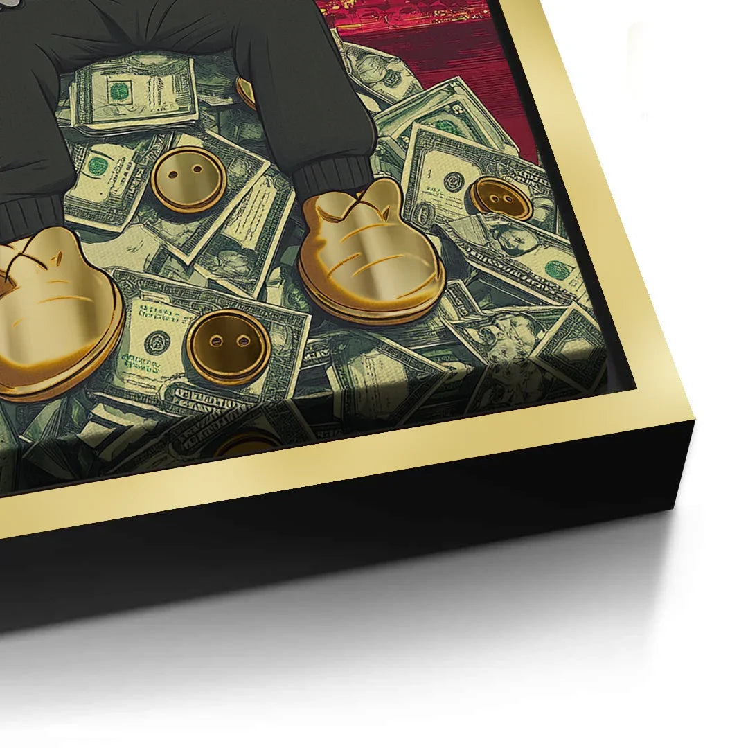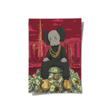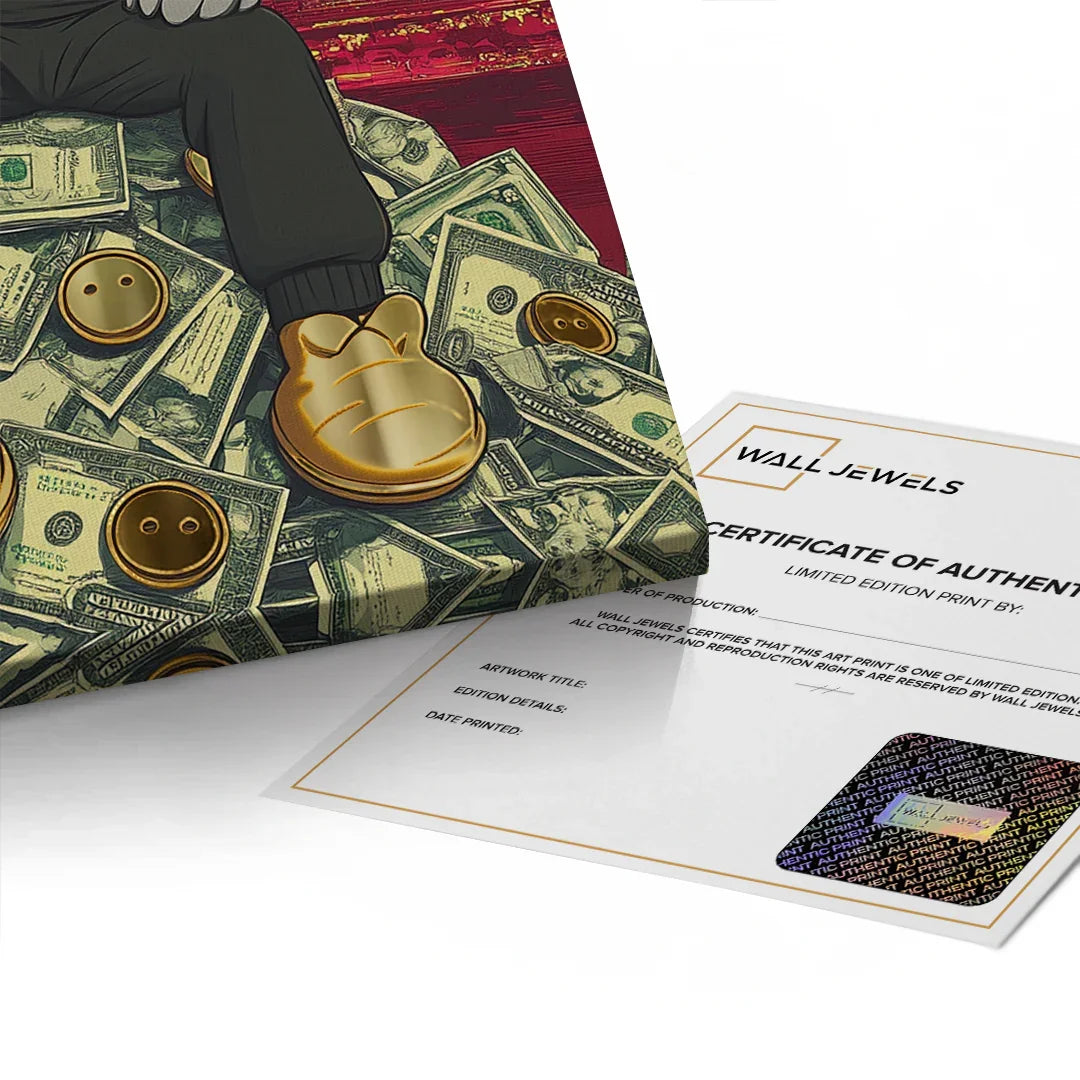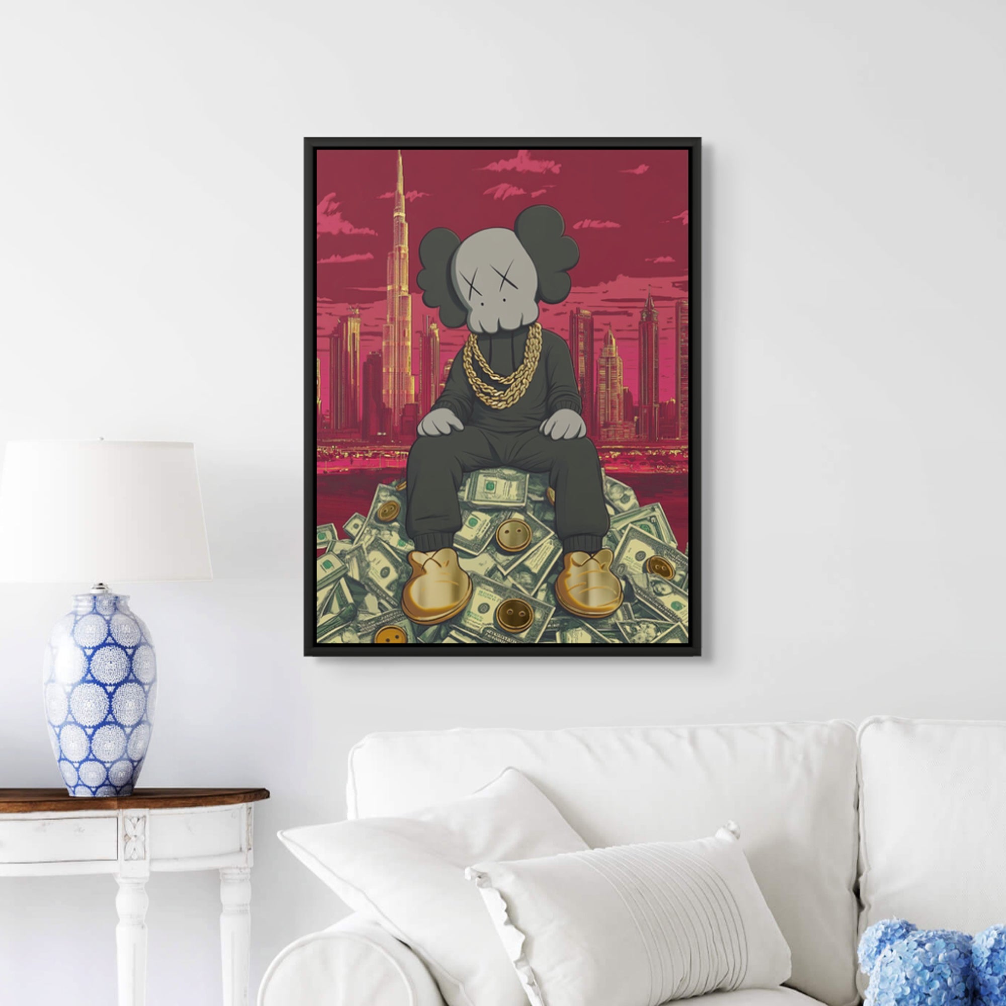 Kaws sits crowned atop a throne of dollars, with Dubai’s skyline and Burj Khalifa towering behind. A gold-foiled flex of wealth, ambition, and hustle—perfect for bold spaces, sneaker walls, or luxe contemporary collectors.
