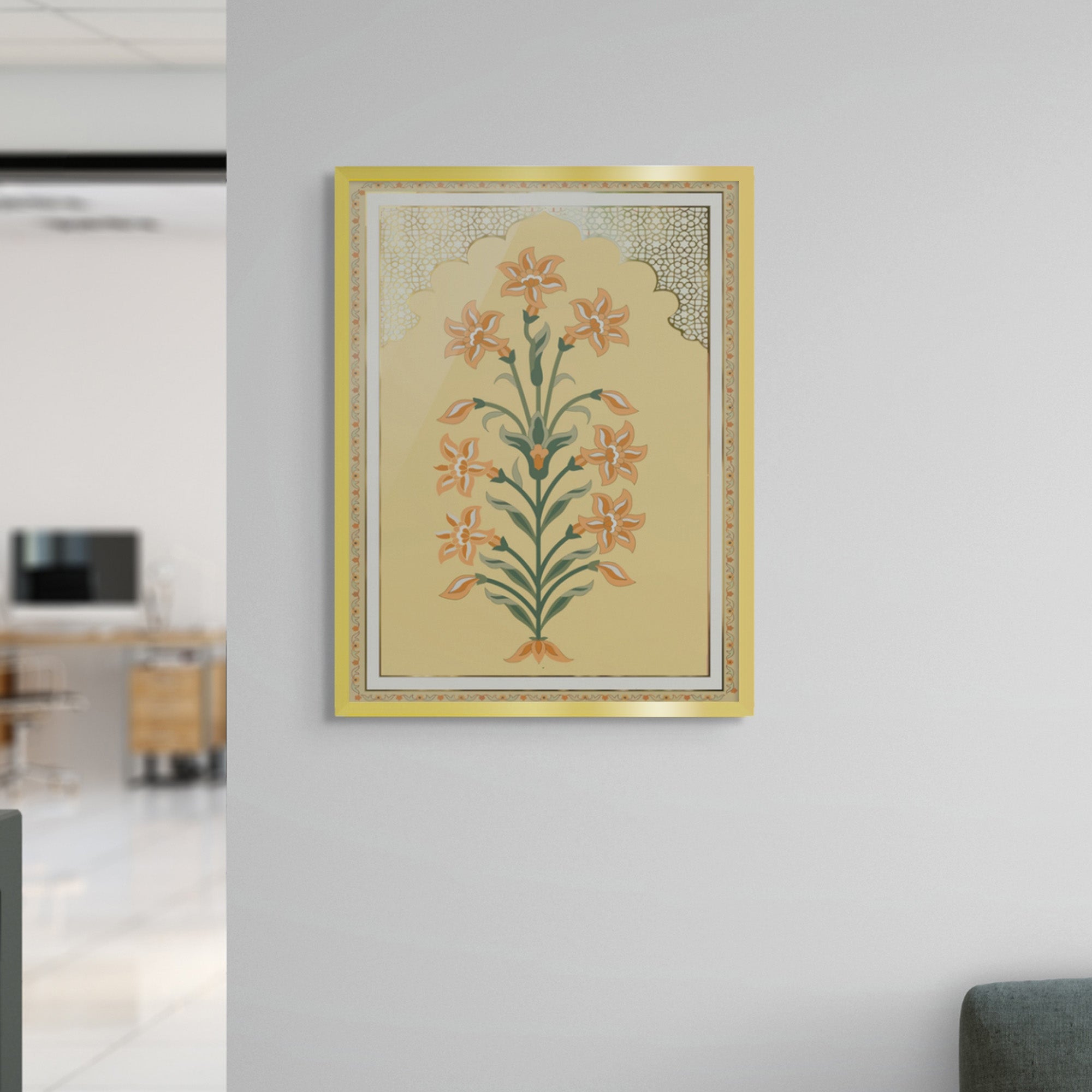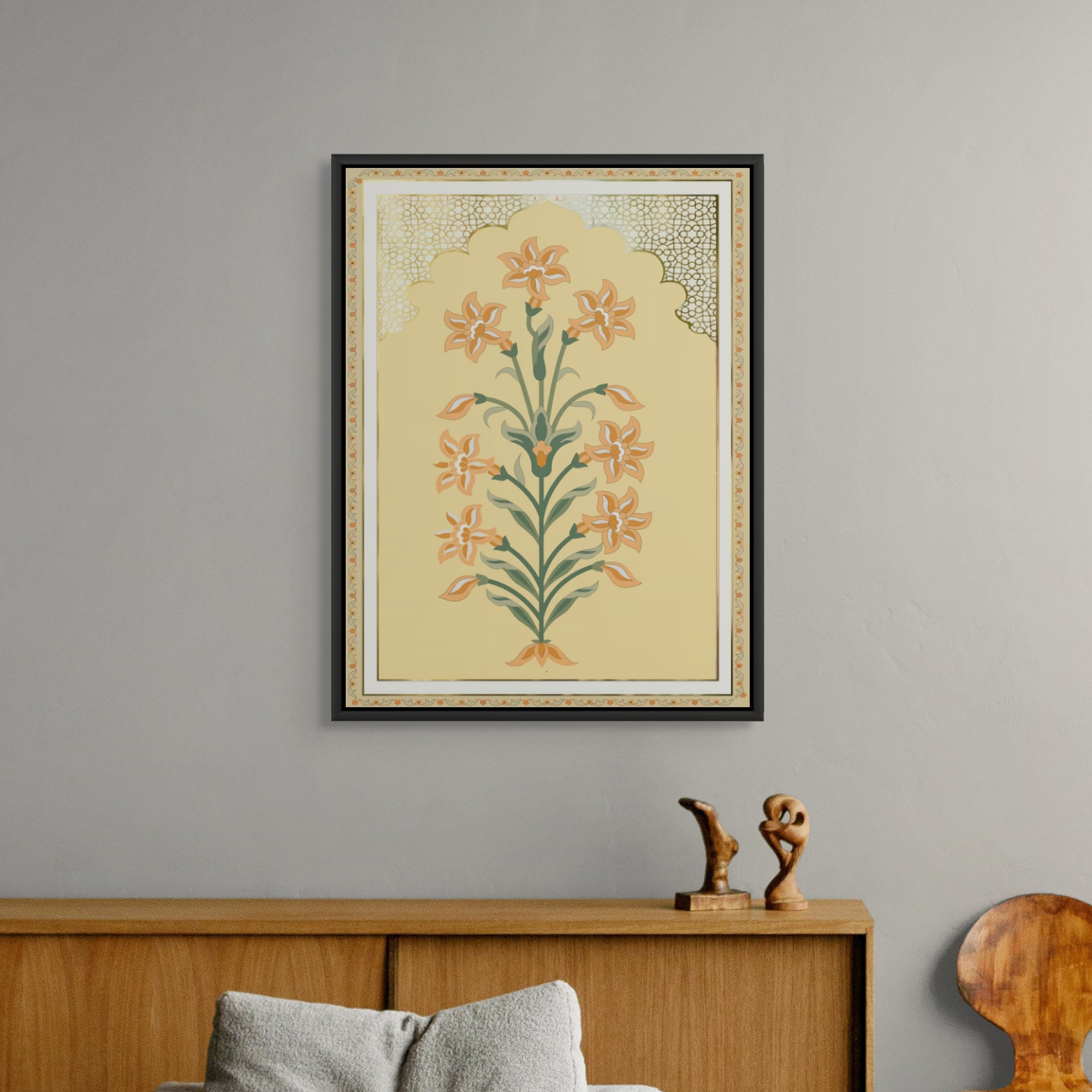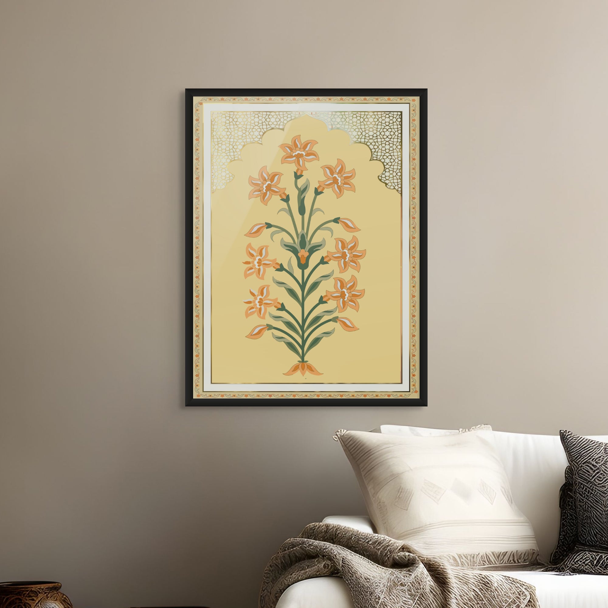 Inspired by the essence of saffron, Kesariya features gold foiled detailing and a graceful lily-like bloom glowing in rich yellow-orange tones. A warm, heritage piece ideal for bedrooms, reading corners, entryways, or thoughtfully styled living spaces.