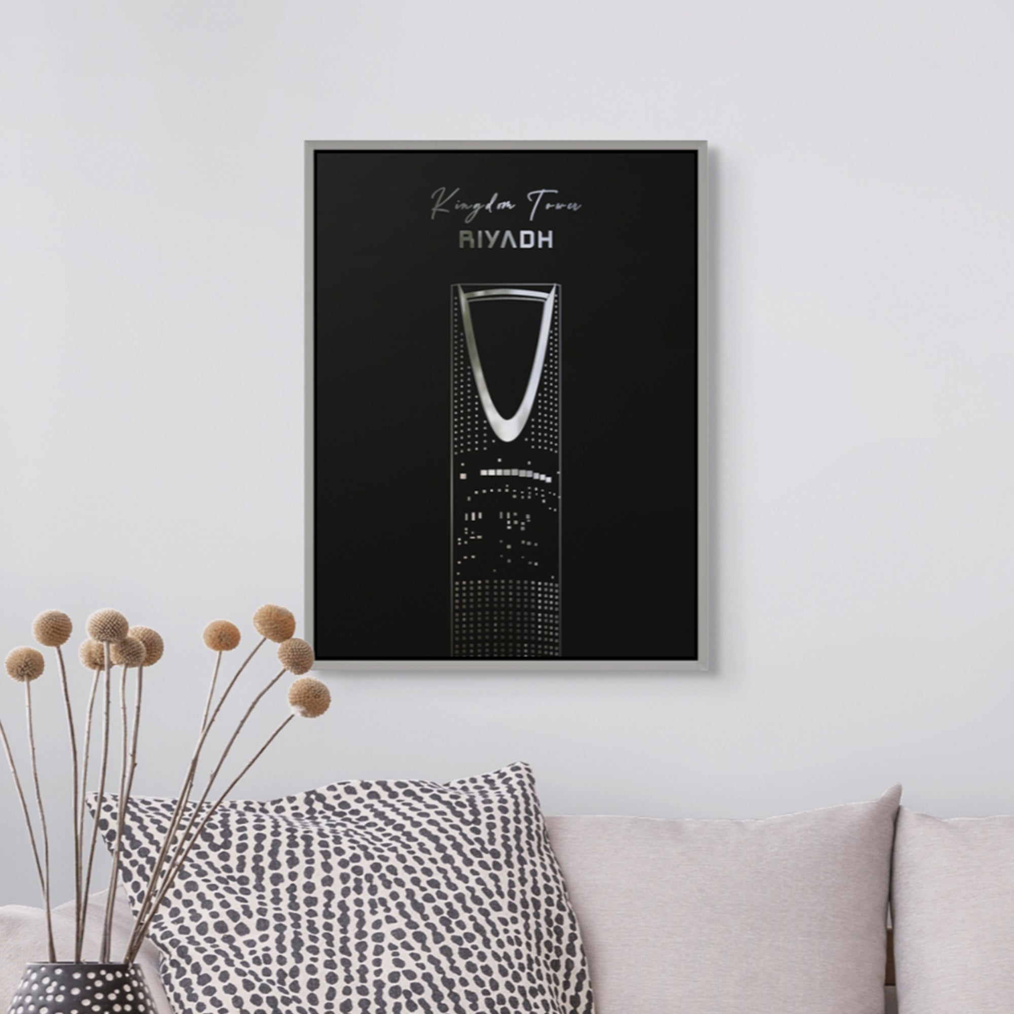 Featuring the renowned Kingdom Tower in silver foil, this artwork highlights Riyadh’s architectural brilliance. With its bold symmetry and luminous design, it enhances living rooms, offices, or contemporary spaces with a touch of Saudi sophistication.