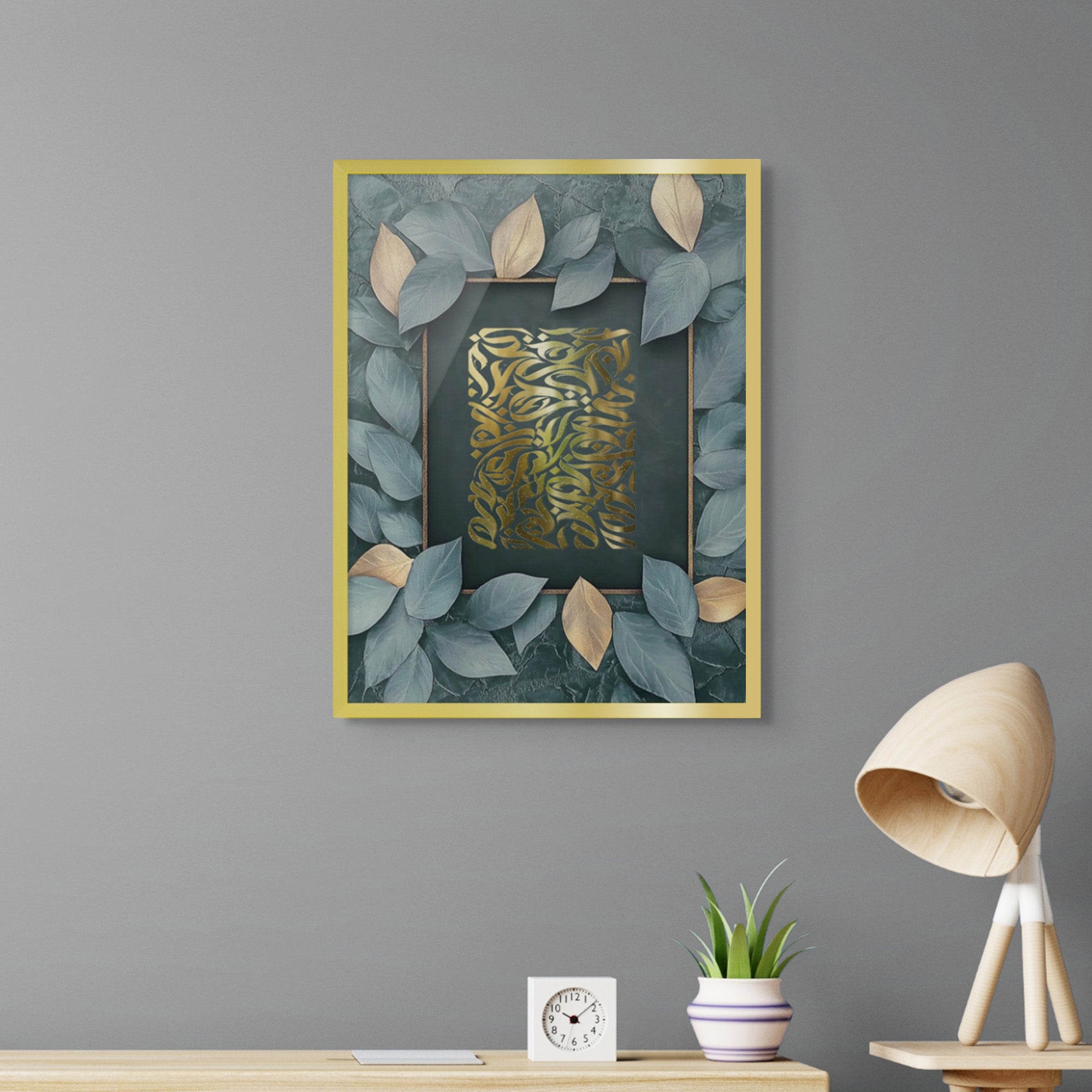 A lush composition where bold Arabic calligraphy in foiled gold is framed by textured sage greens and rich botanical forms. The interplay of elegance and nature adds poetic depth, ideal for modern foyers, offices, or hallways.