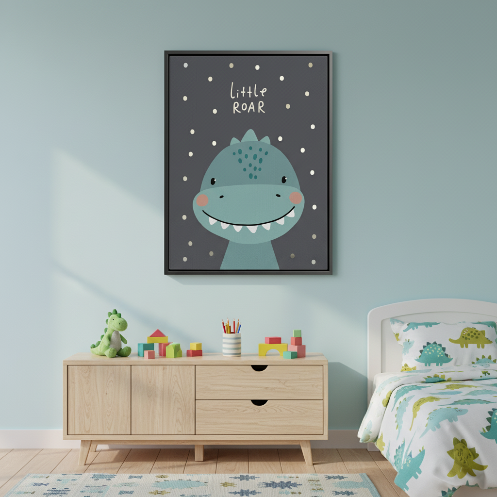 This adorable kids’ art features a happy blue dinosaur with silver-foiled text and dots that shimmer playfully. The cheerful design adds a fun prehistoric touch, perfect for brightening nurseries, playrooms, or animal lovers’ bedrooms.