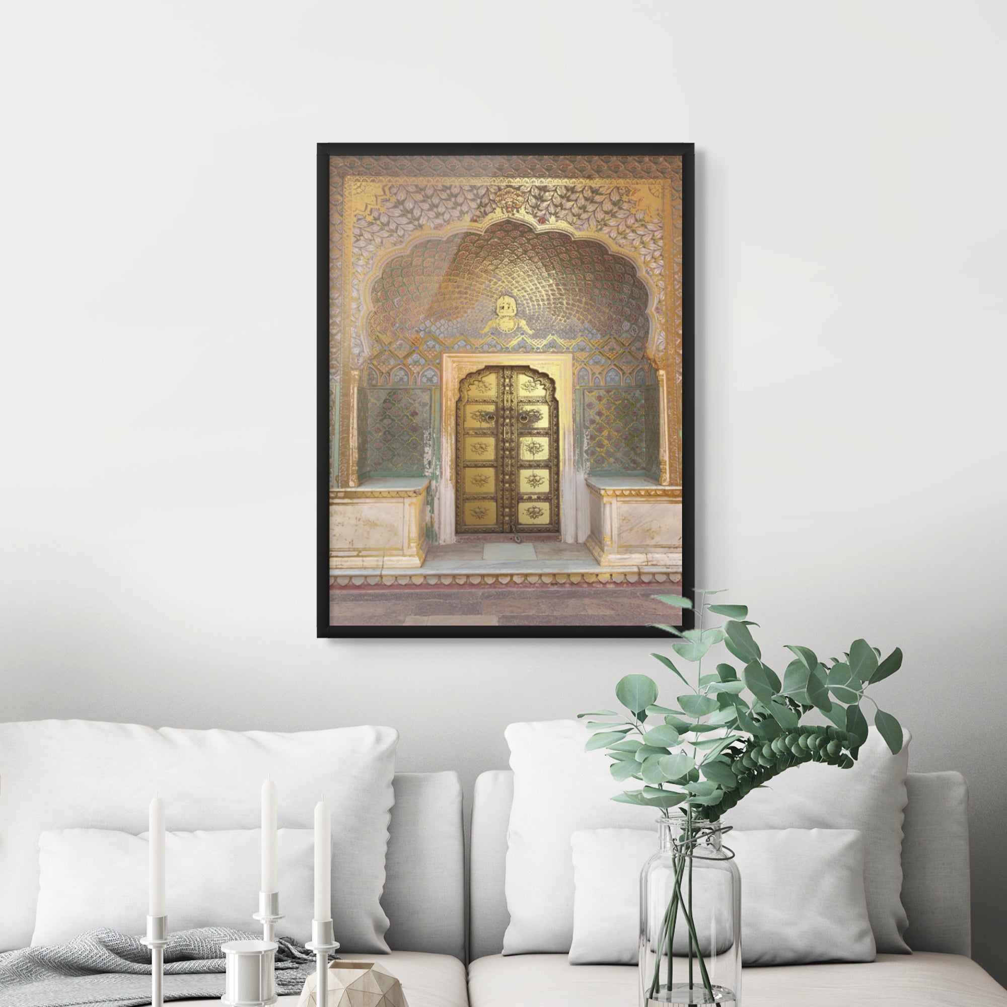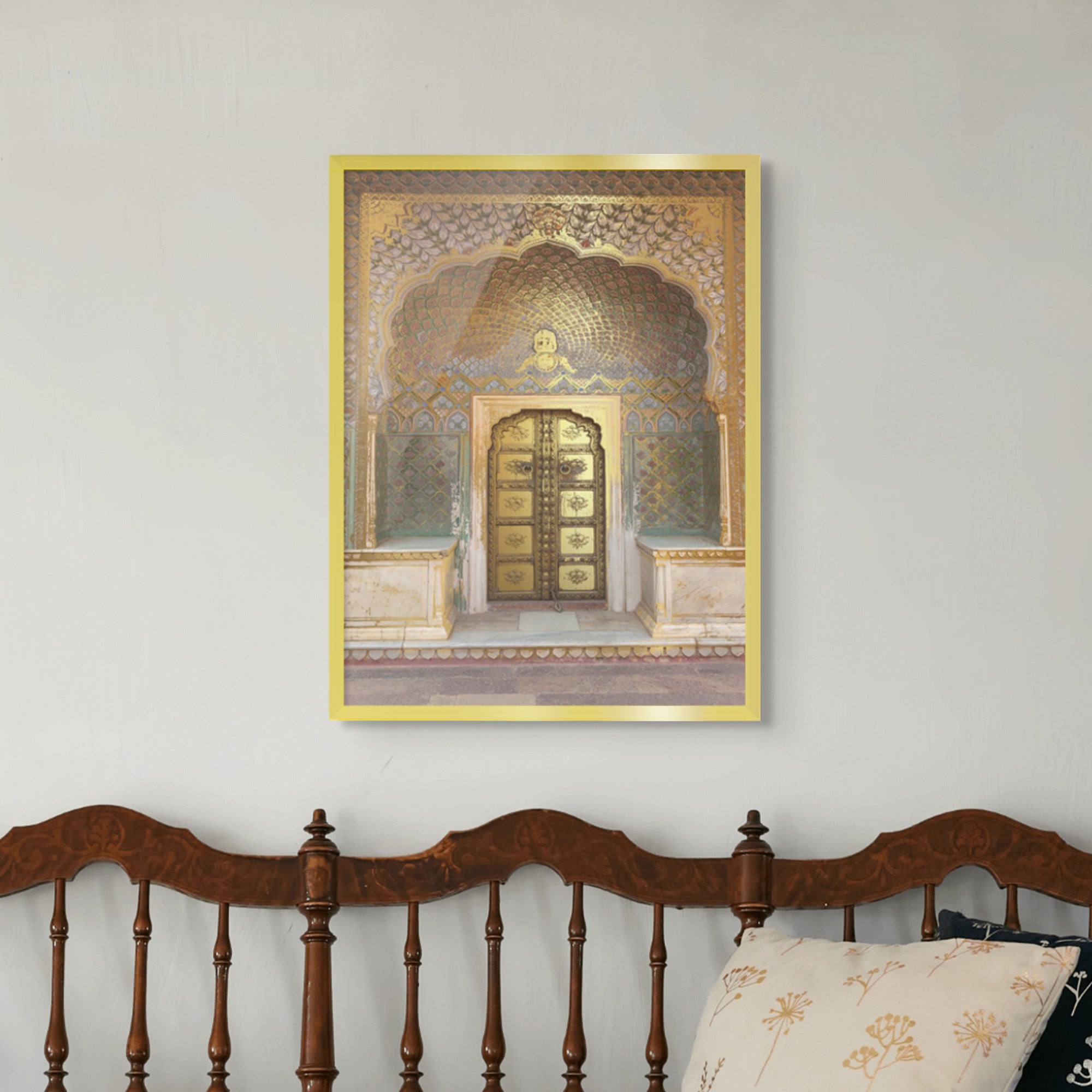 A tribute to winter, this artwork echoes Rajasthani palace decor, with floral patterns and radiant gold foiling. Known as The Rose Gate or Peepal Gate, it reflects Jaipur’s rose-pink charm. Perfect for hallways, entryways, or intimate spaces.