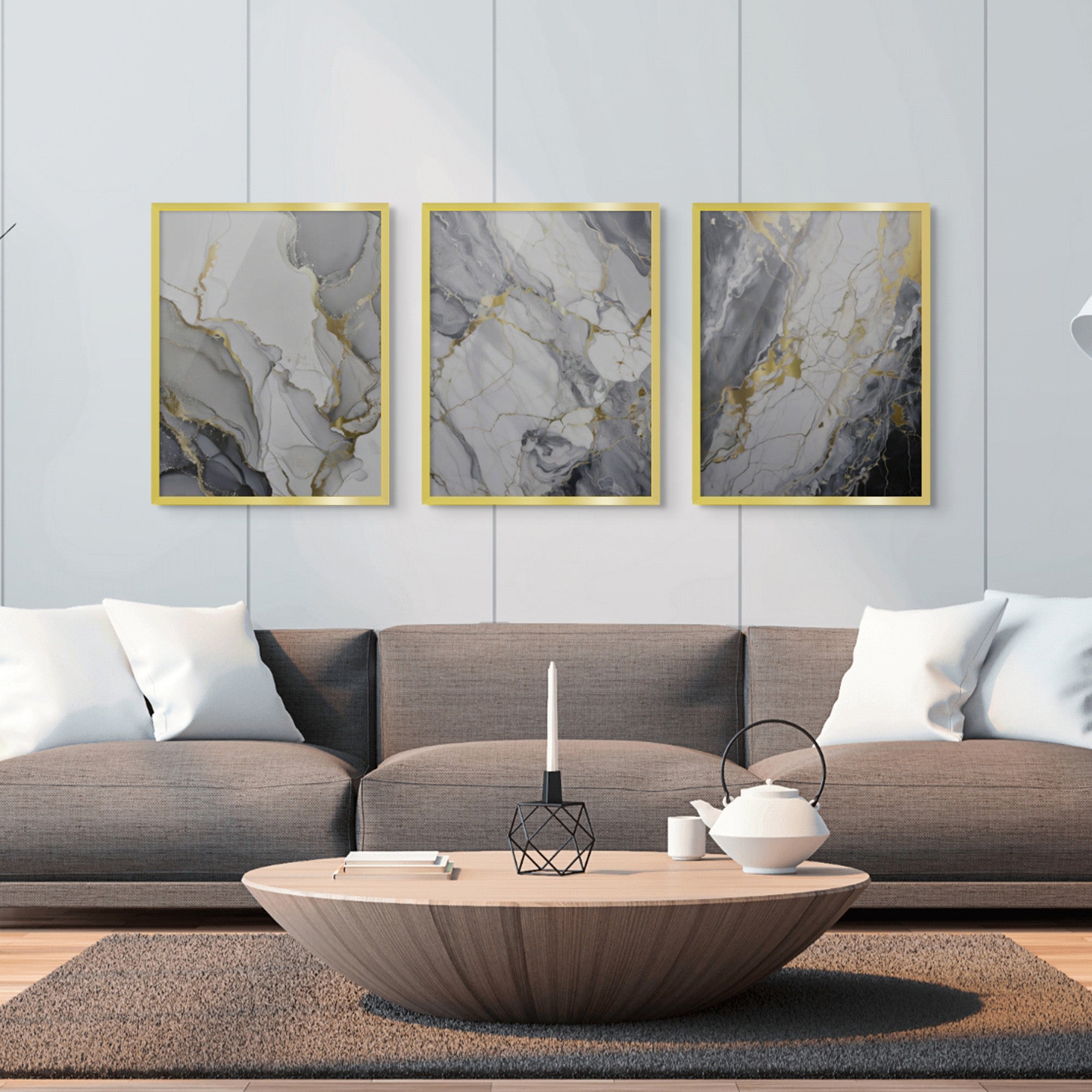 This striking marble-inspired trio features swirling grey tones and brilliant gold veining.