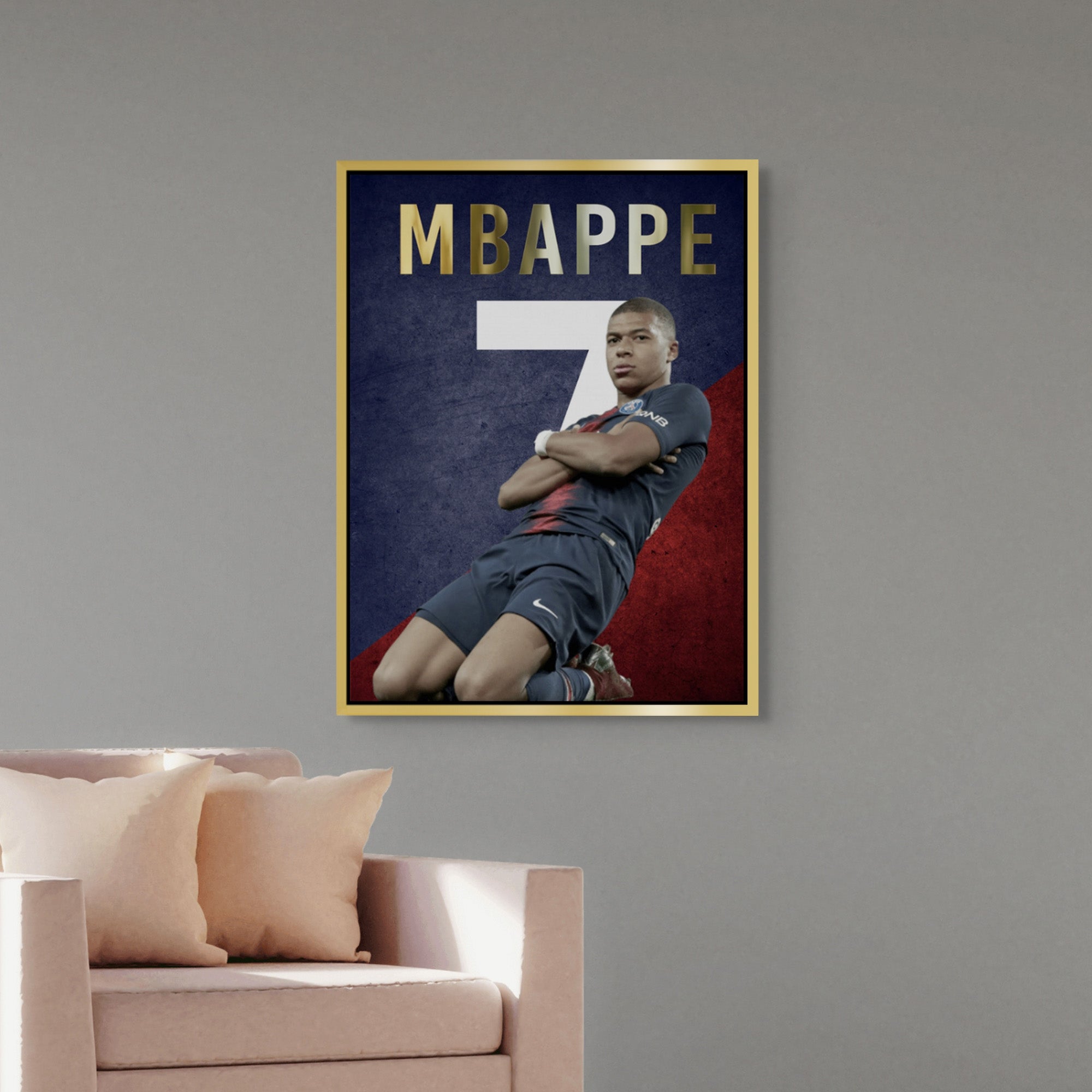 Kylian Mbappé’s iconic celebration takes center stage in this bold, high-impact design. Finished with premium gold foiling, this artwork makes a statement in gaming setups, bedrooms, home gyms, or any modern sports-themed space.