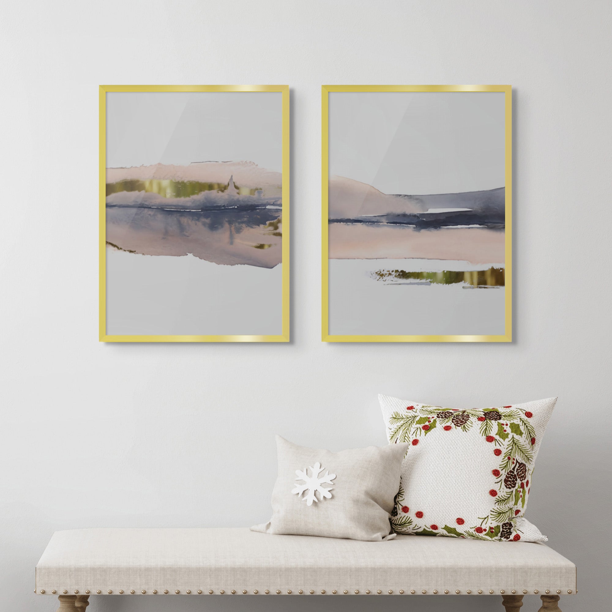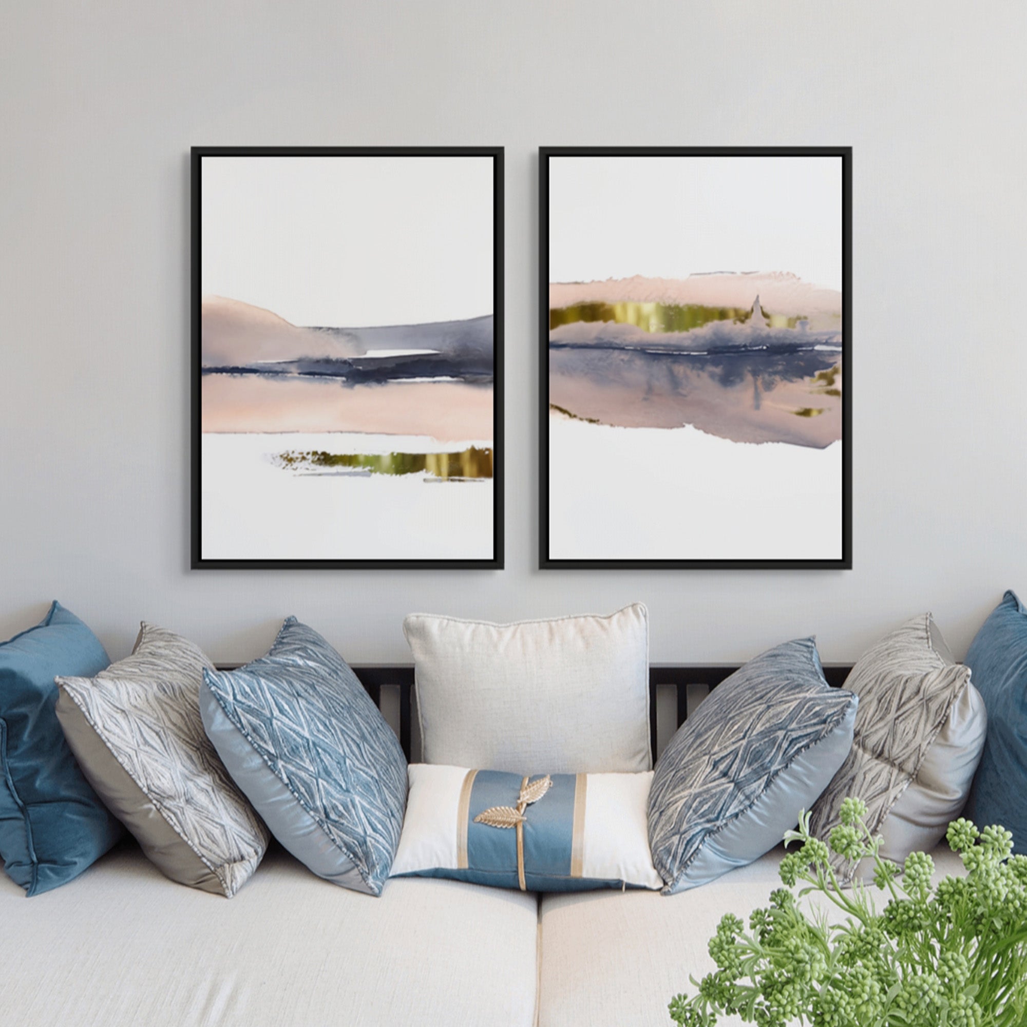 This striking abstract set pairs deep inky blues with blush undertones and metallic gold details. Ideal for modern living rooms, hallways, or creative offices, it adds a bold yet balanced statement to contemporary interiors.