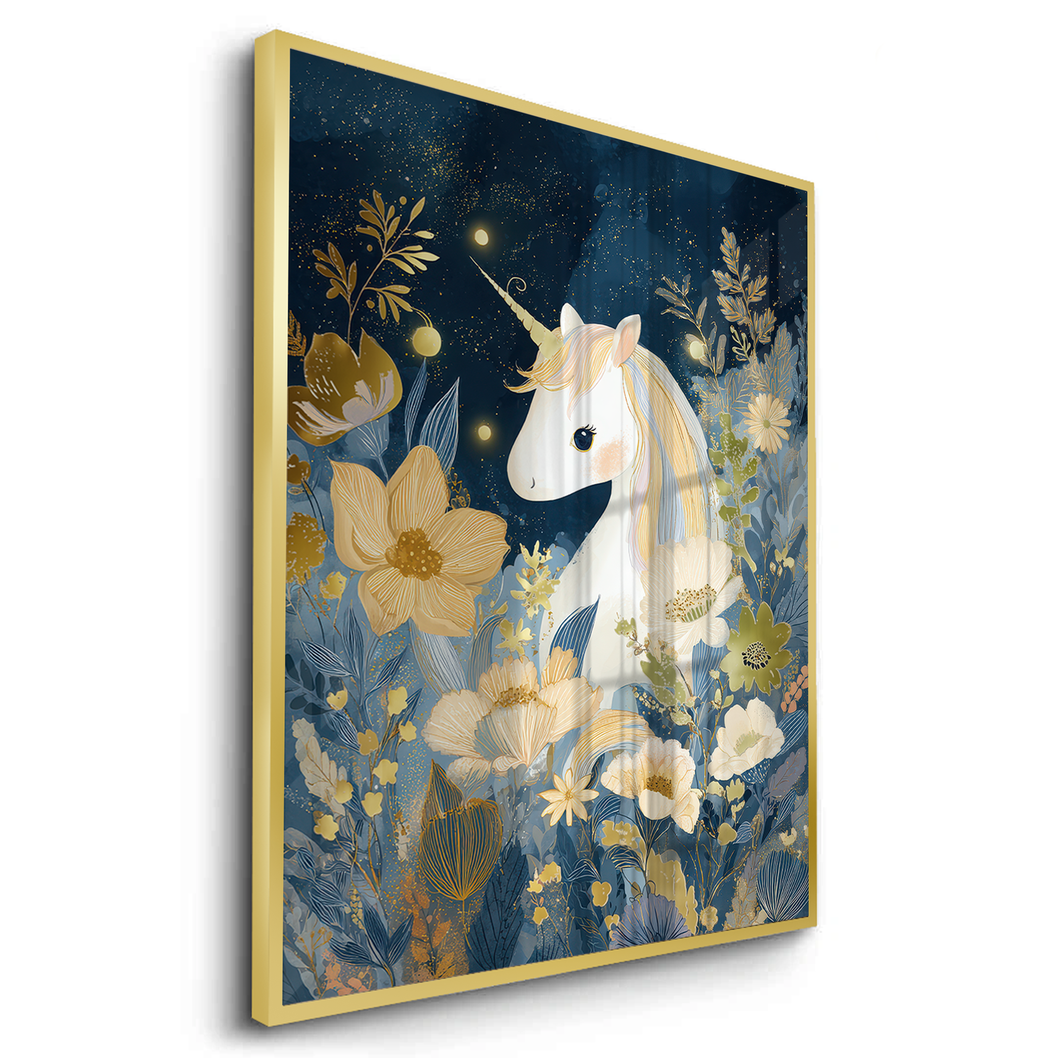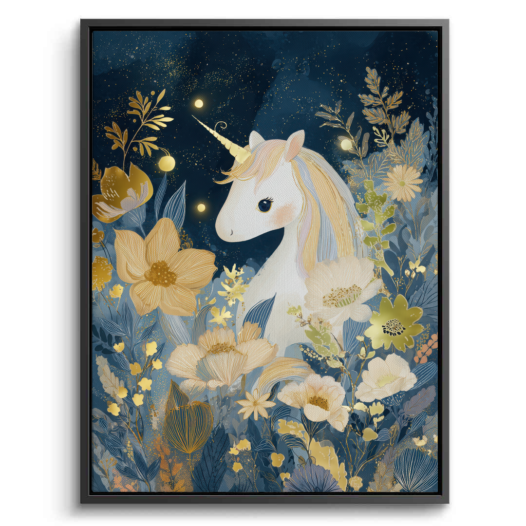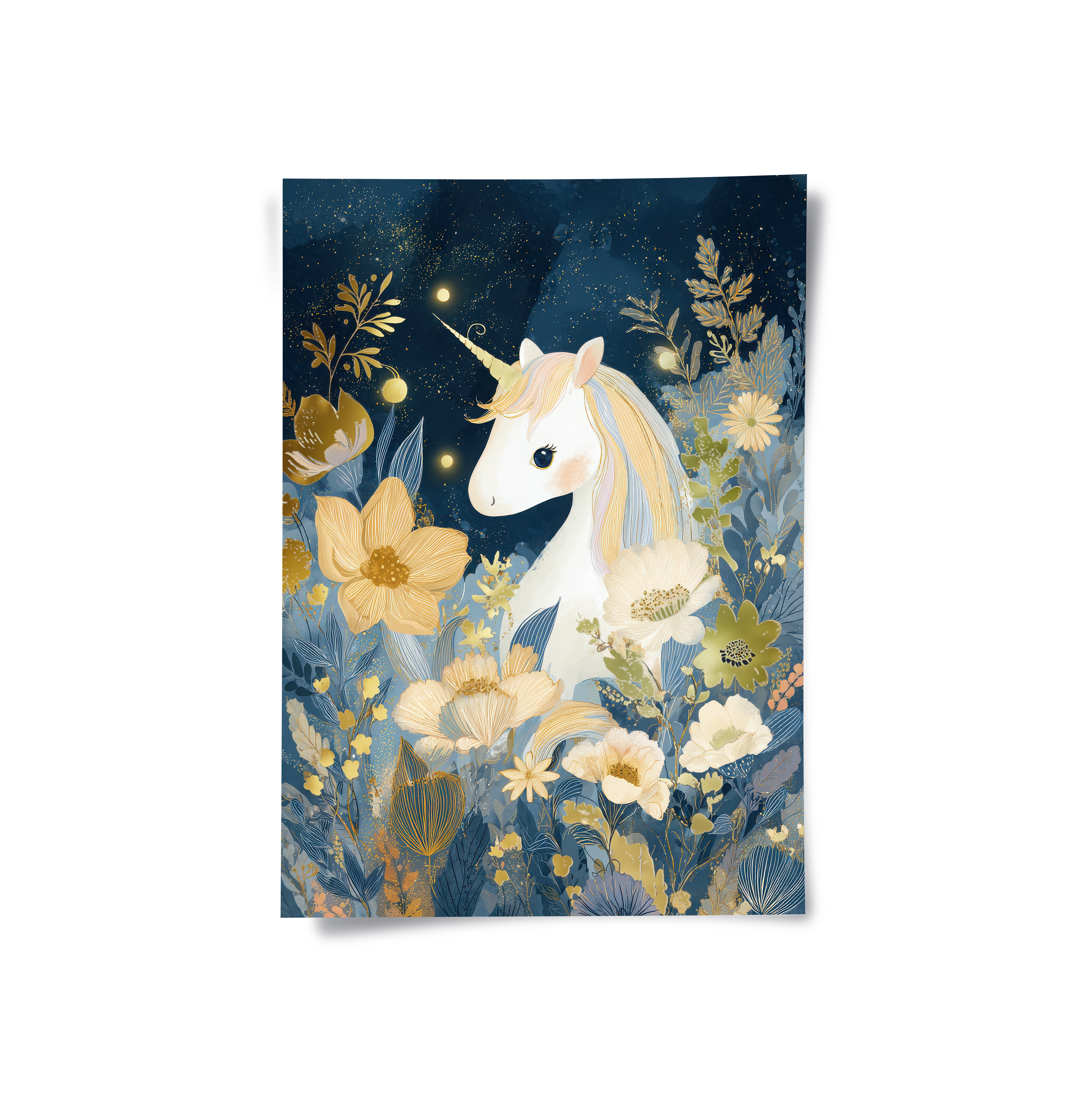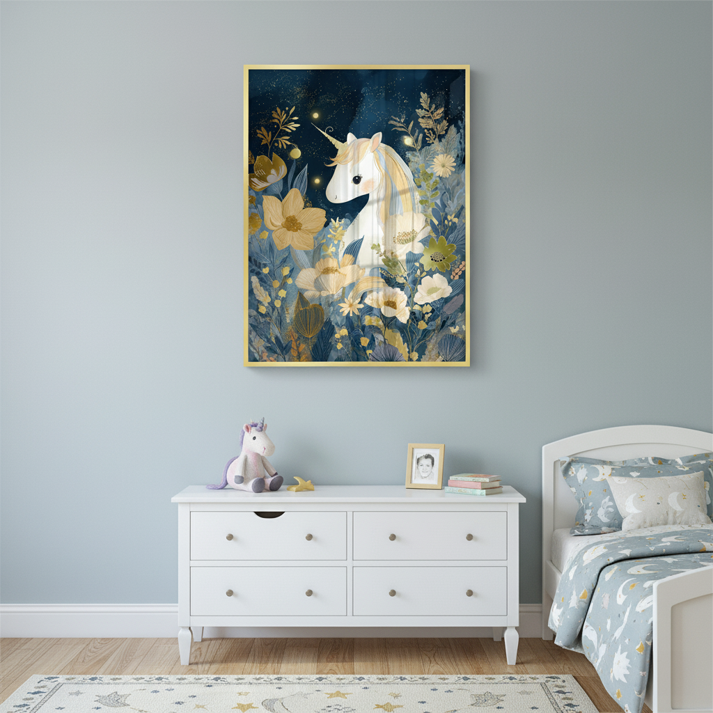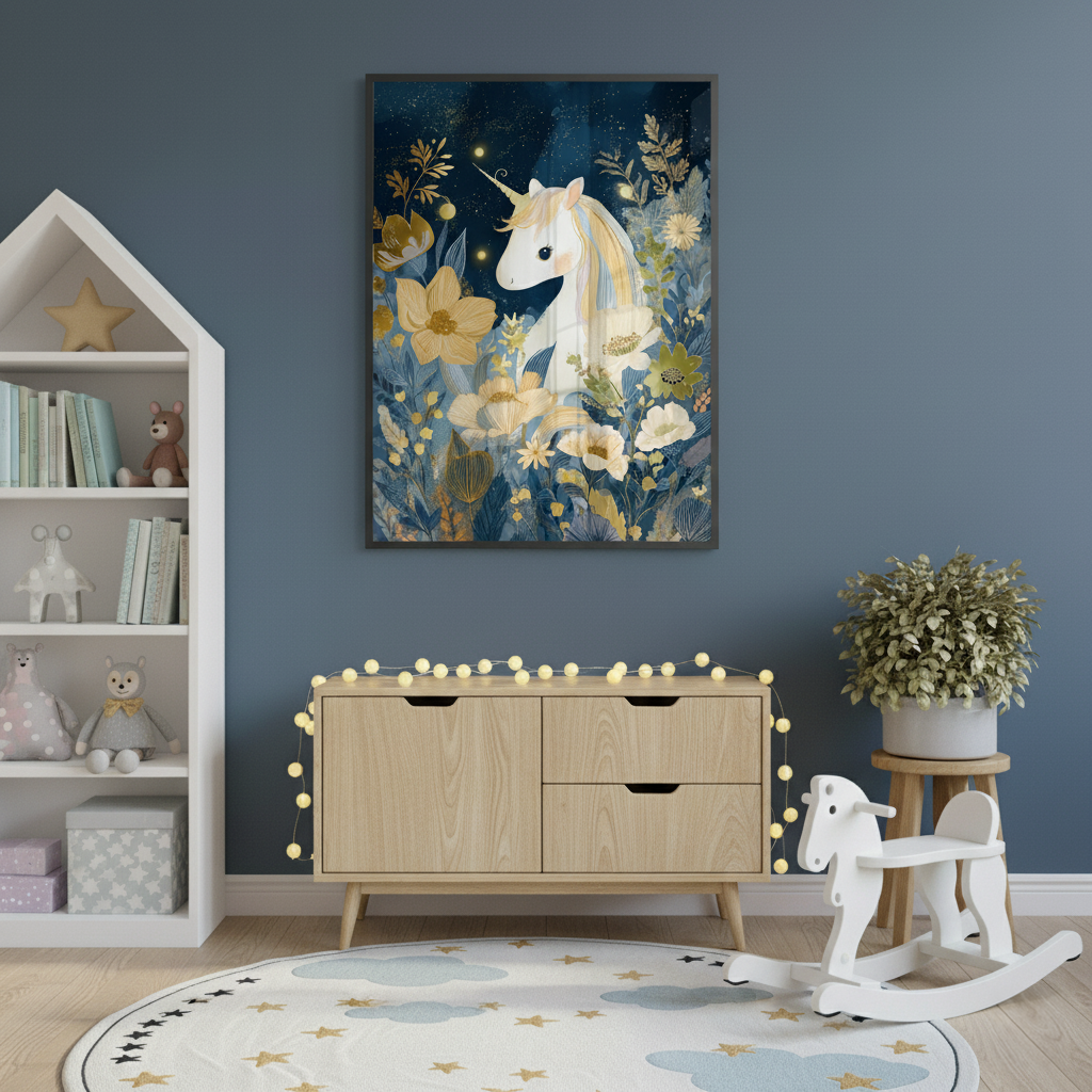 This elegant gold foiled kids’ art piece features a gentle unicorn surrounded by glowing flowers under a starlit sky. With rich night hues and shimmering foil accents, it adds warmth, calm, and magic to children’s spaces.