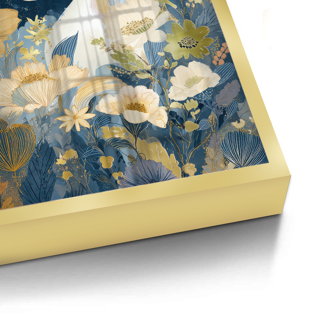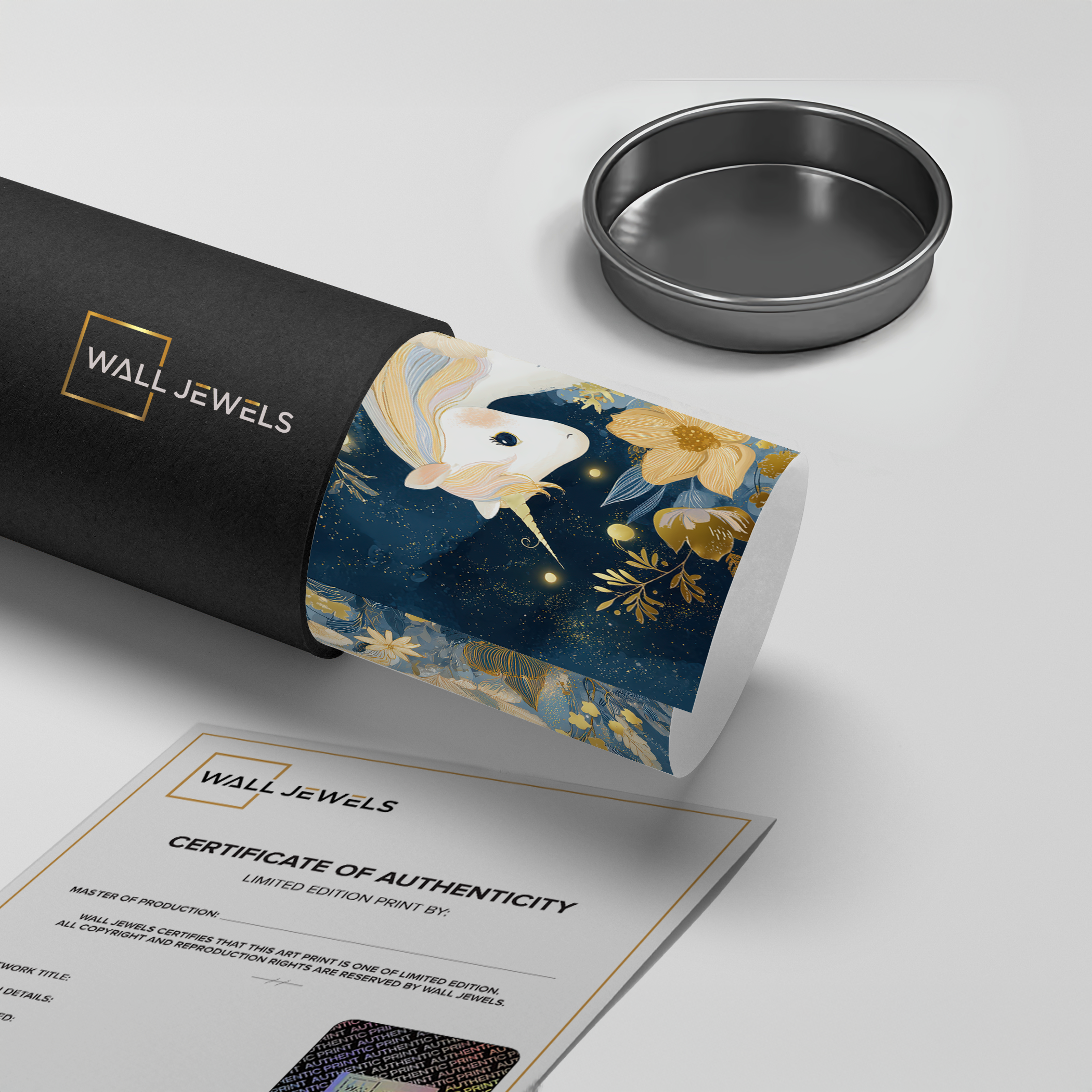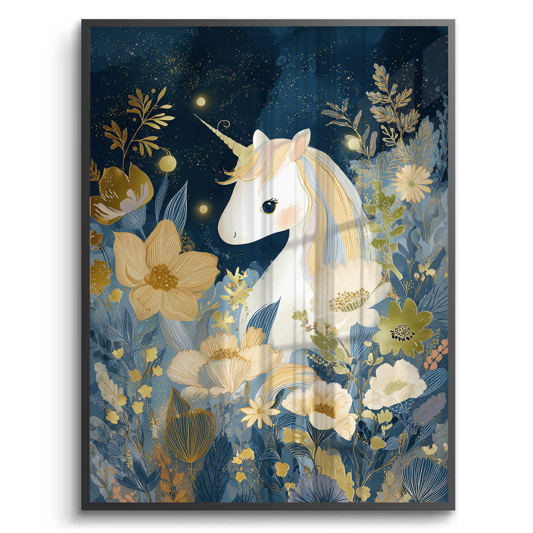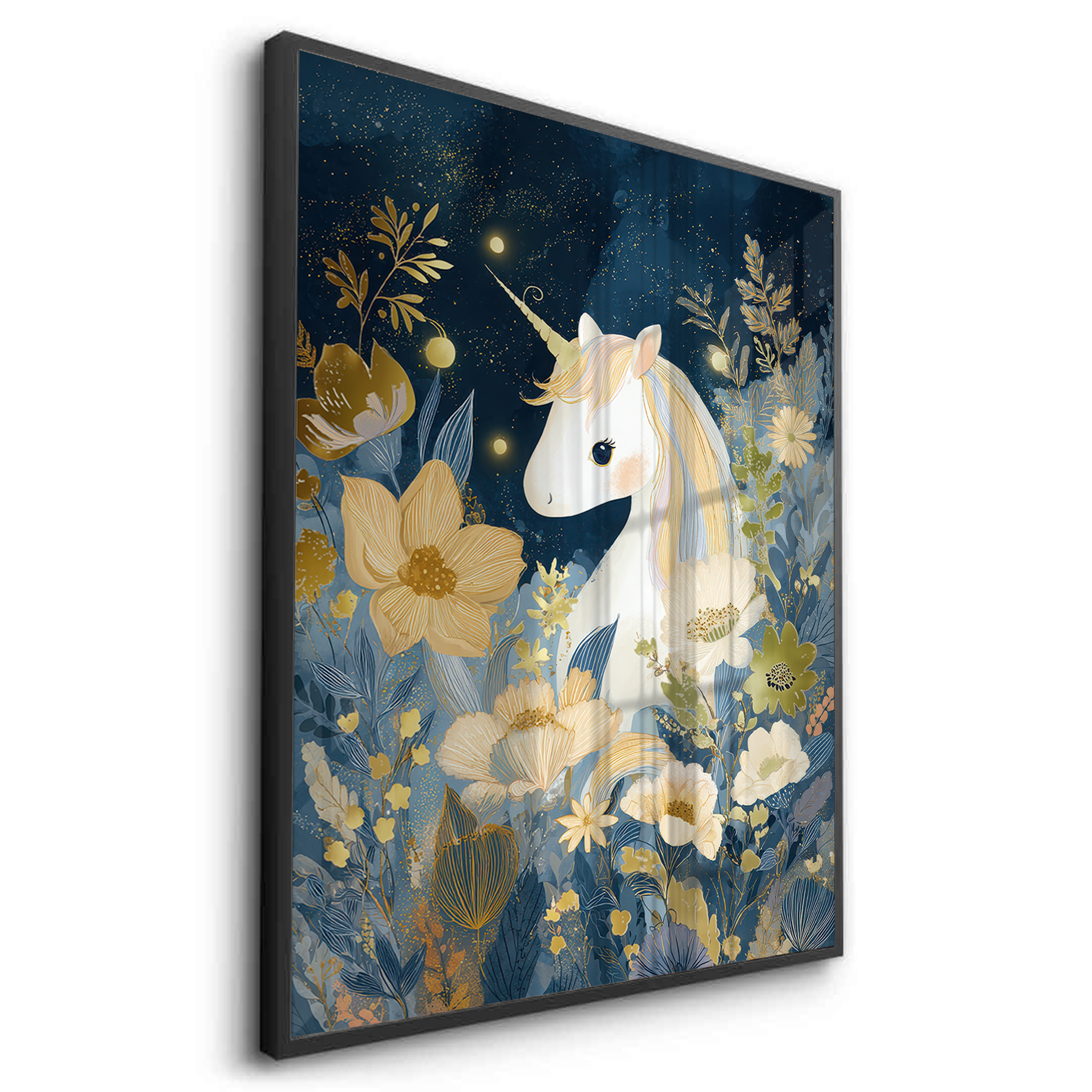 This elegant gold foiled kids’ art piece features a gentle unicorn surrounded by glowing flowers under a starlit sky. With rich night hues and shimmering foil accents, it adds warmth, calm, and magic to children’s spaces.