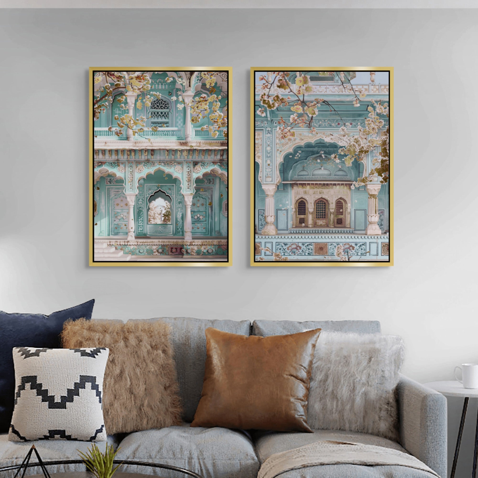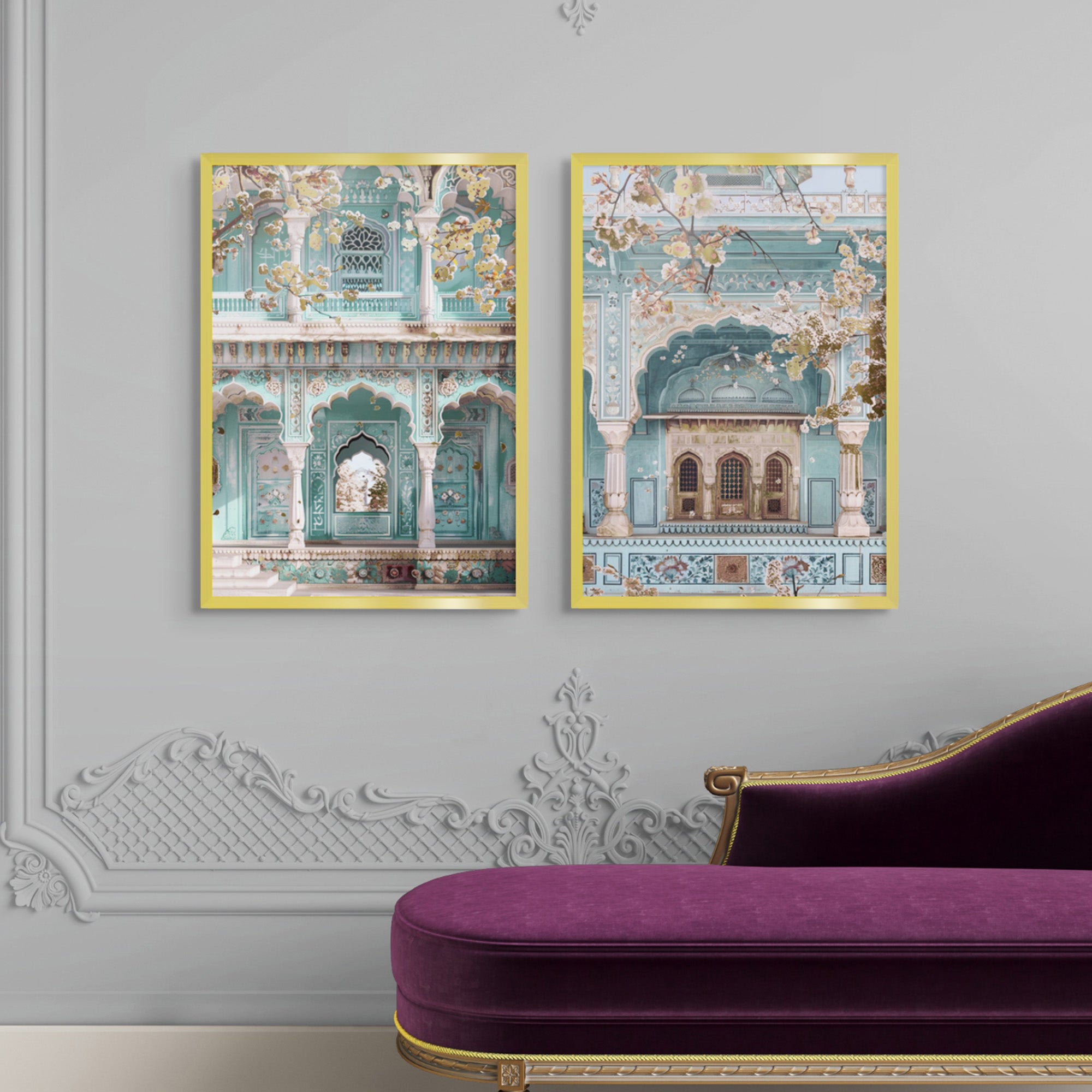 A serene set of architectural prints capturing the beauty of Rajasthani archways, adorned with floral detailing and gold foiled accents. The intricate design celebrates heritage and elegance. Perfect for classic and cultural rooms.