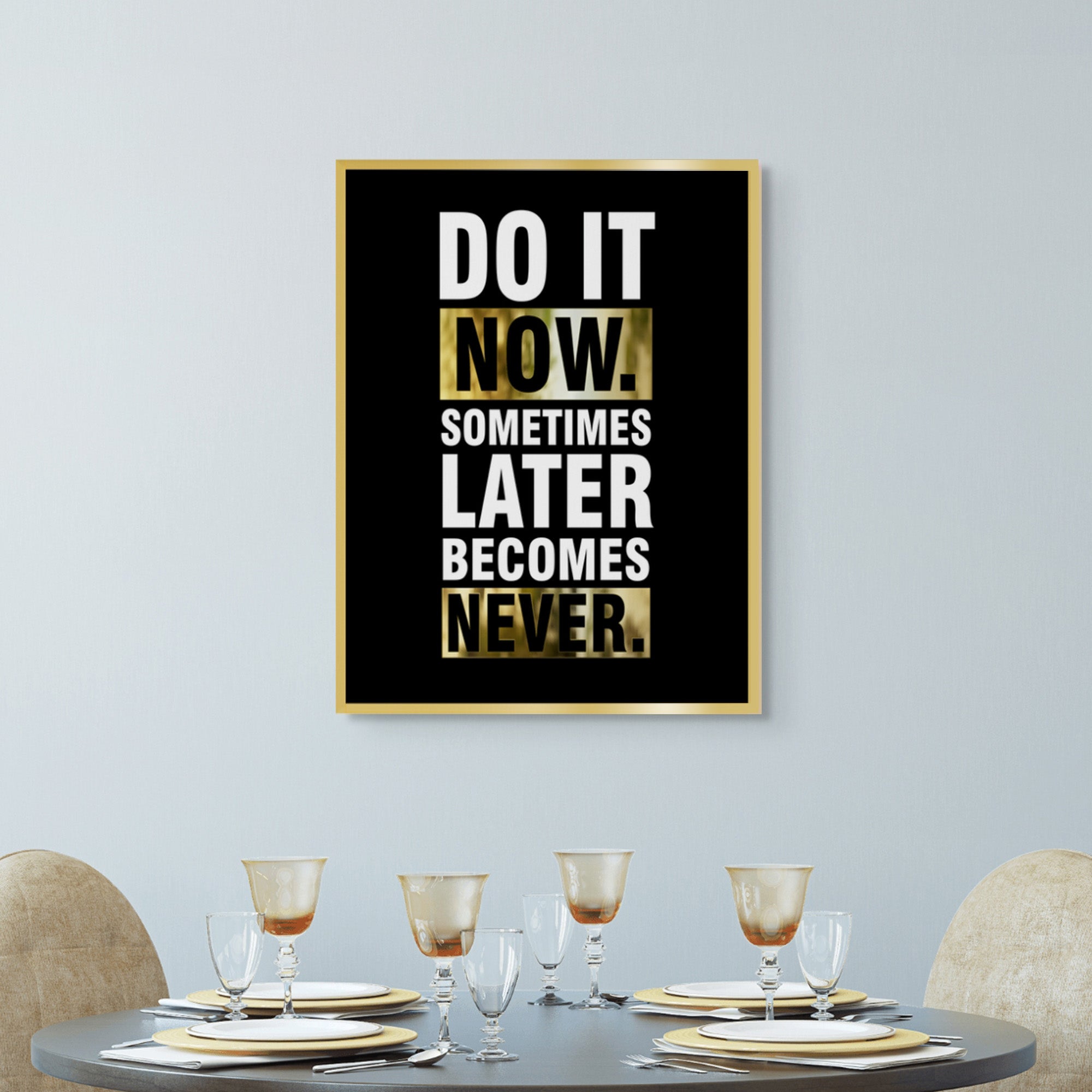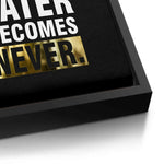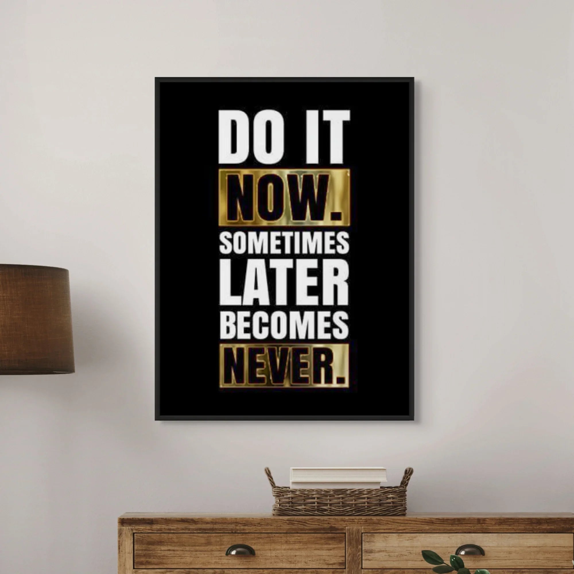 This motivational artwork is a powerful push against procrastination, blending bold typography with striking gold accents. Ideal for workspaces, study areas, or gyms, it energizes you to take action—not tomorrow, not someday, but today.