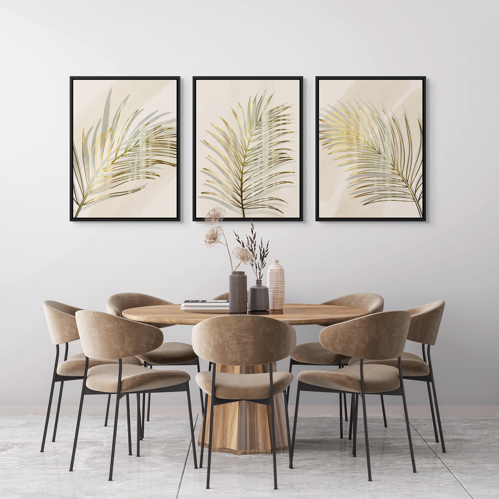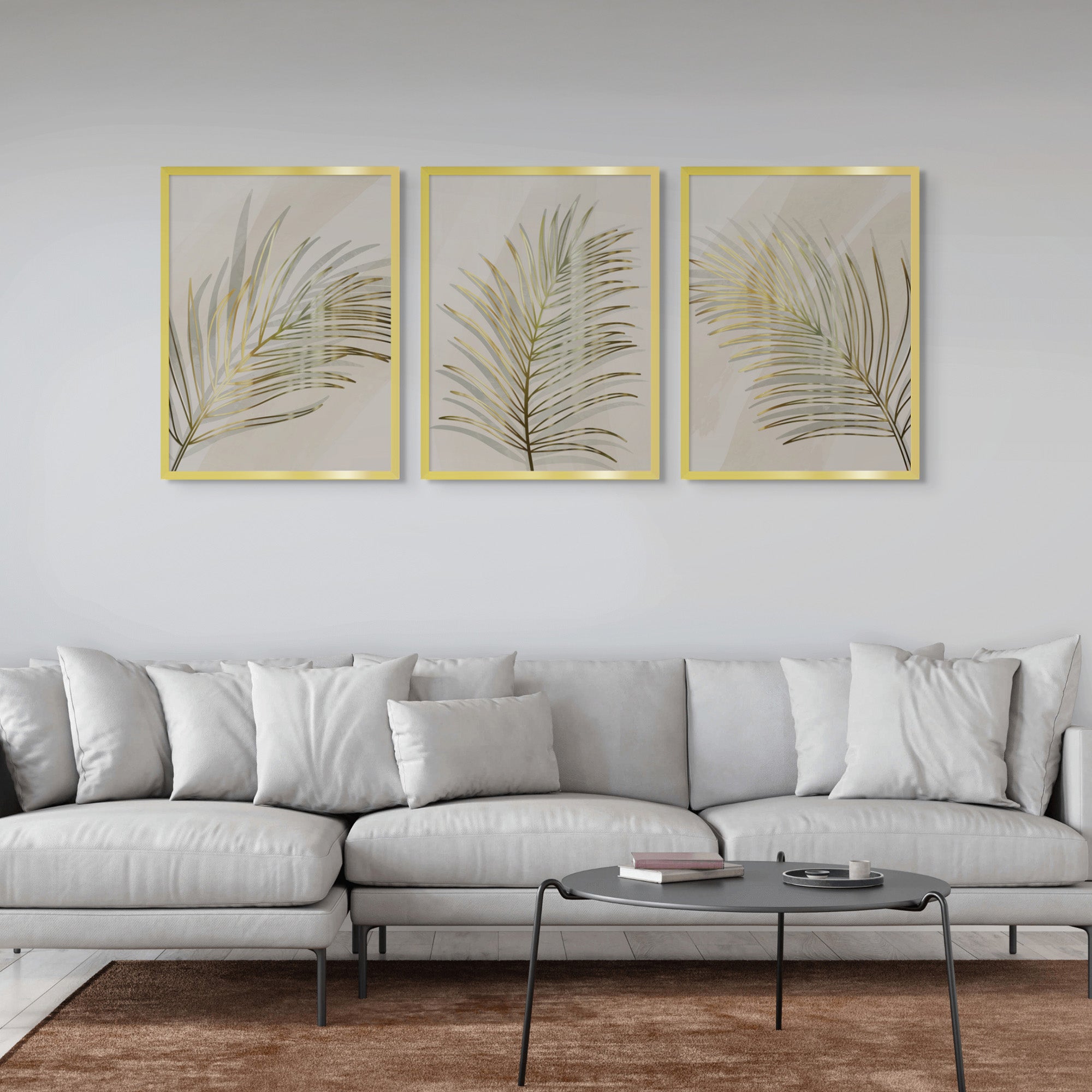 Three palm-inspired prints in soft beige with golden foil accents bring a clean, earthy feel to interiors. Perfect for calm, minimal spaces like bedrooms, lounges, or hallways—adds subtle shine without overpowering neutral decor.