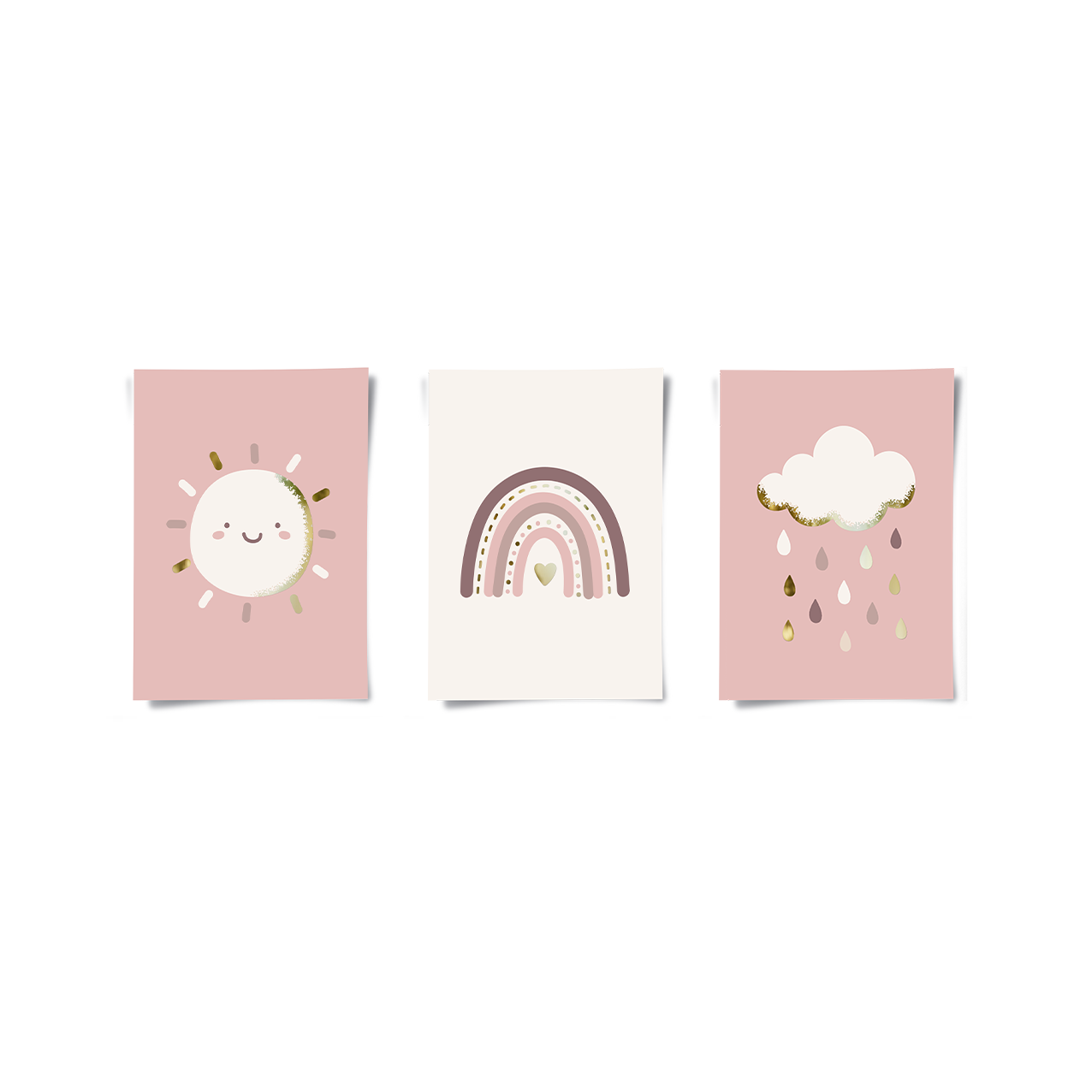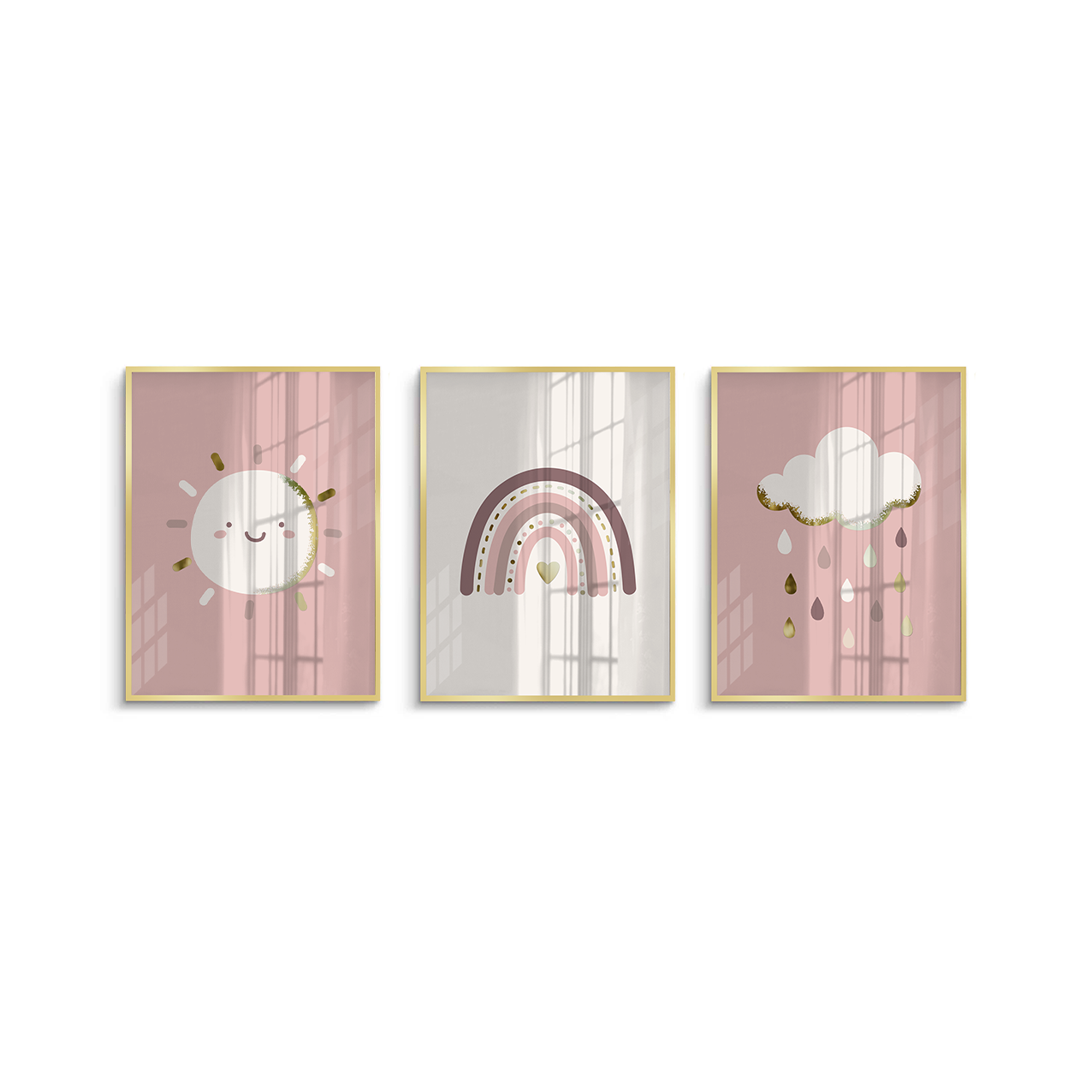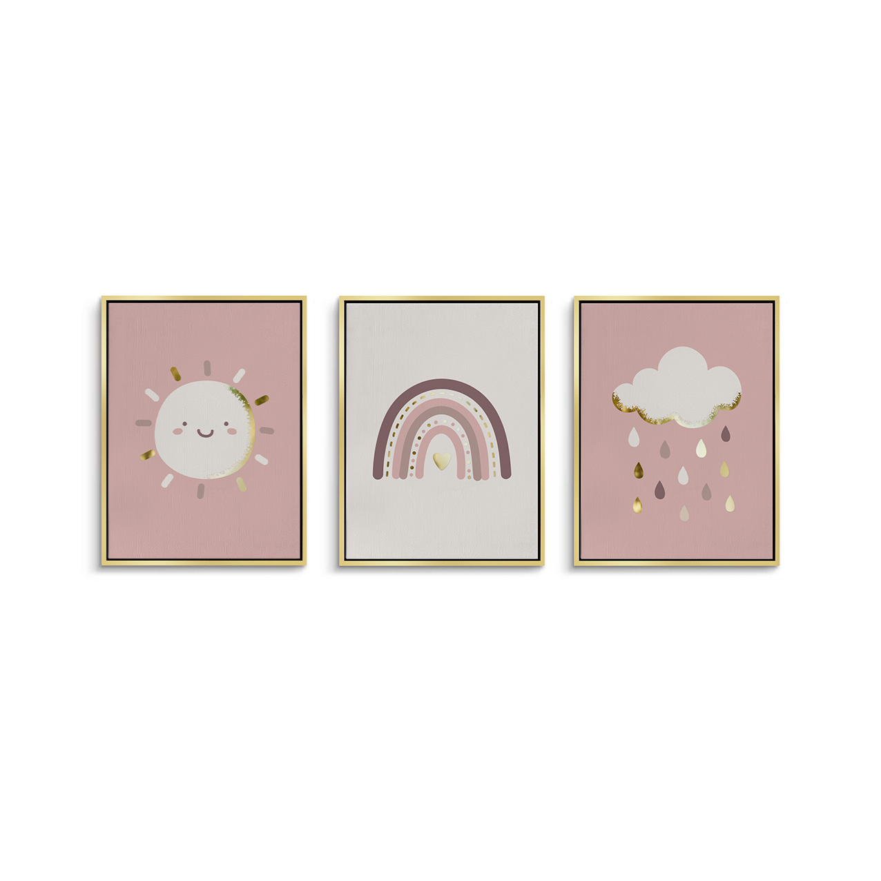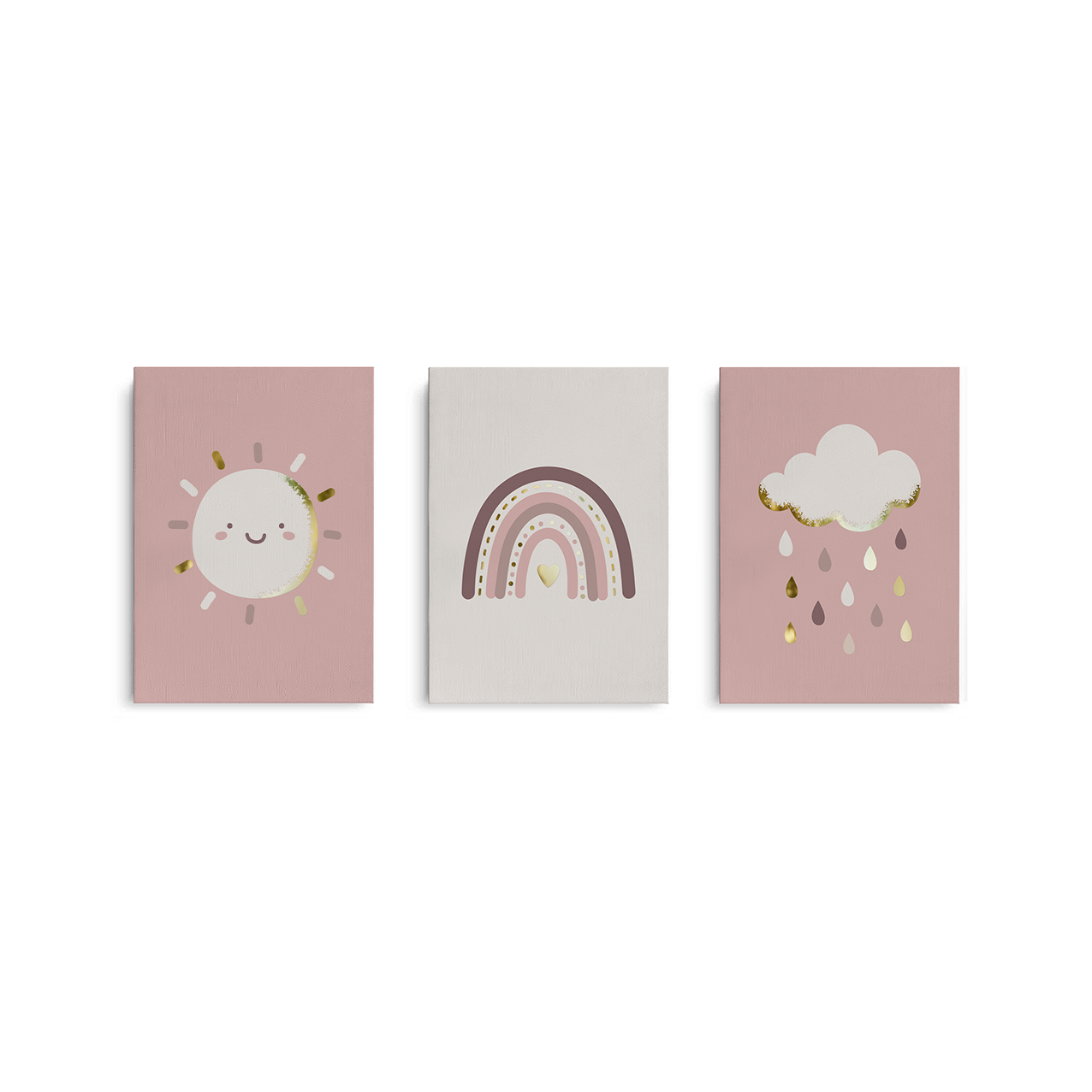 This delightful gold foiled kids’ art set highlights a cheerful sun, rainbow, and raindrop cloud in soft pink tones. Accented with shimmering gold details, it’s a charming addition to nurseries, playrooms, or children’s bedrooms.