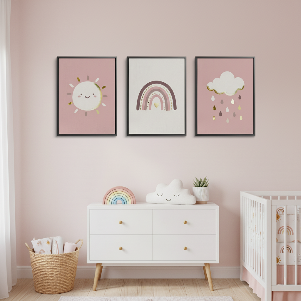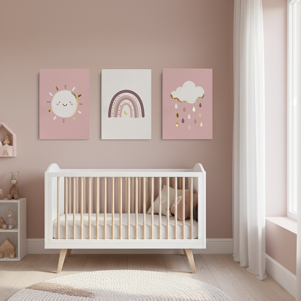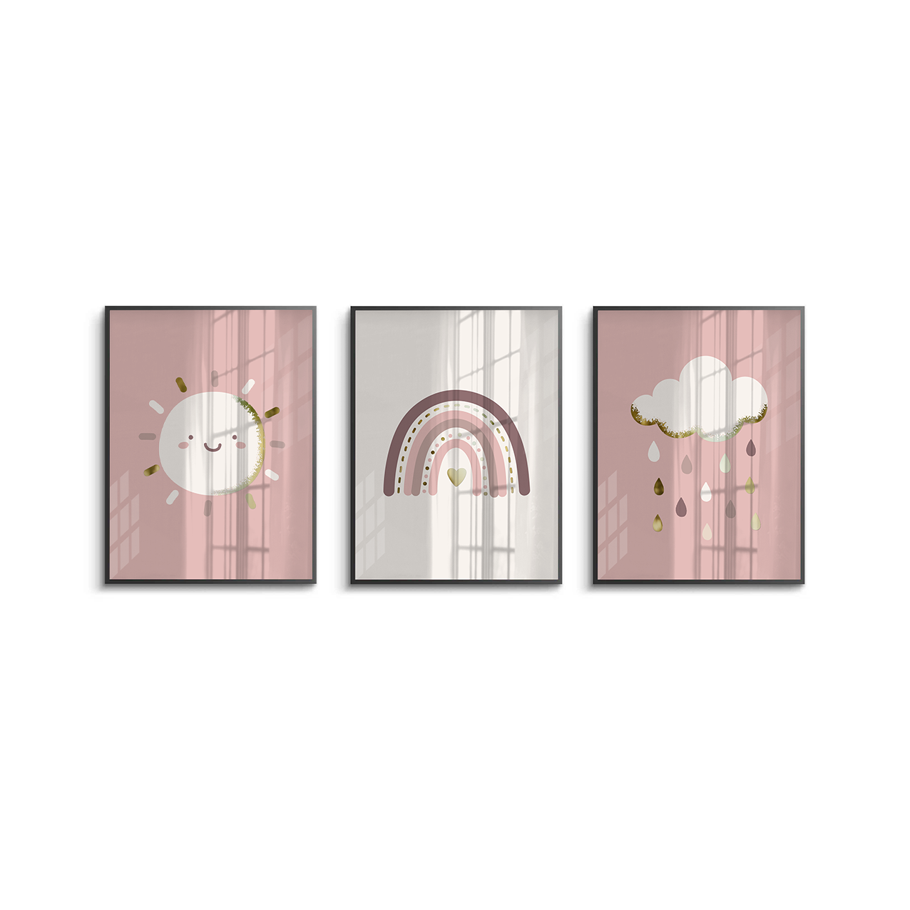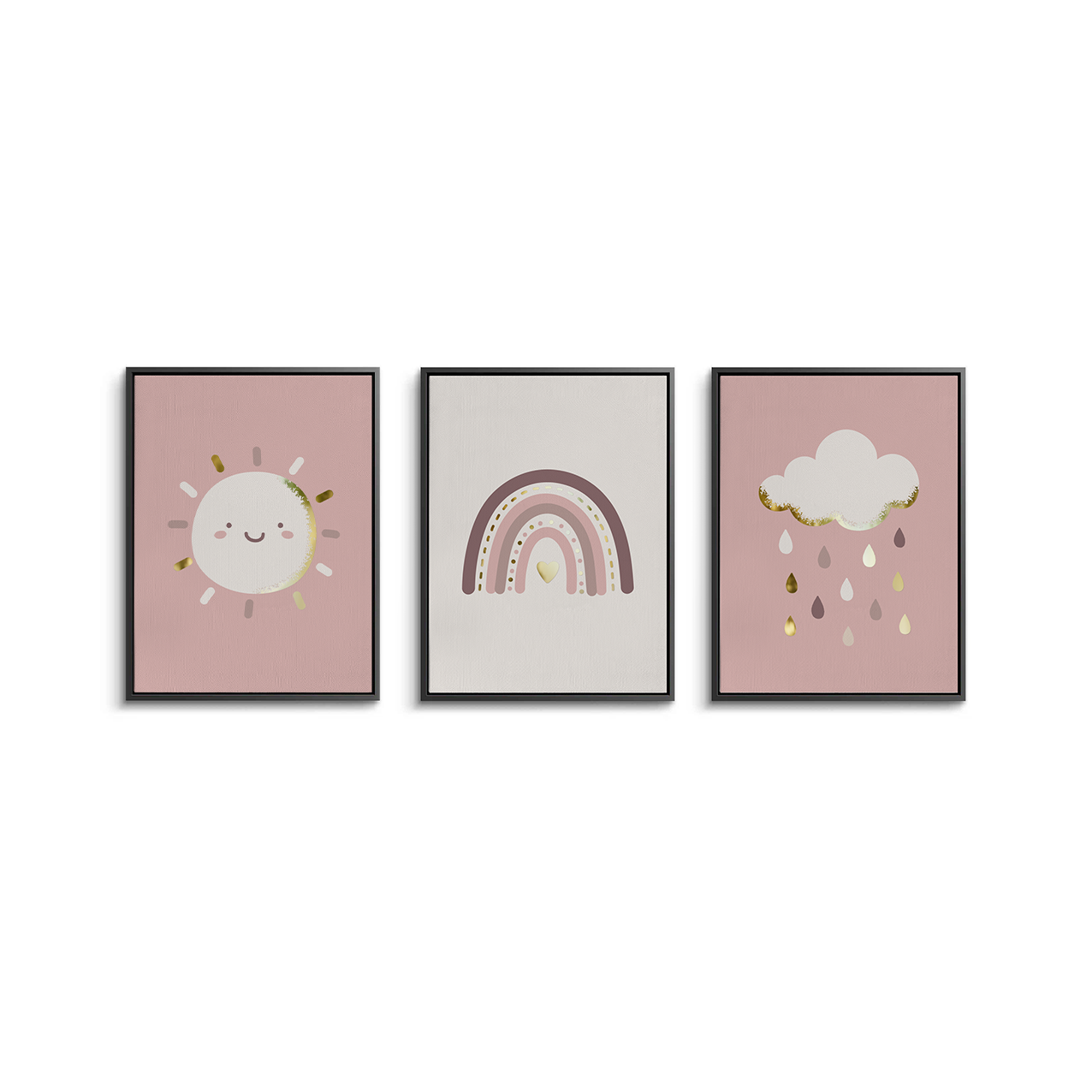 This delightful gold foiled kids’ art set highlights a cheerful sun, rainbow, and raindrop cloud in soft pink tones. Accented with shimmering gold details, it’s a charming addition to nurseries, playrooms, or children’s bedrooms.