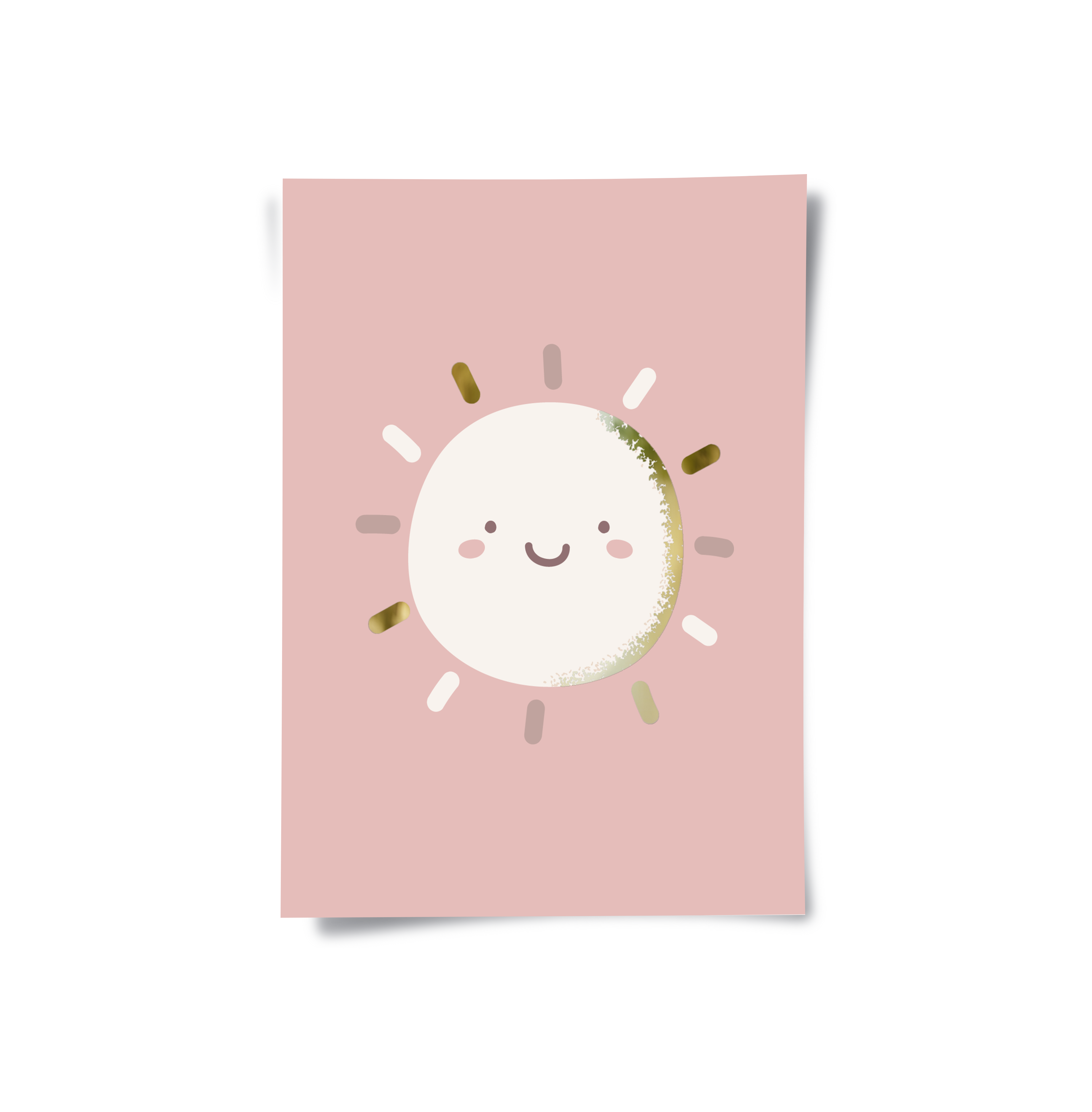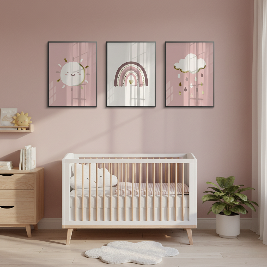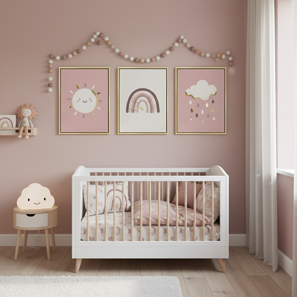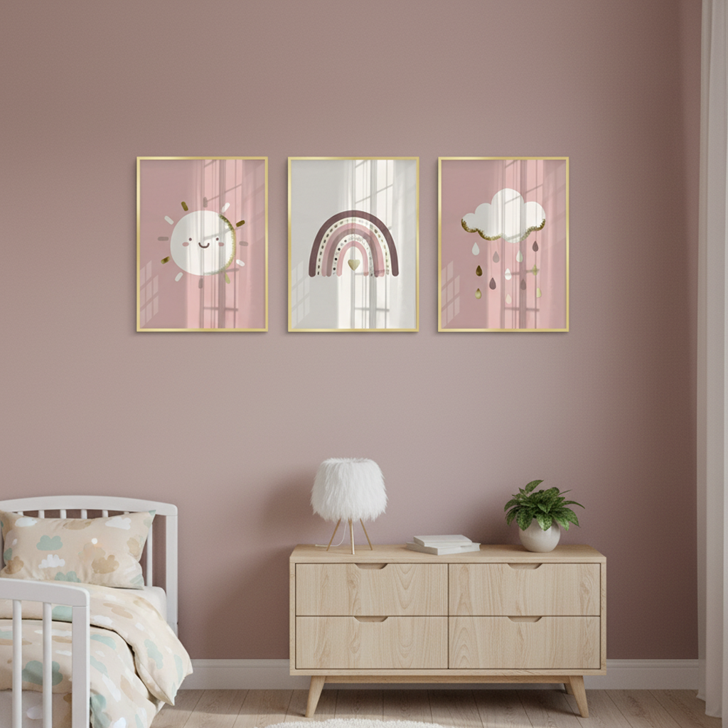 This delightful gold foiled kids’ art set highlights a cheerful sun, rainbow, and raindrop cloud in soft pink tones. Accented with shimmering gold details, it’s a charming addition to nurseries, playrooms, or children’s bedrooms.