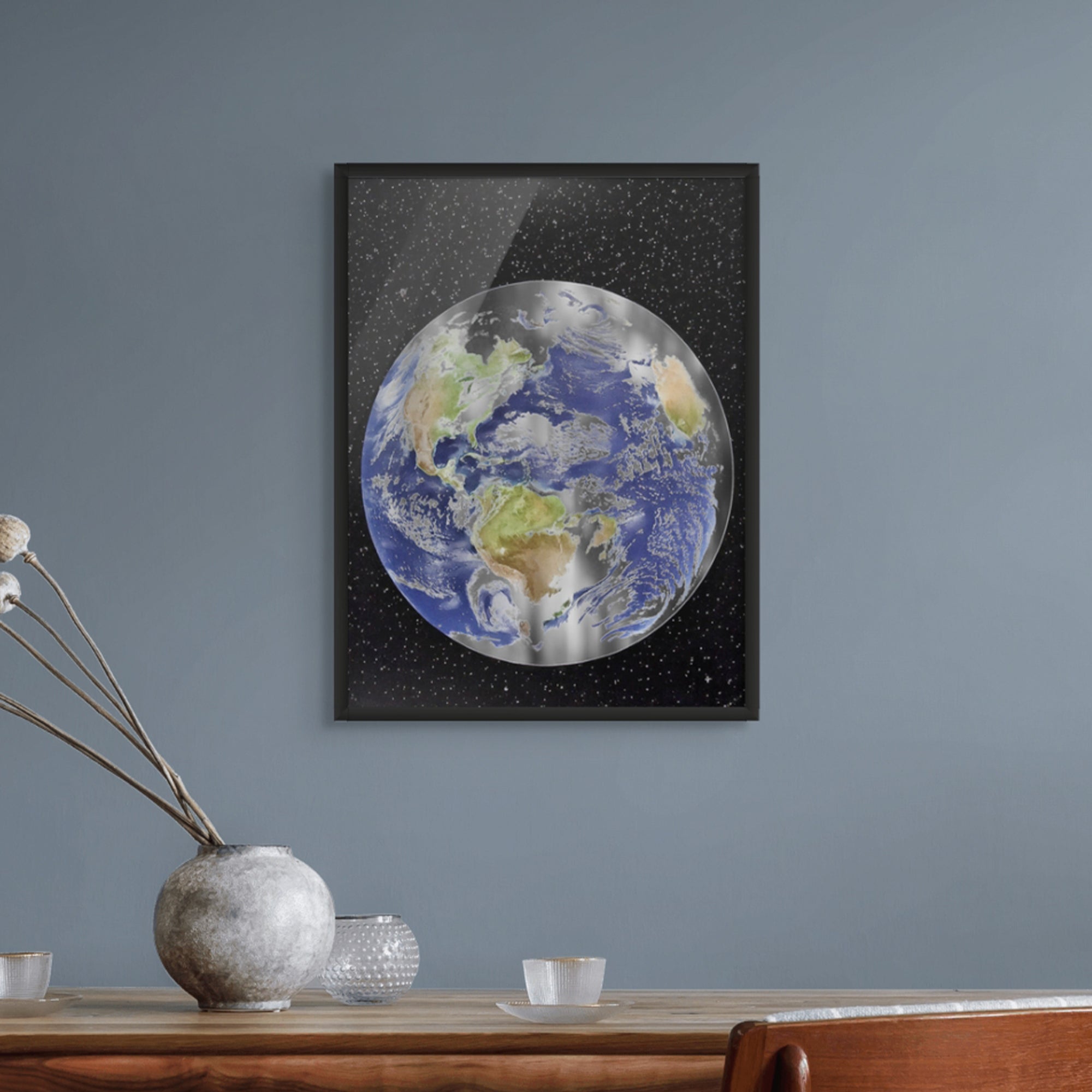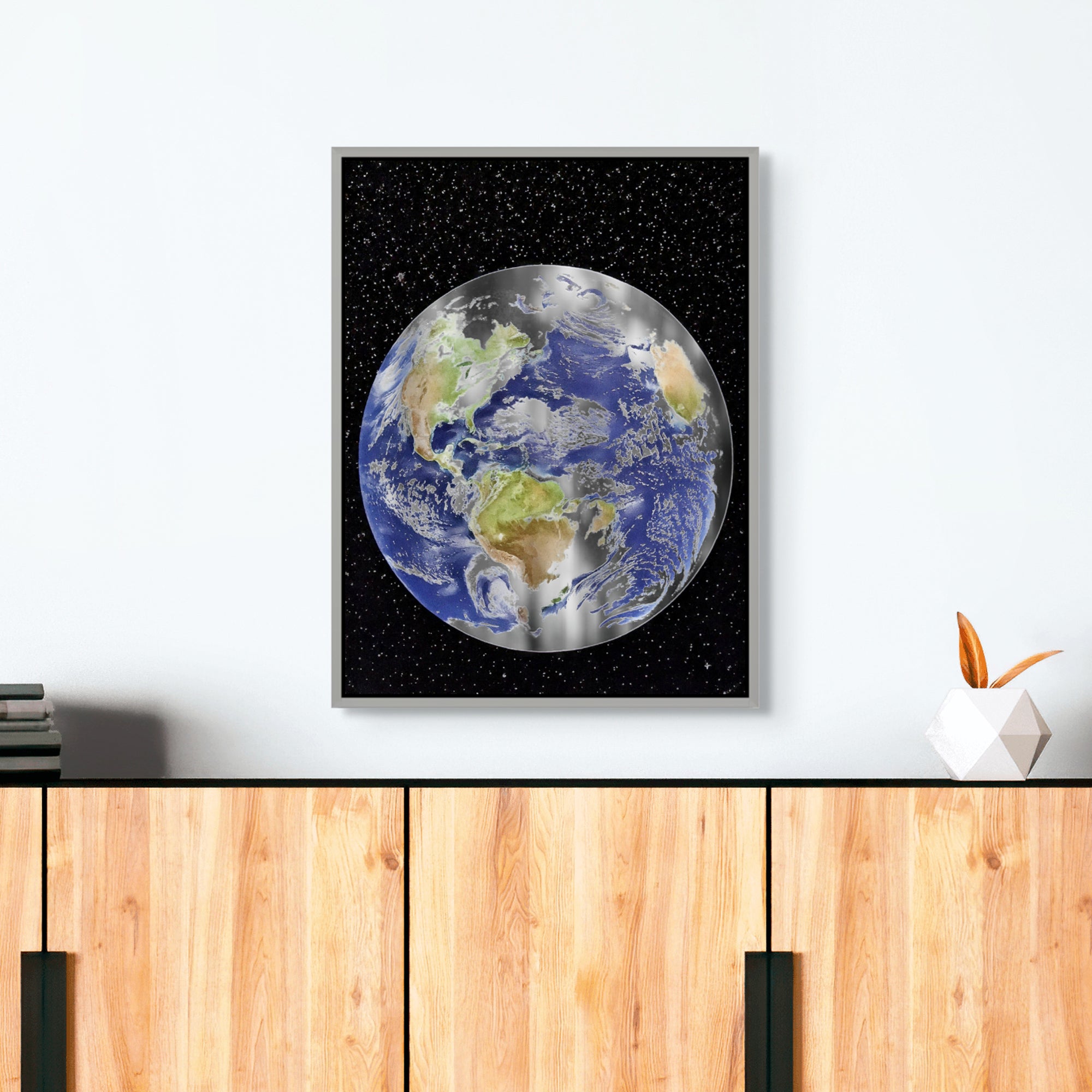 A striking portrait of Earth floating in the vastness of space. Rendered with silver accents and celestial depth, it captures our planet’s beauty—perfect for modern interiors, study rooms, offices, or spaces that inspire reflection and calm.