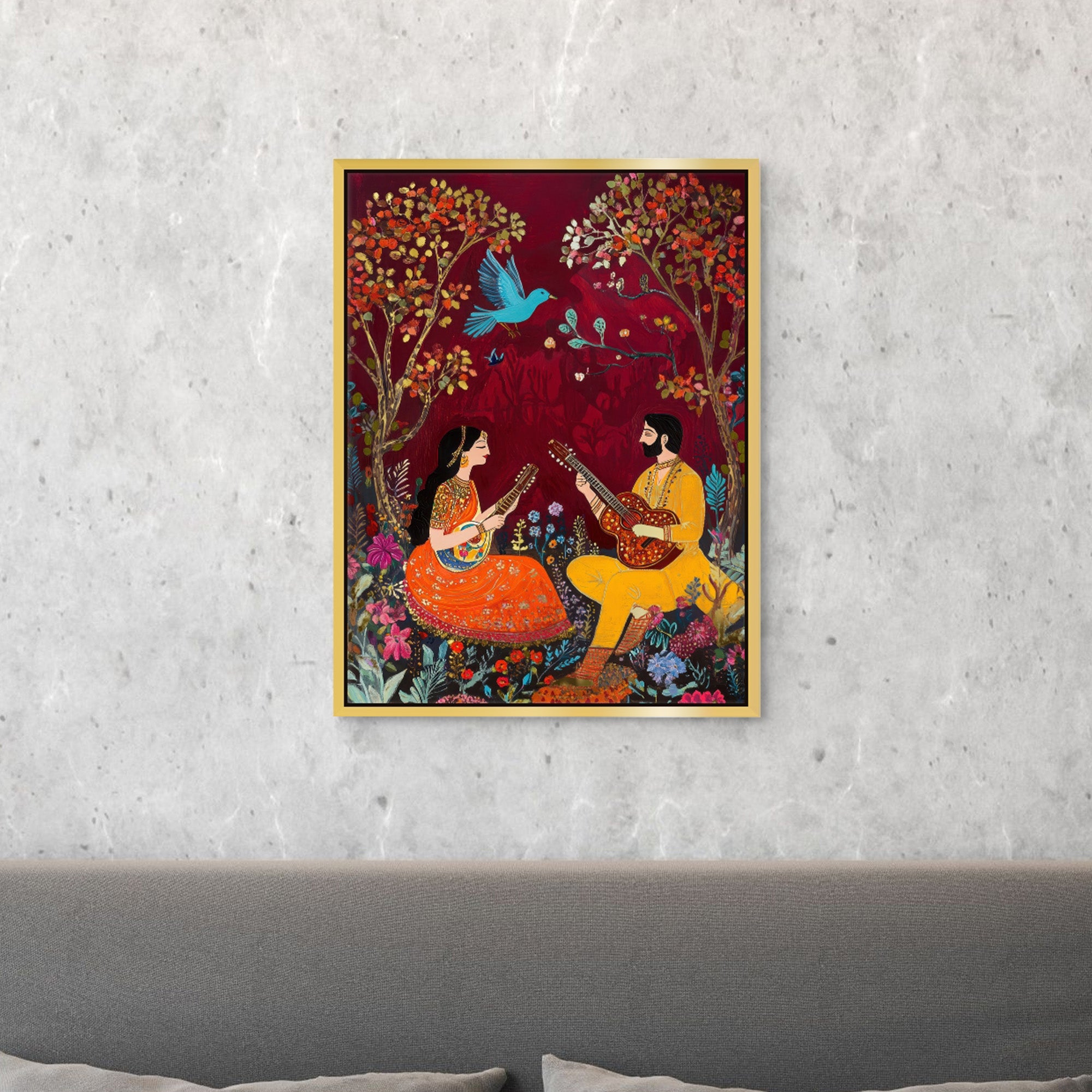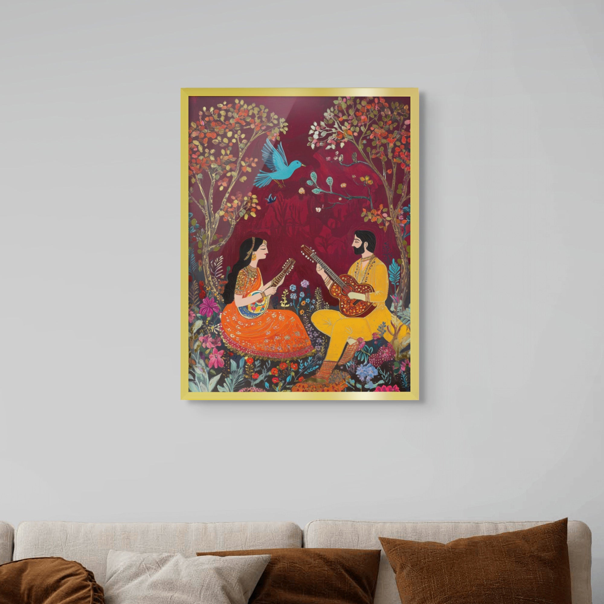 Raga of Love celebrates musical harmony between two souls, set in a blooming garden of colour and connection. With vibrant tones and playful detailing, this artwork enlivens living rooms, music corners, reading nooks, or creative studios.