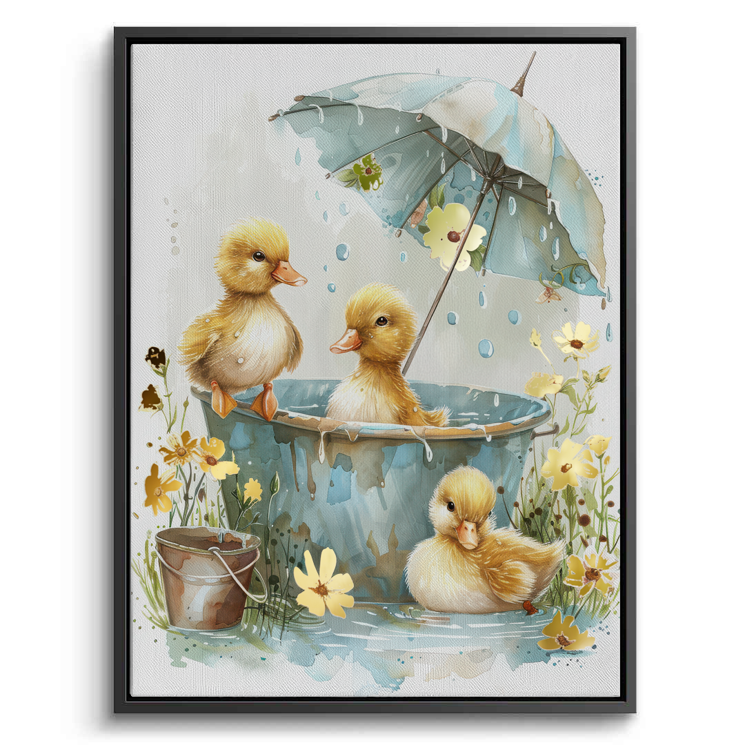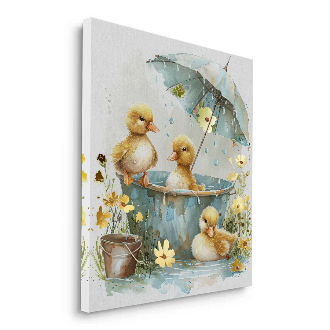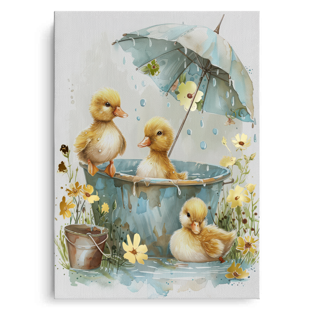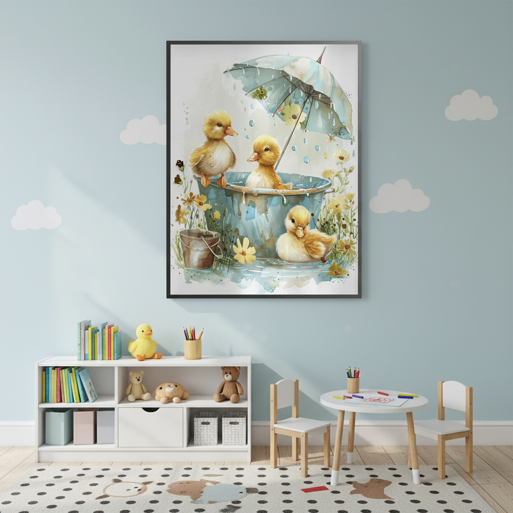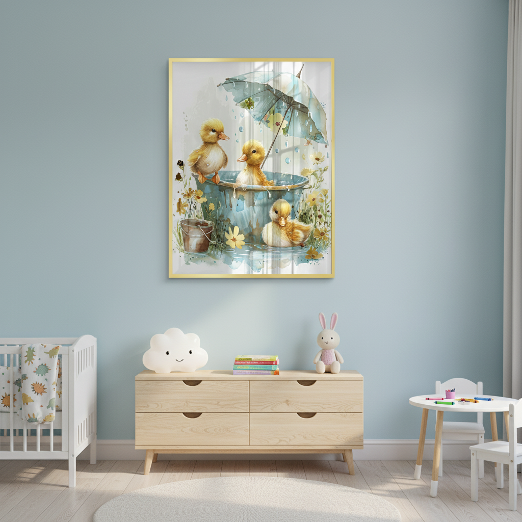 This heartwarming kids’ art piece features playful ducklings splashing under a floral umbrella in soft watercolor tones. With golden hues and gentle details, it adds warmth, joy, and sweetness to nurseries, playrooms, or children’s bedrooms.