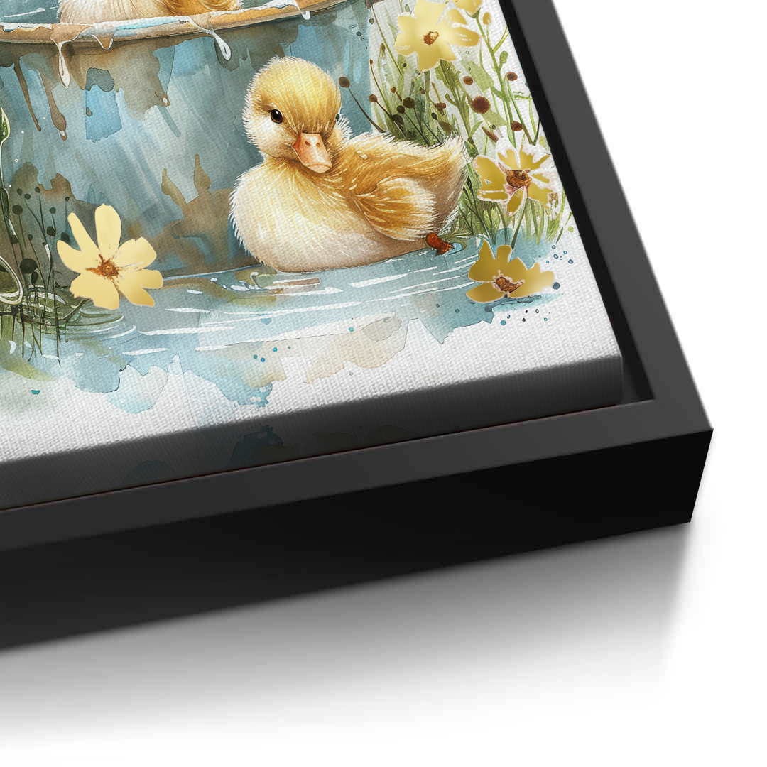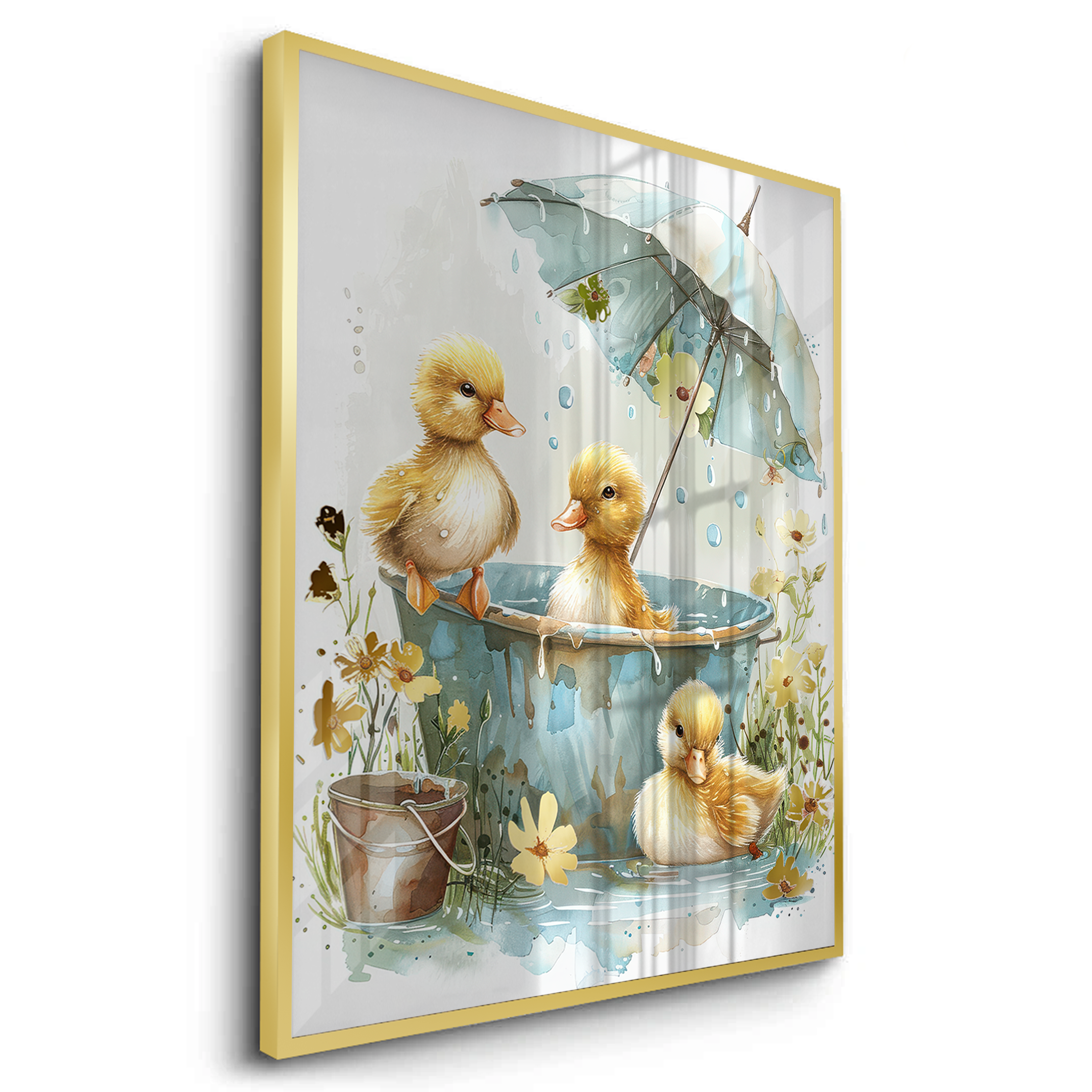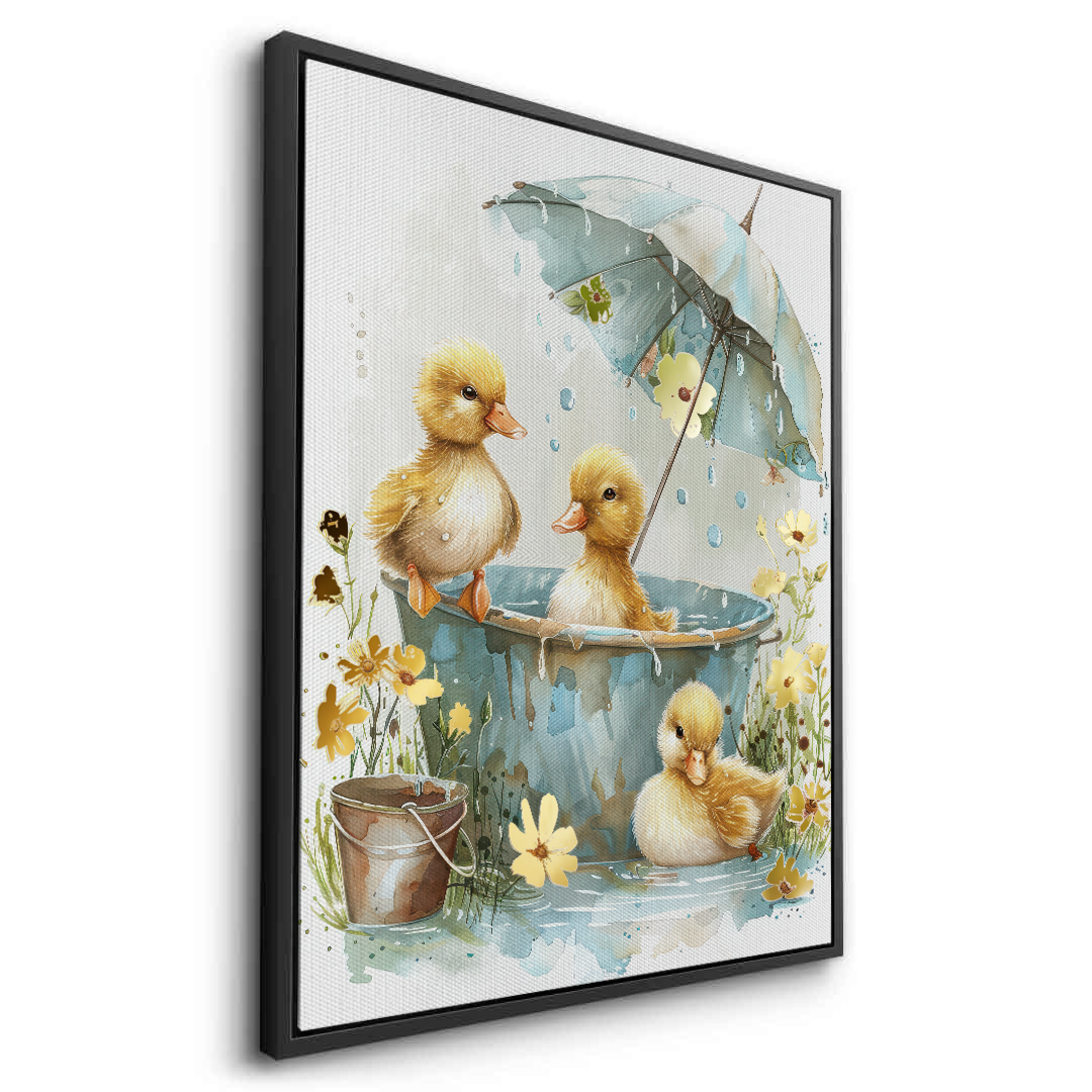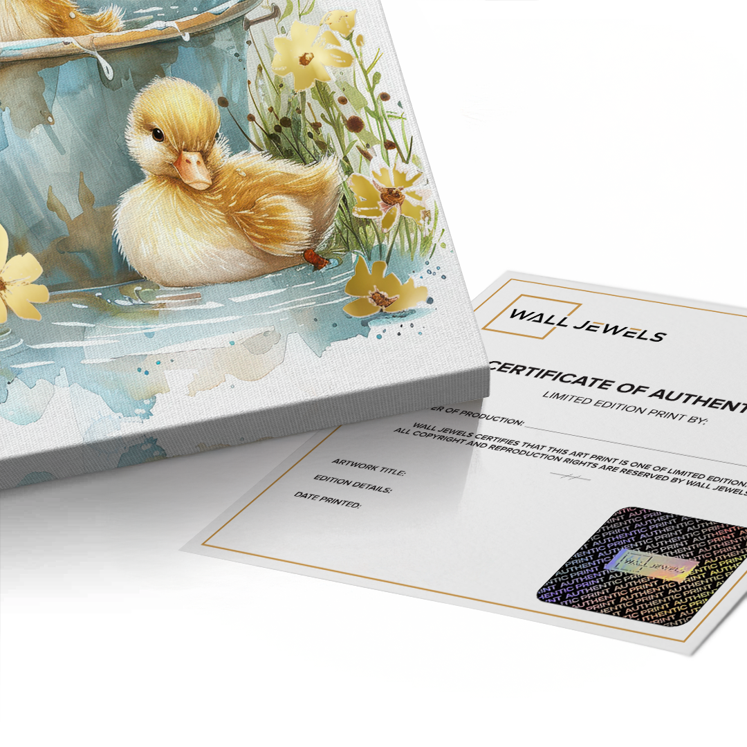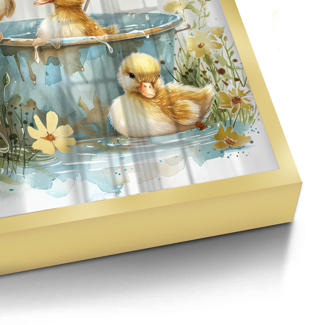 This heartwarming kids’ art piece features playful ducklings splashing under a floral umbrella in soft watercolor tones. With golden hues and gentle details, it adds warmth, joy, and sweetness to nurseries, playrooms, or children’s bedrooms.