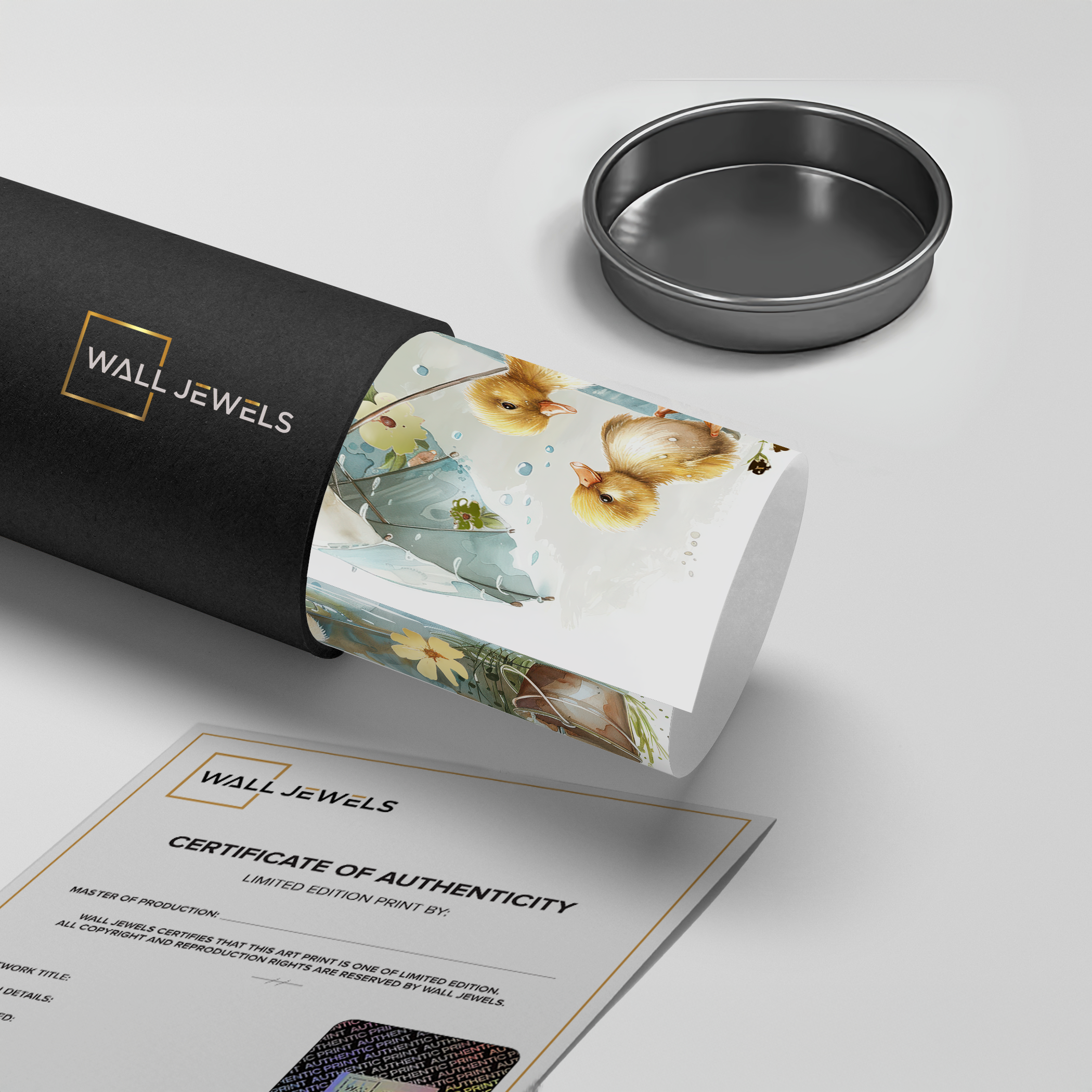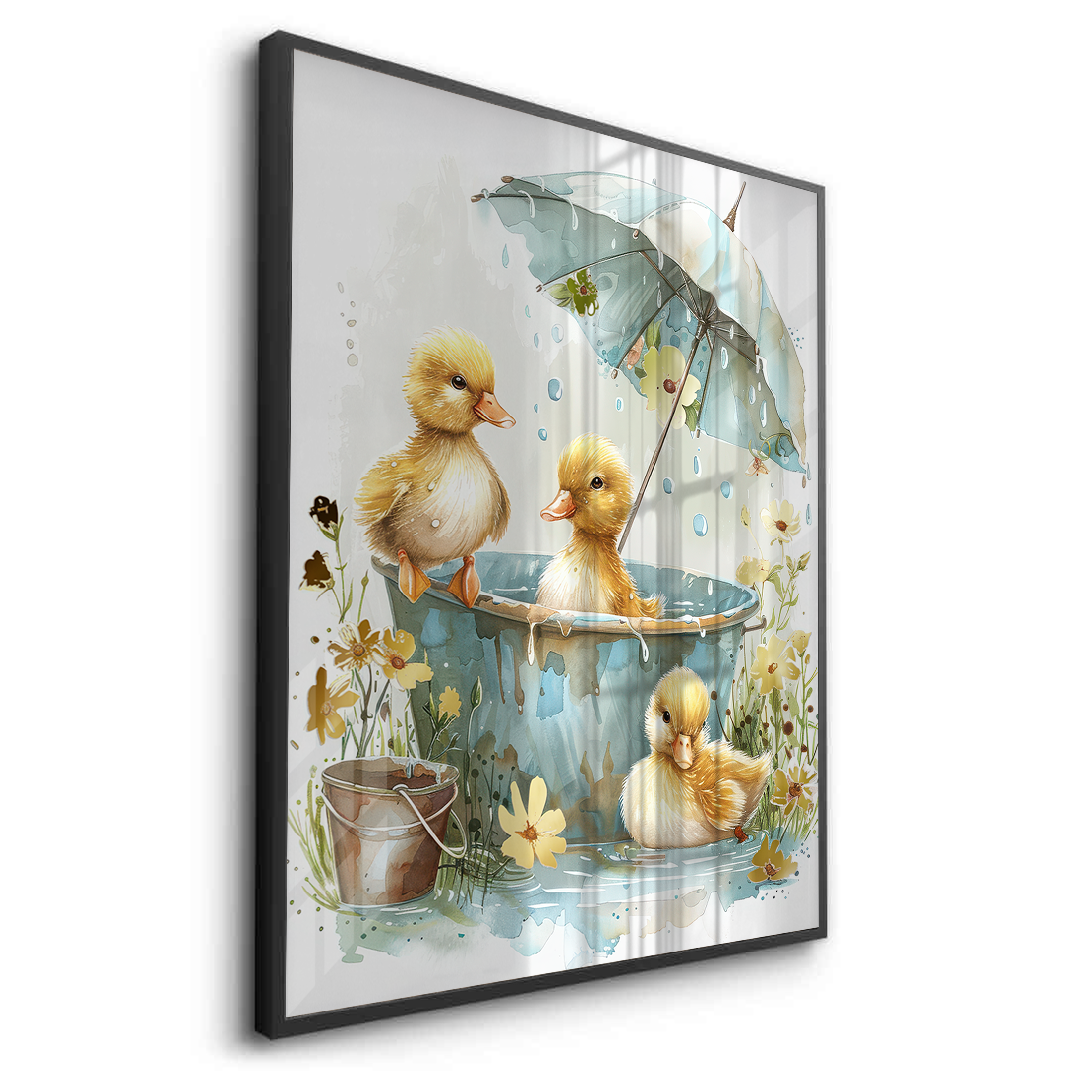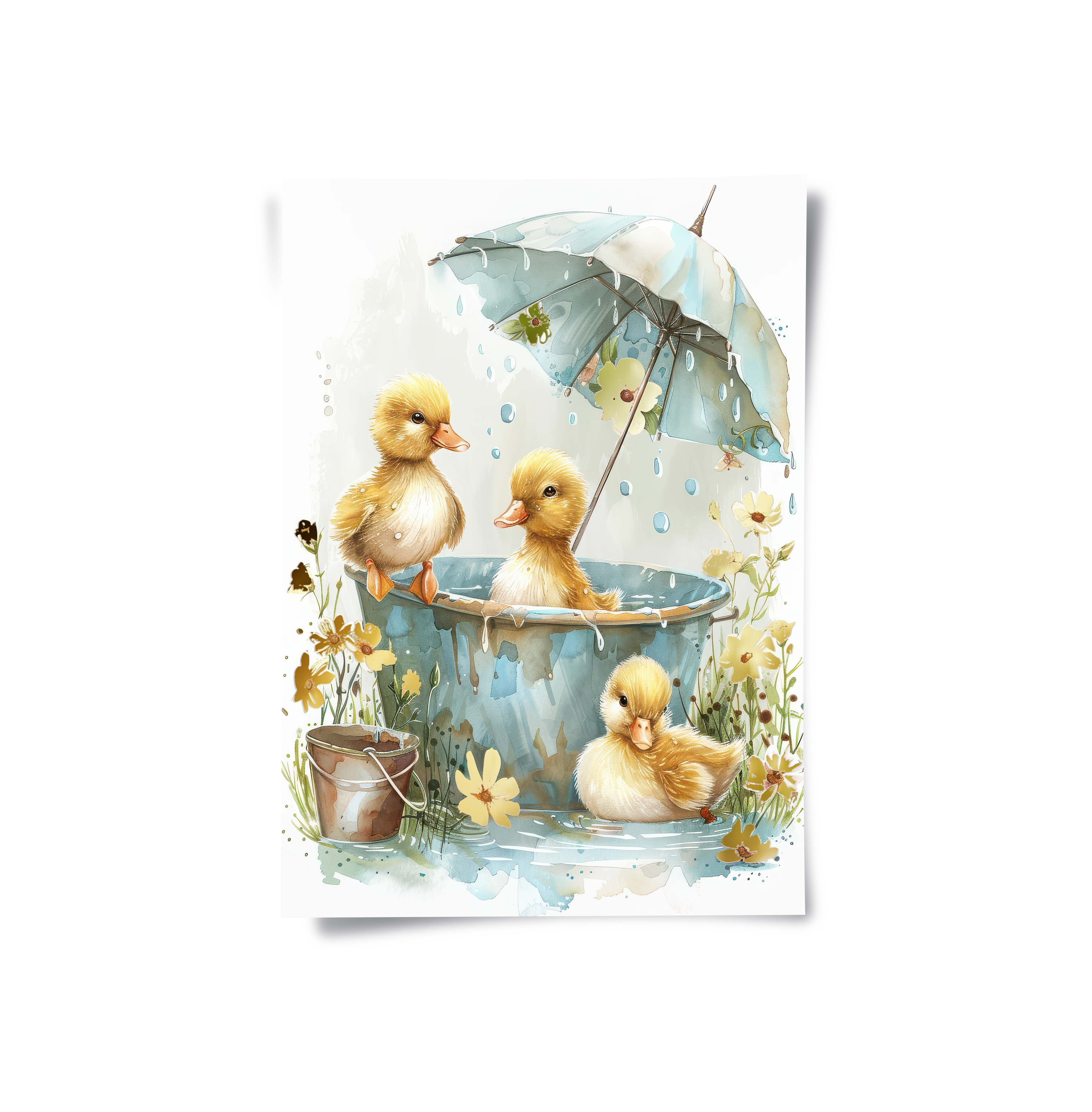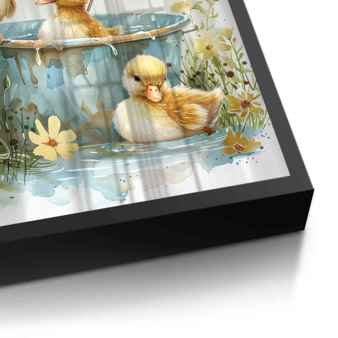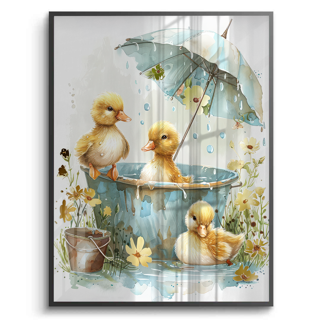 This heartwarming kids’ art piece features playful ducklings splashing under a floral umbrella in soft watercolor tones. With golden hues and gentle details, it adds warmth, joy, and sweetness to nurseries, playrooms, or children’s bedrooms.
