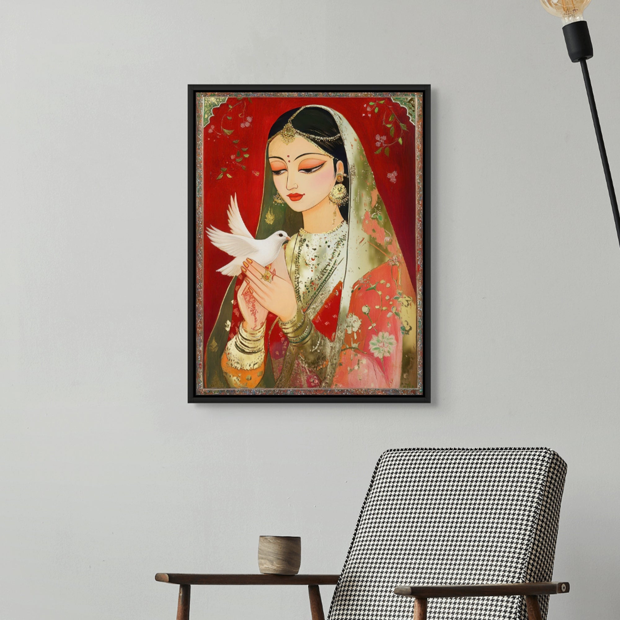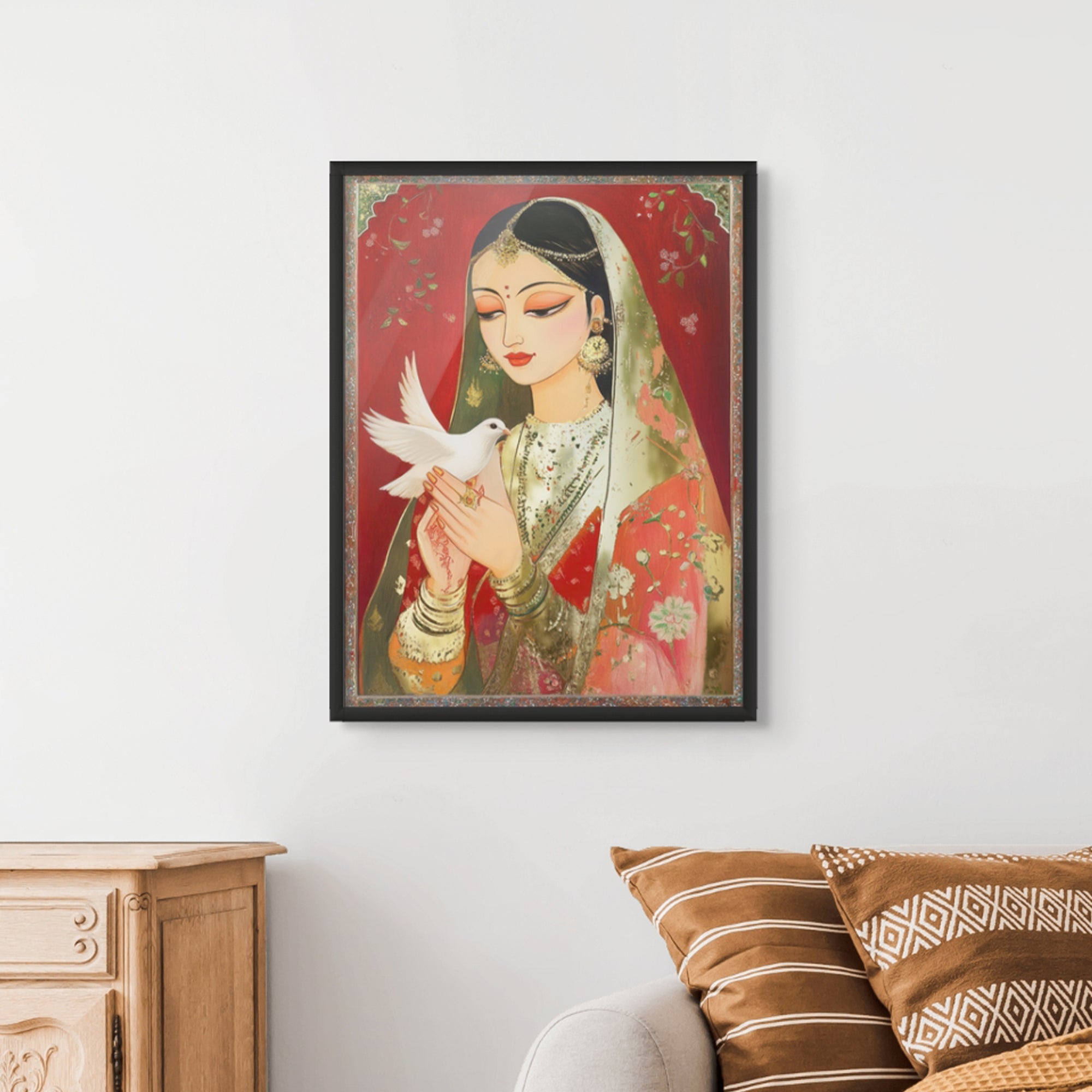 Adorned in regal red and gold foiled detailing, Rajrani embodies timeless grace and quiet strength. A poised queen with a dove in hand, she brings heritage warmth to living rooms, entryways, reading corners, or softly lit hallways.