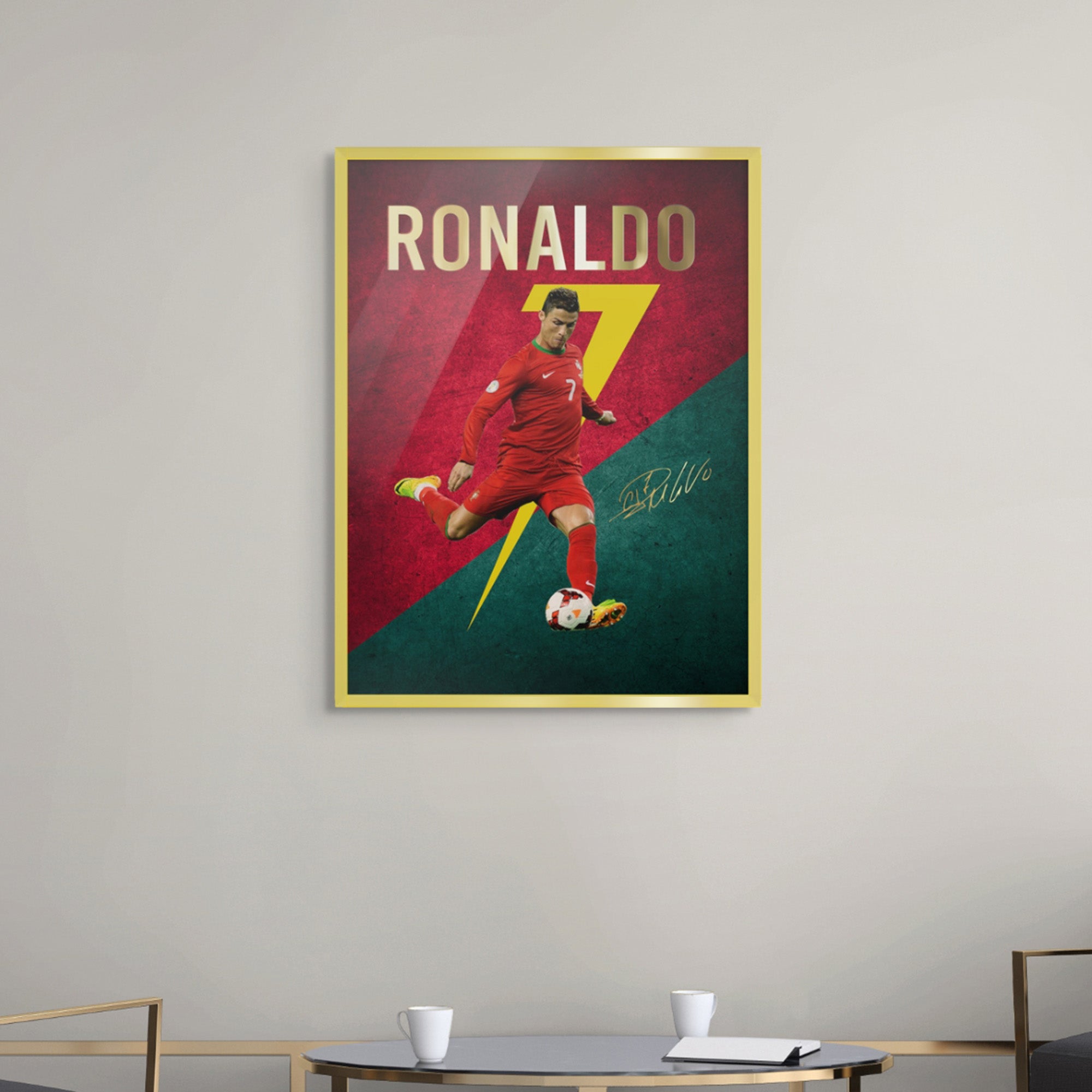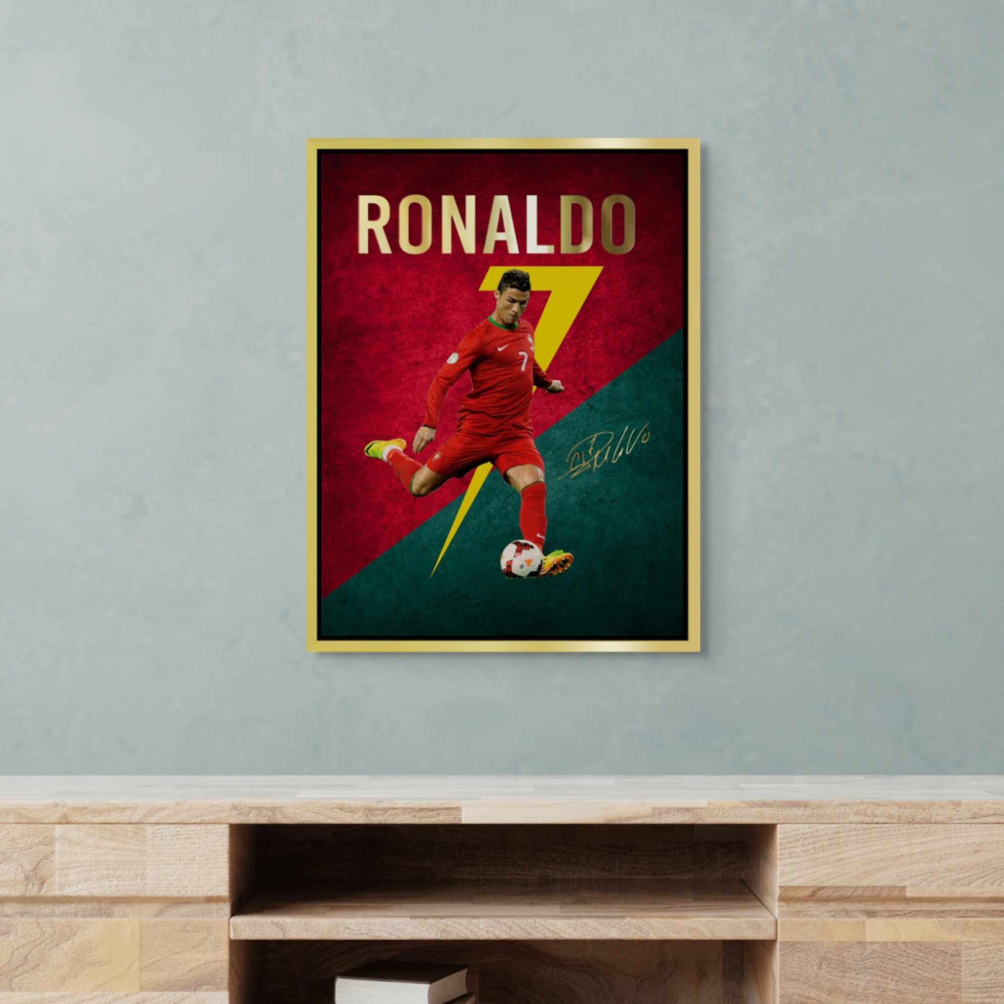 This artwork captures Cristiano Ronaldo in an unforgettable stance—bold, focused, and iconic. Accented with real gold foiling, it’s the perfect statement piece for true fans of football’s most relentless legend.