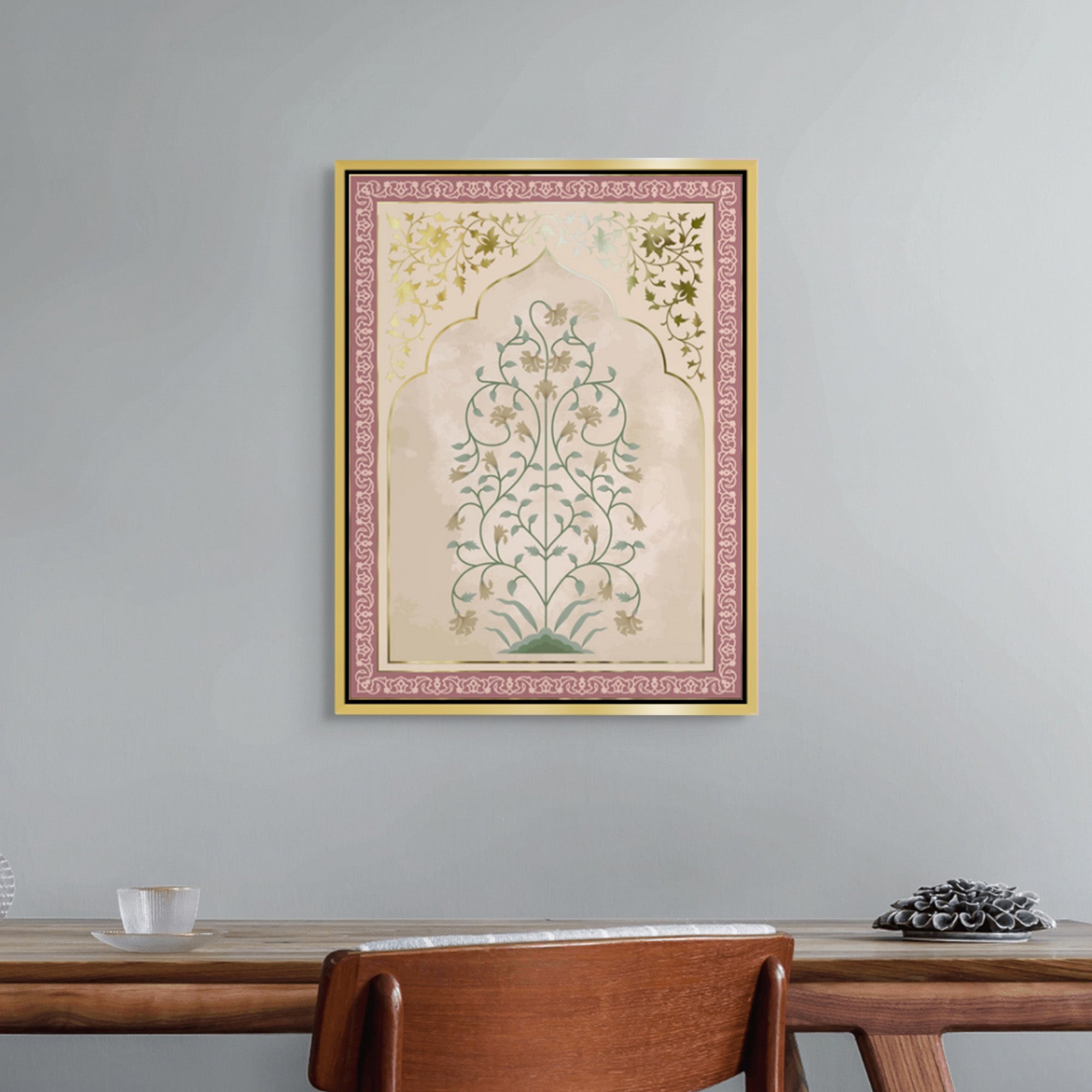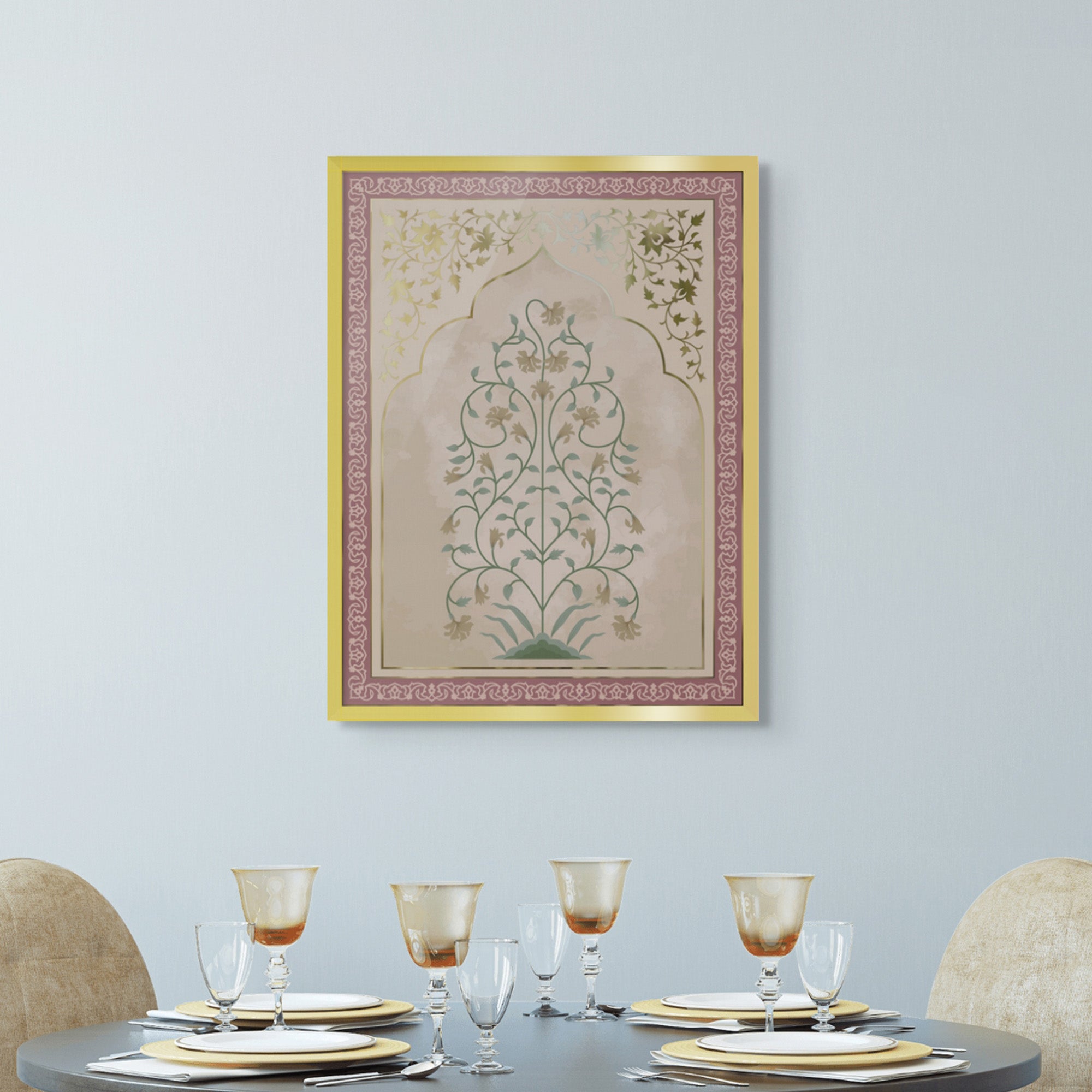 Rosé Mehrab or Pink Arch is a Mughal-inspired floral artwork in blush pink, dusty rose, muted gold, and green. Finished with gold foiling for a regal glow. Looks graceful in living rooms, entryways, or quiet corners.
