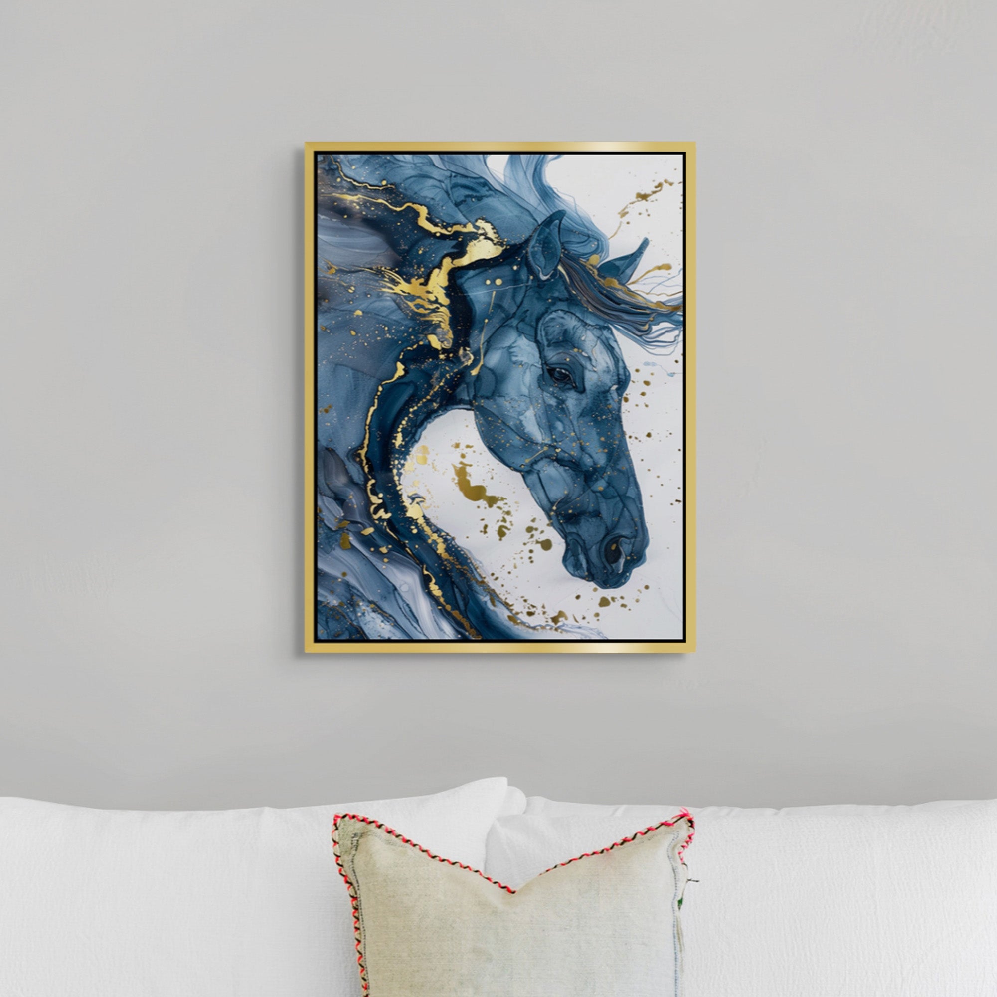 This elegant watercolor artwork captures a serene blue stallion with striking golden accents. A perfect blend of calm and strength, this piece enhances bedrooms, entryways, or study walls with refined character and abstract charm.