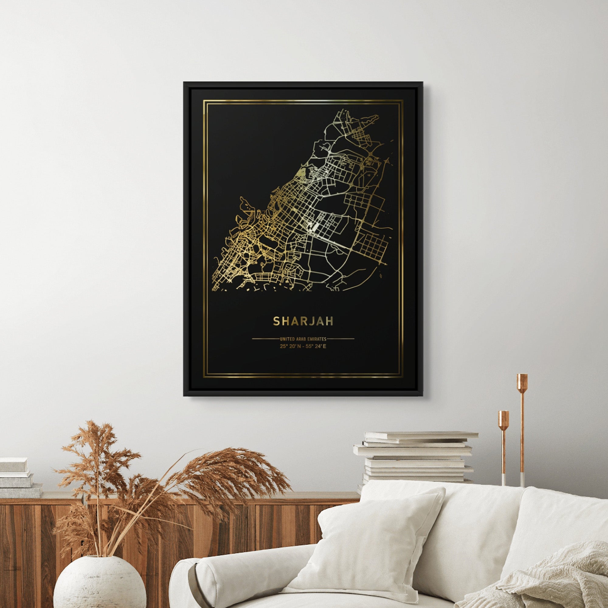 A striking gold foiled city map artwork of Sharjah, United Arab Emirates, capturing its unique layout in bold detail. Perfect for offices, airports, hotels, corporate spaces, or modern homes, it celebrates the Emirates’ spirit and appeals to UAE art lovers.