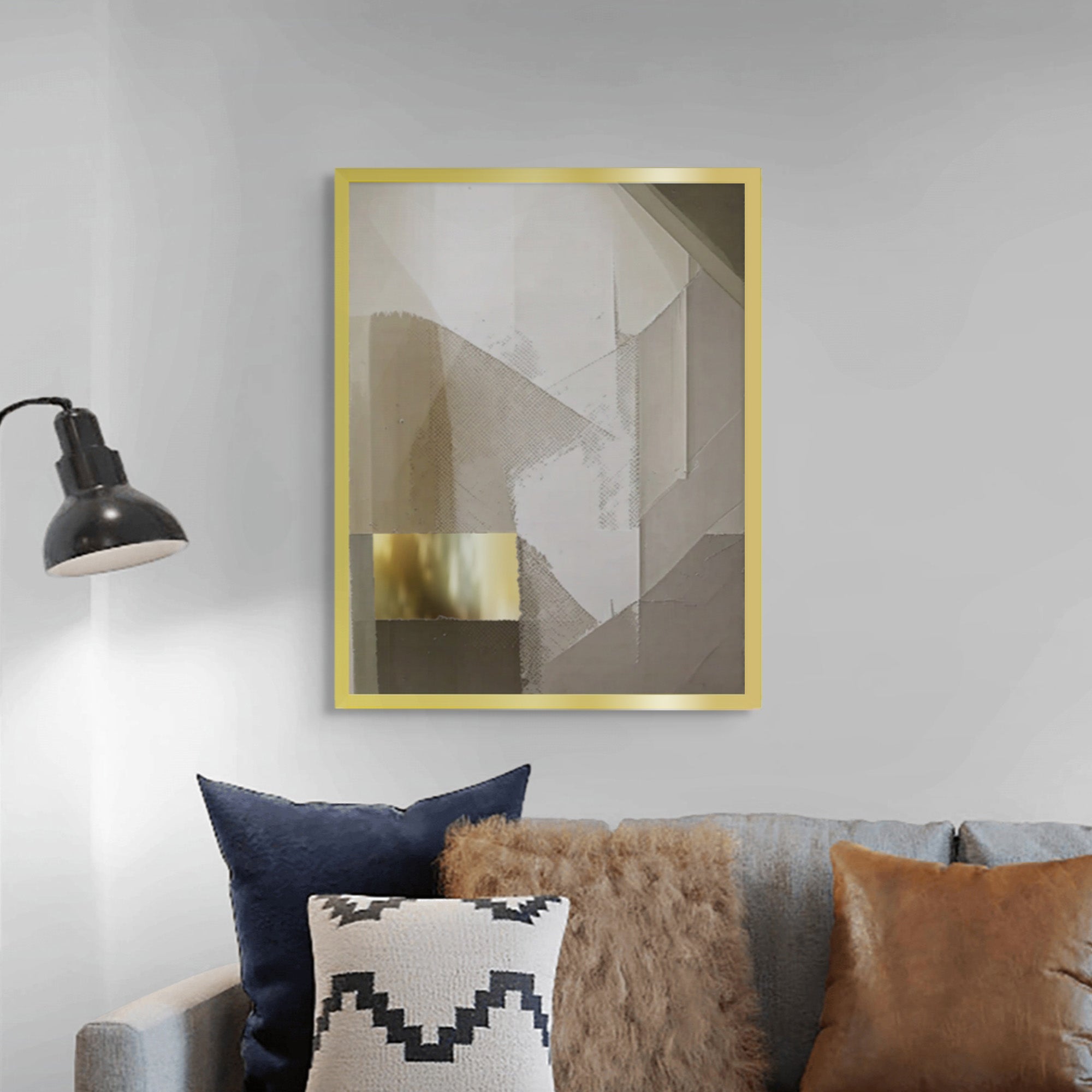 A calm, architectural abstraction in layered neutrals with faint grid textures and a bold gold accent. Ideal for minimalist interiors, reading corners, or hallways seeking structured serenity with a whisper of elegance and modern artistry.