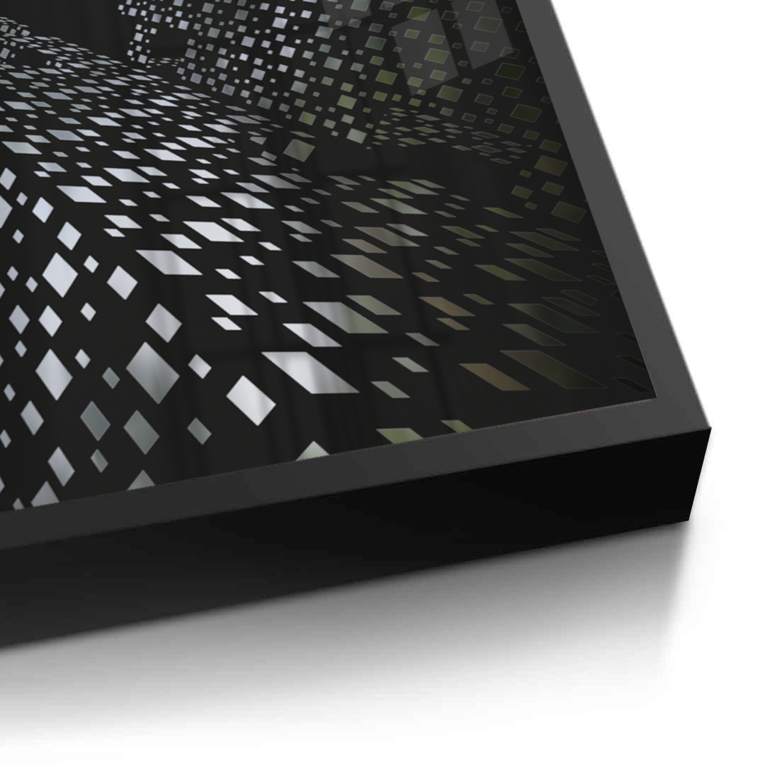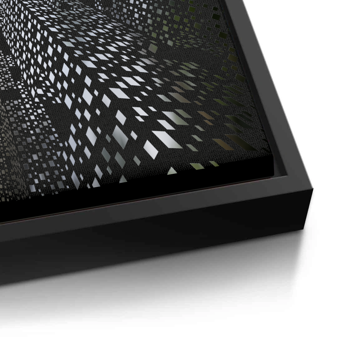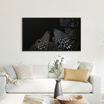 A dramatic upward view of illuminated skyscrapers in silver tones. This striking cityscape artwork captures the energy of modern architecture, perfect for offices, living rooms, or design-led interiors seeking a bold urban statement.