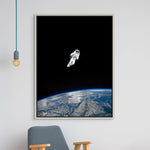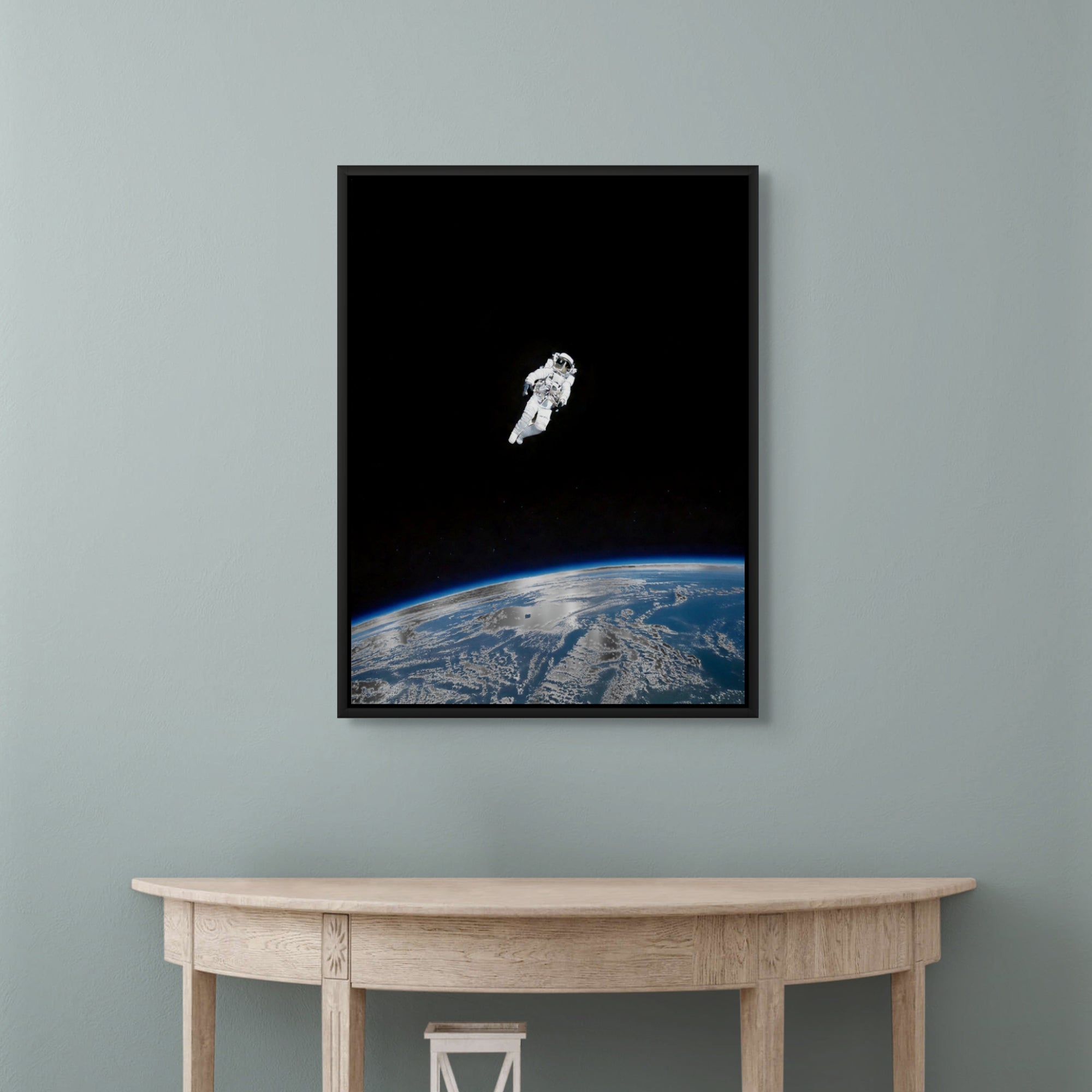A solitary astronaut floats weightlessly above Earth, surrounded by the infinite black of space. Silver-foiled Earth details shimmer below, adding contrast and depth. Perfect for minimalist, modern, or space-themed interiors craving a sense of vast stillness.