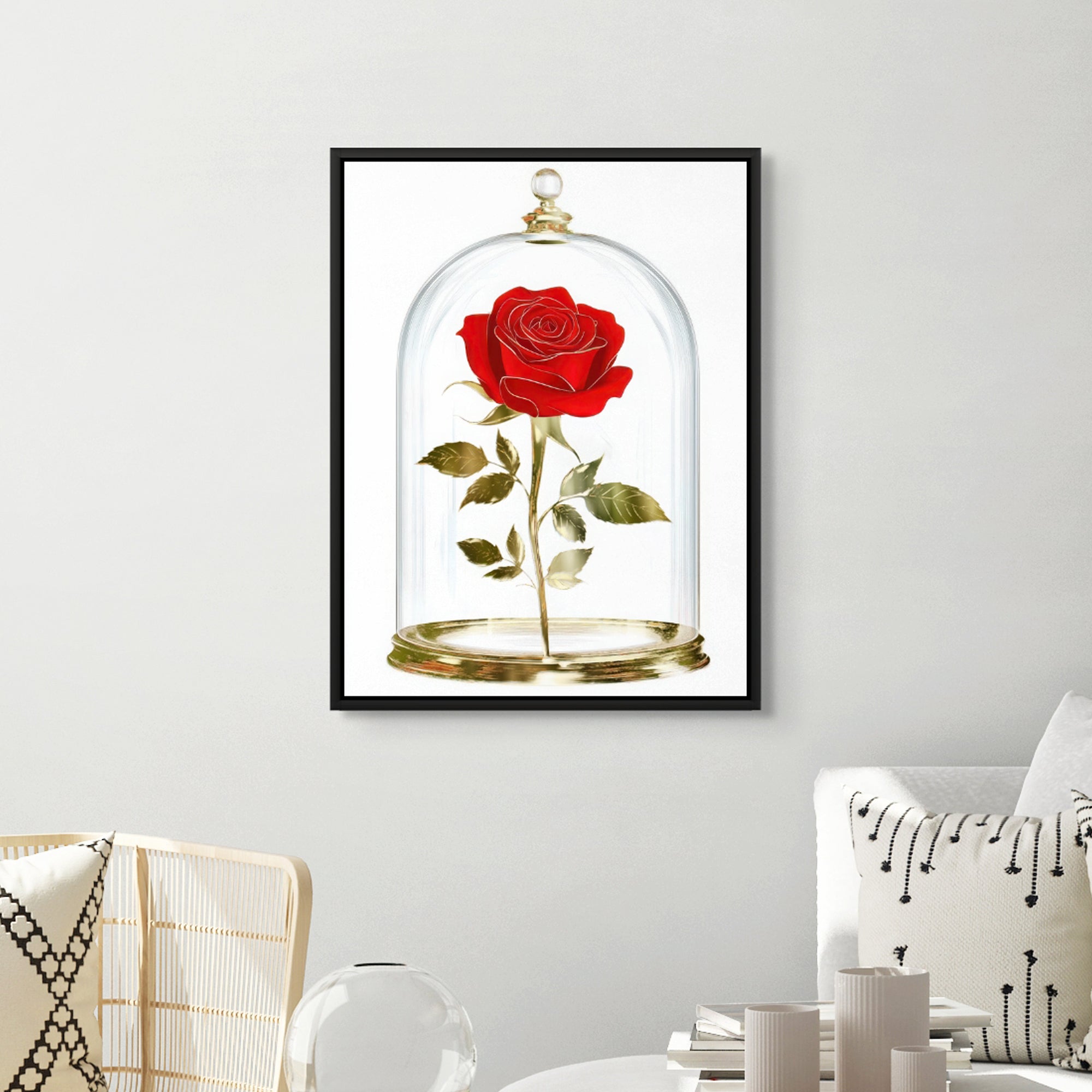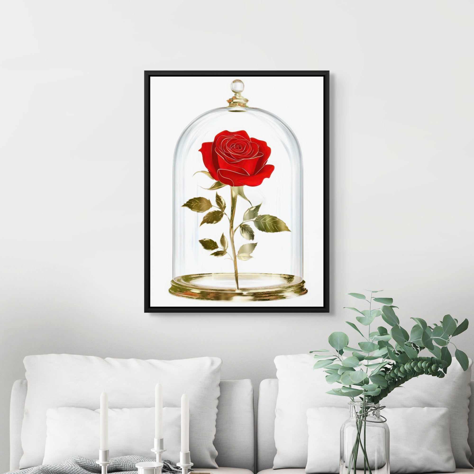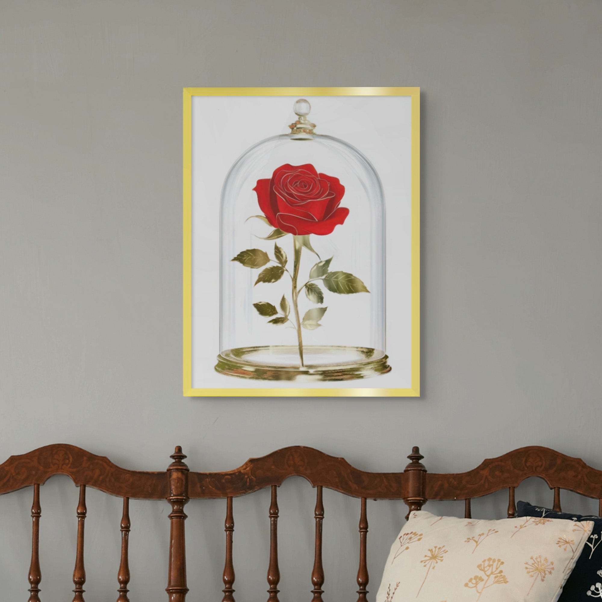 A stunning red rose, detailed with gold and preserved under a glass dome, this artwork adds elegance and romance. Ideal for bedrooms, vanities, or statement corners, it brings timeless charm and refined floral allure indoors.