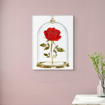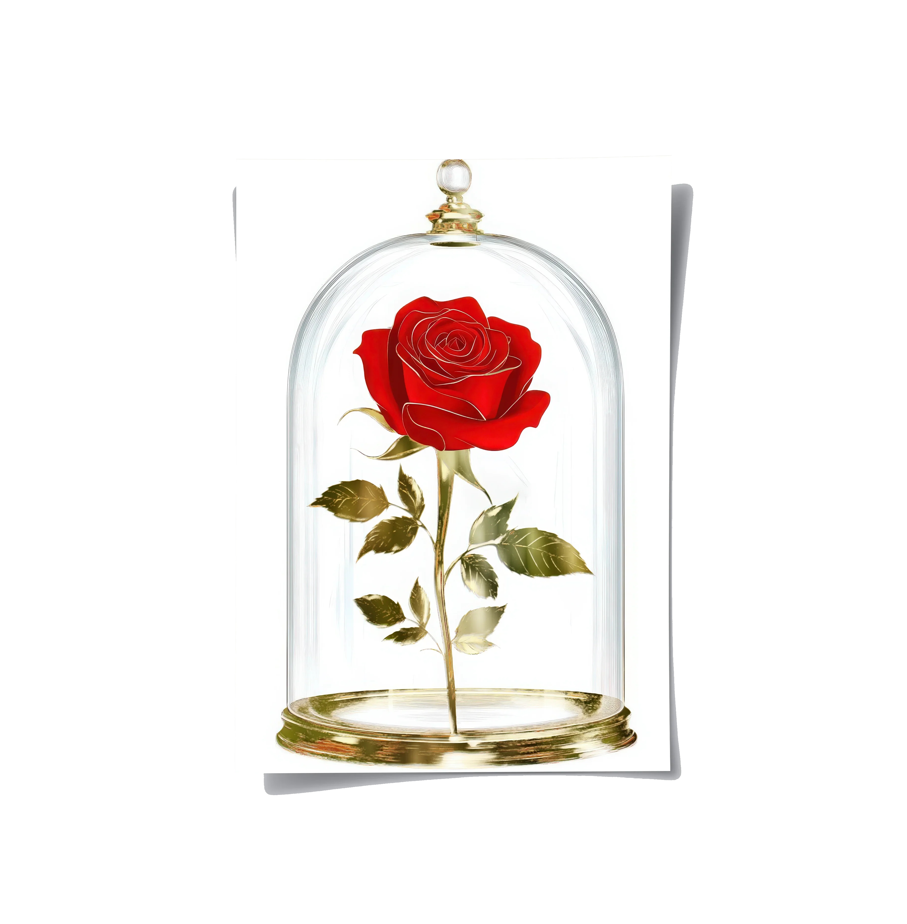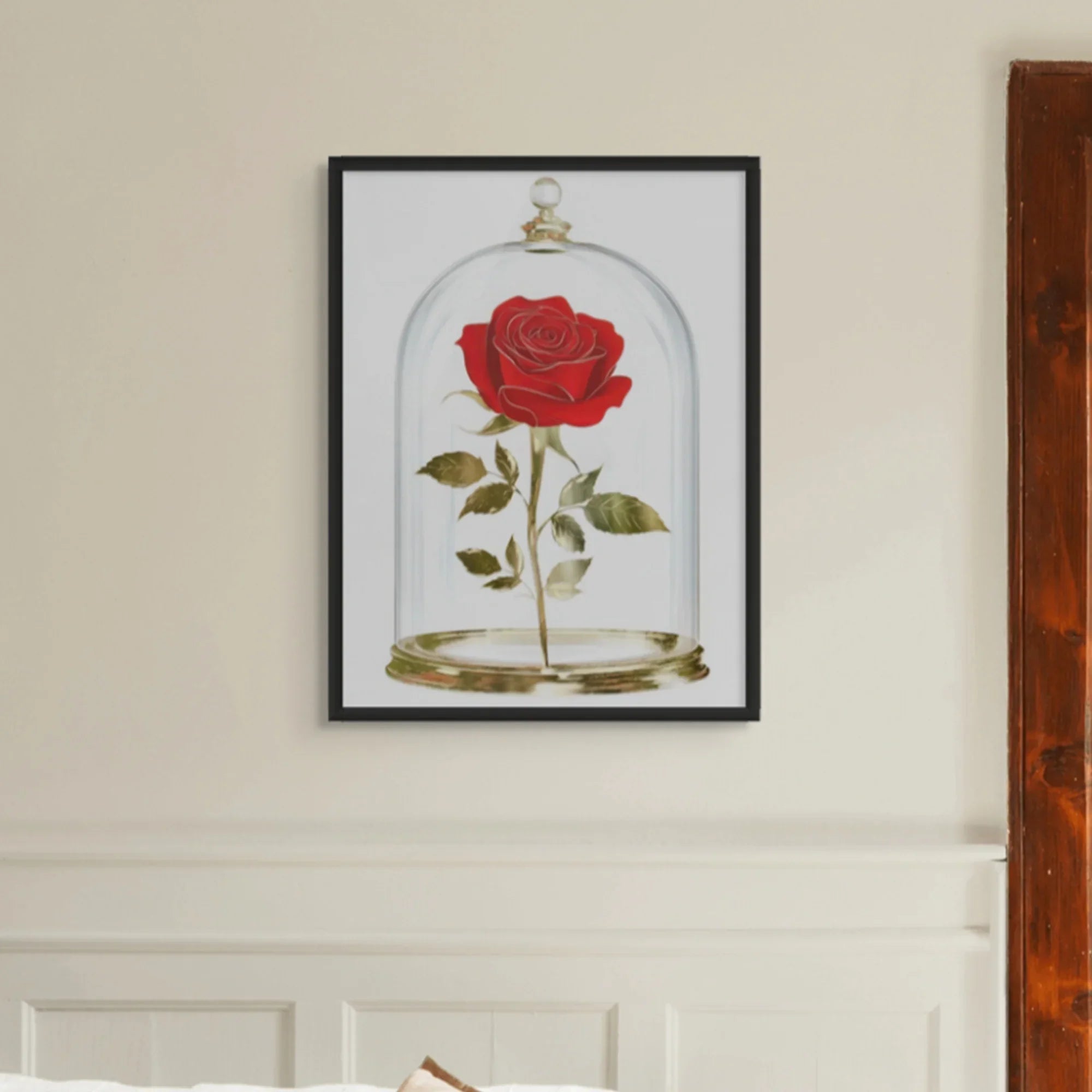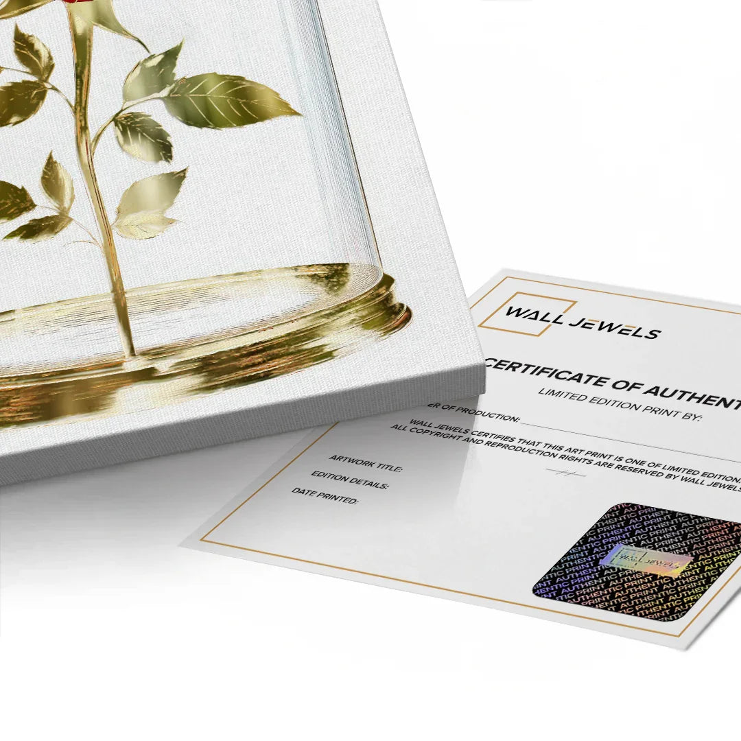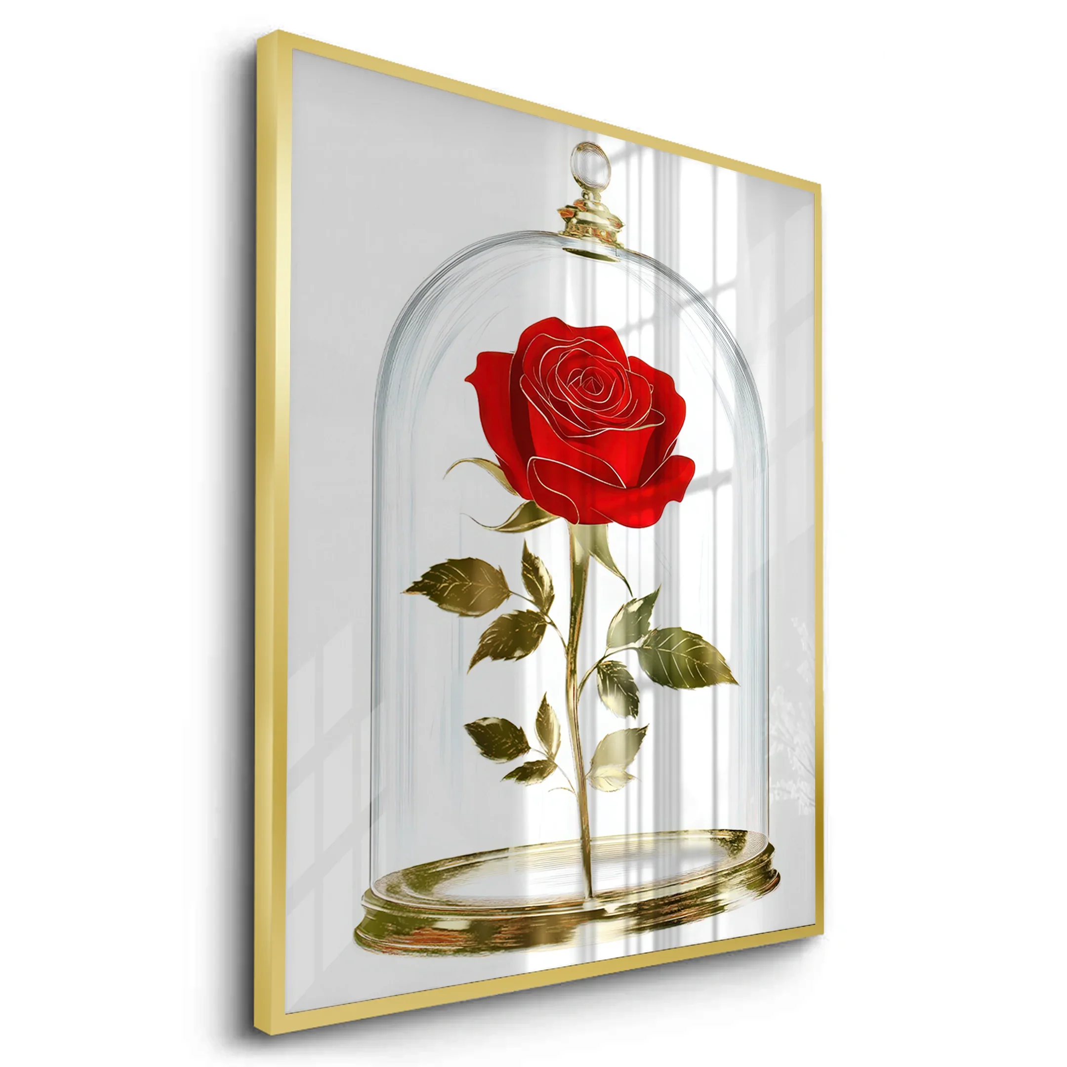 A stunning red rose, detailed with gold and preserved under a glass dome, this artwork adds elegance and romance. Ideal for bedrooms, vanities, or statement corners, it brings timeless charm and refined floral allure indoors.