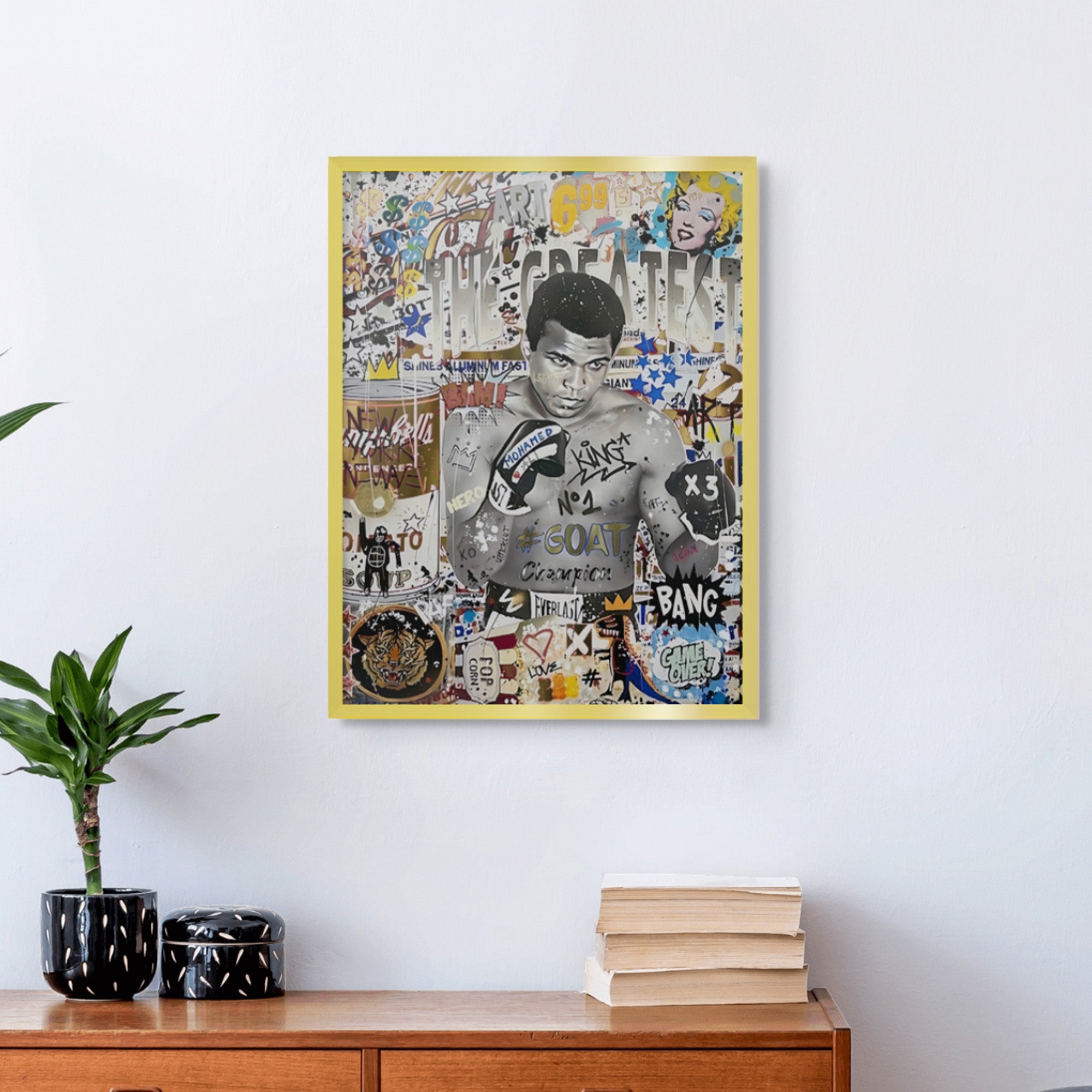 A bold tribute to Muhammad Ali, this graffiti-inspired piece fuses pop art and boxing greatness with expressive detail. Enhanced with gold foiling, it’s perfect for creative spaces, studios, or walls that celebrate icons without compromise.