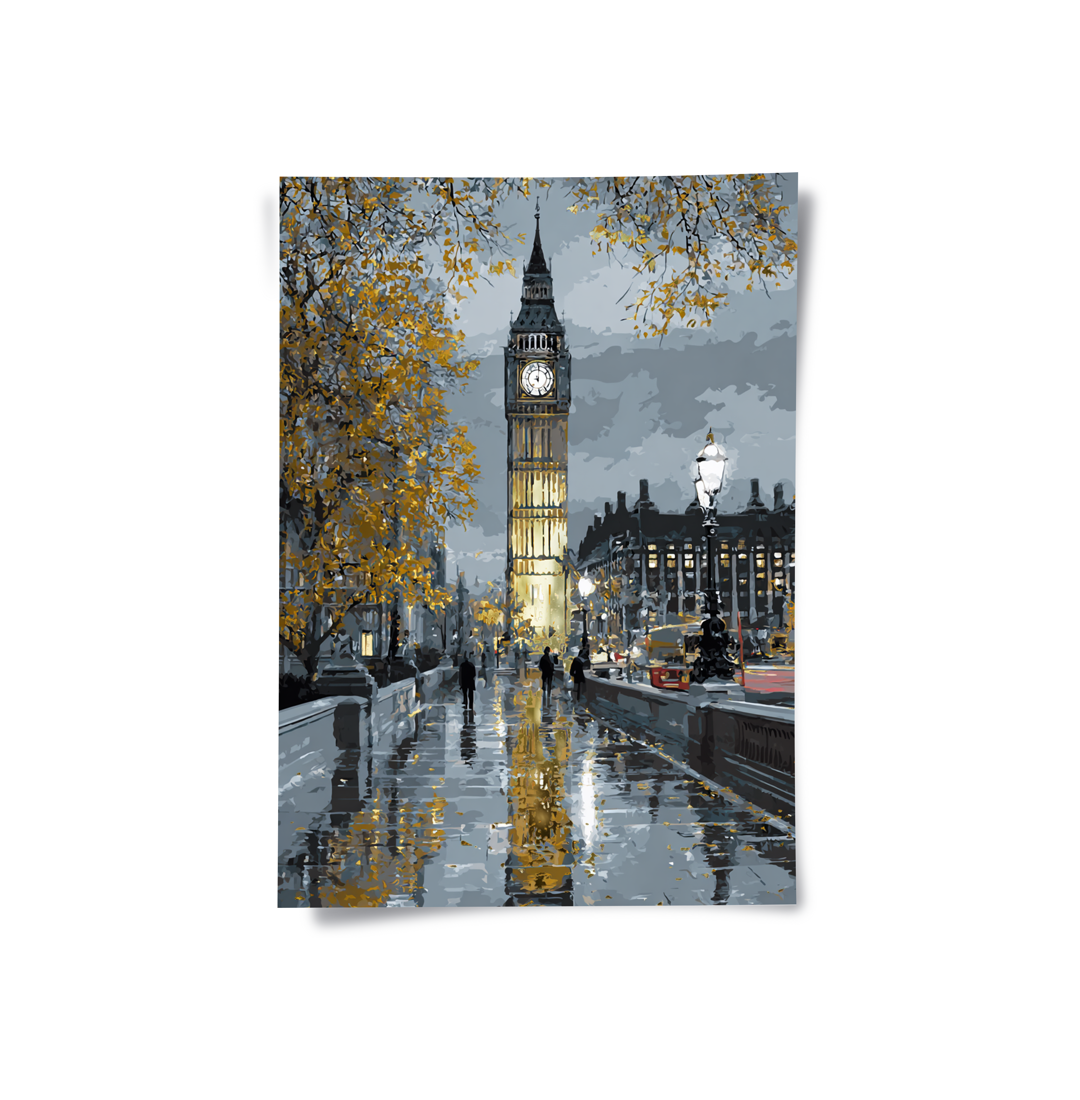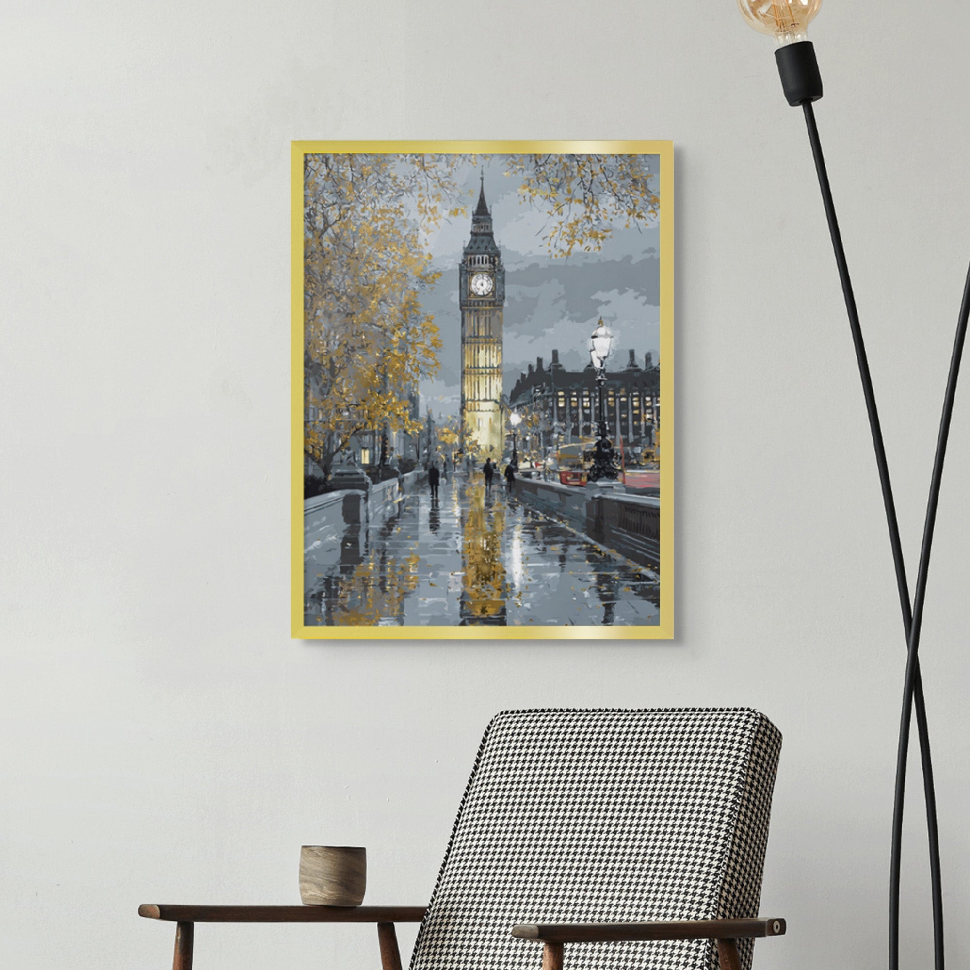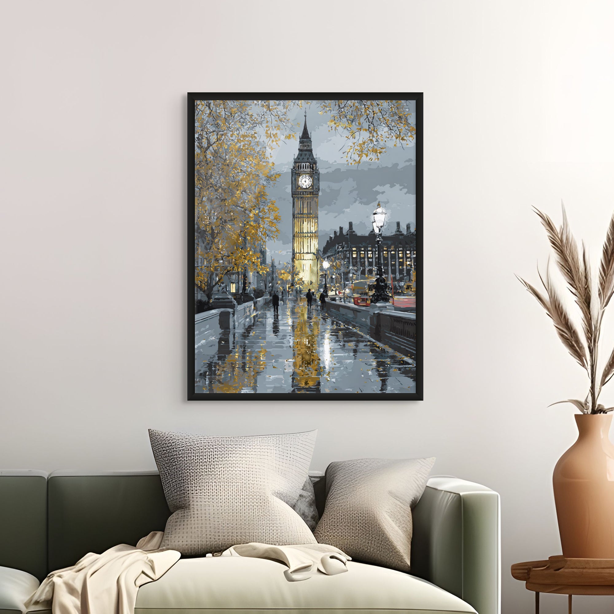 A striking gold-foiled artwork of Big Ben surrounded by autumn hues and glowing reflections. Its refined style makes it an eye-catching centerpiece for contemporary living rooms, workspaces, or interiors inspired by global landmarks.