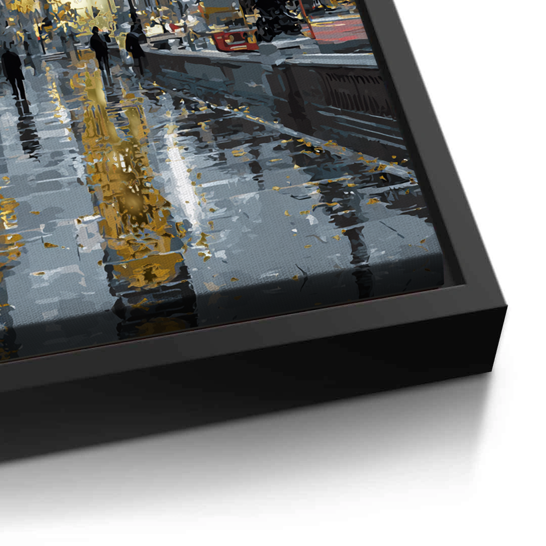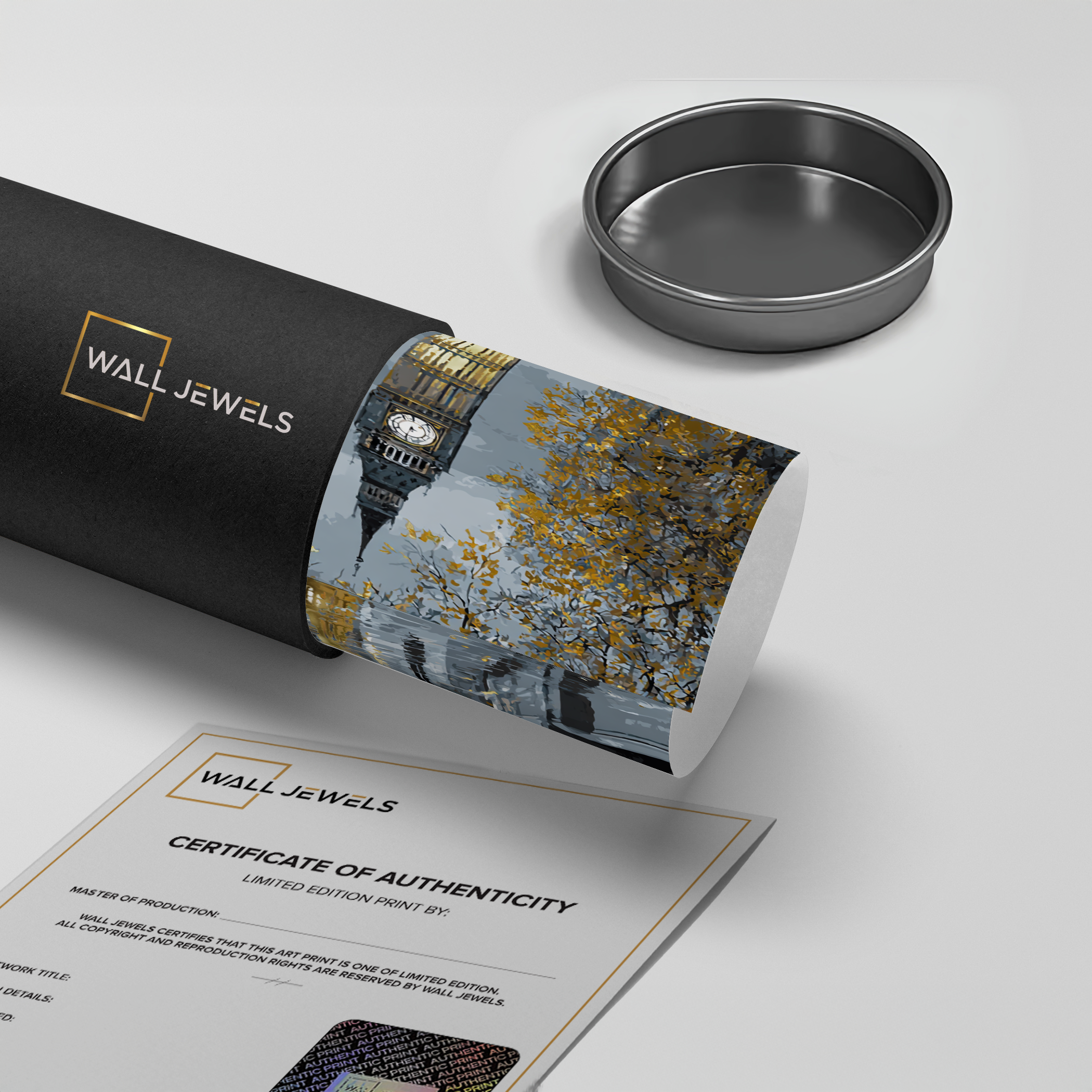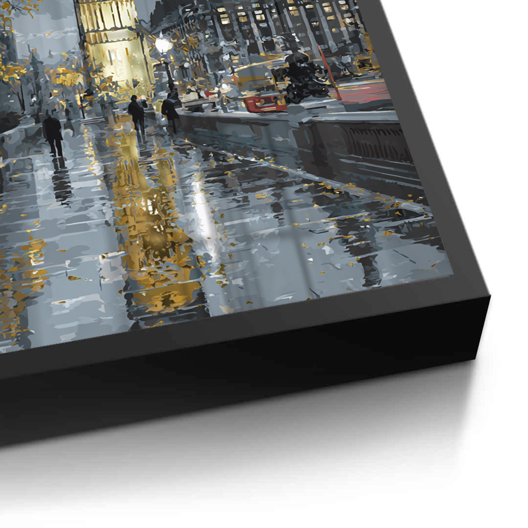 A striking gold-foiled artwork of Big Ben surrounded by autumn hues and glowing reflections. Its refined style makes it an eye-catching centerpiece for contemporary living rooms, workspaces, or interiors inspired by global landmarks.