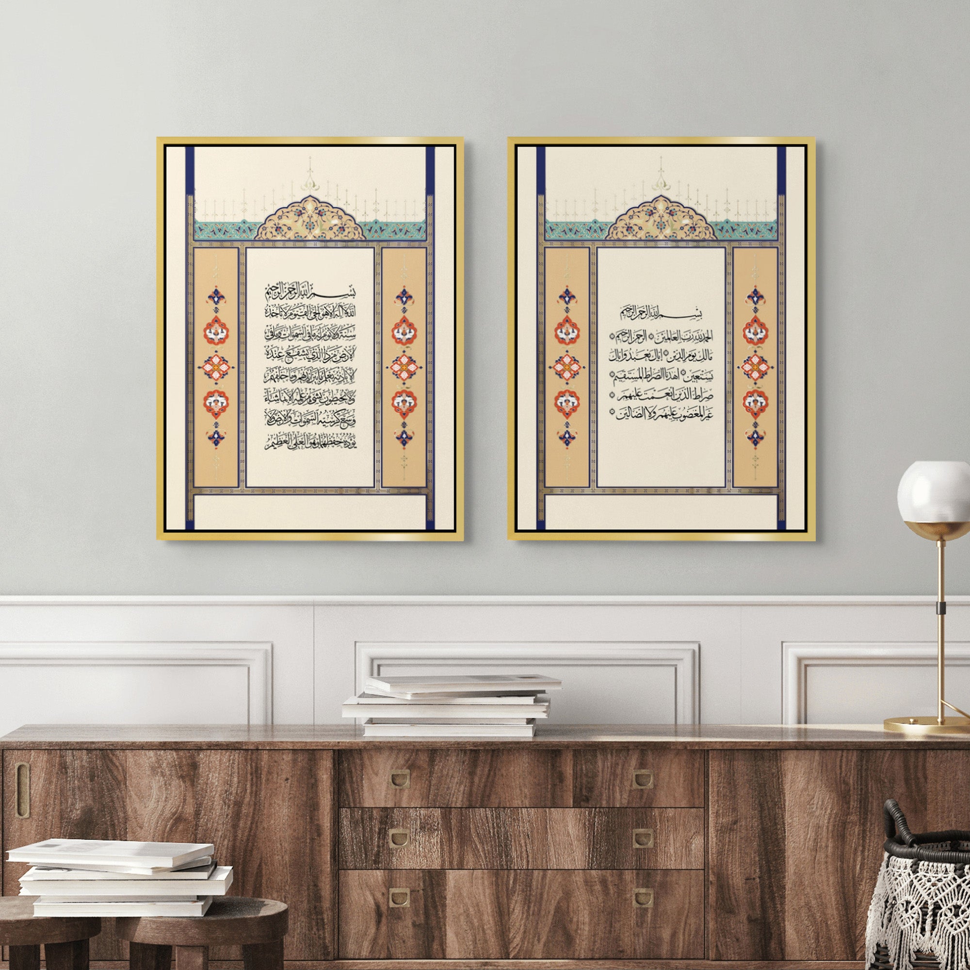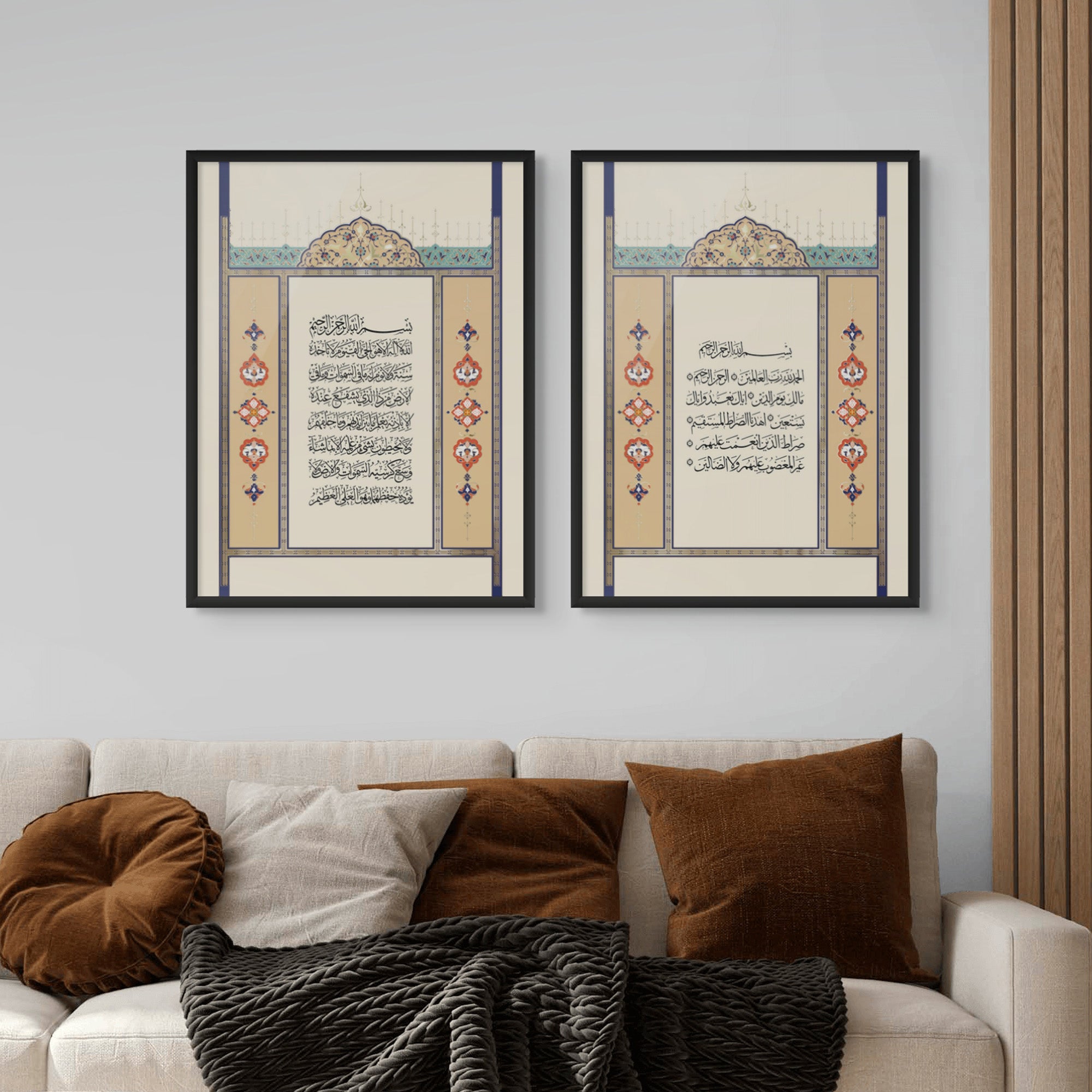 An elegant pairing of Surah Al-Fatiha and Ayatul Kursi in stunning Arabic calligraphy, framed with intricate geometric detailing and regal tones. A timeless piece ideal for prayer spaces, living rooms, entryways, or study areas.