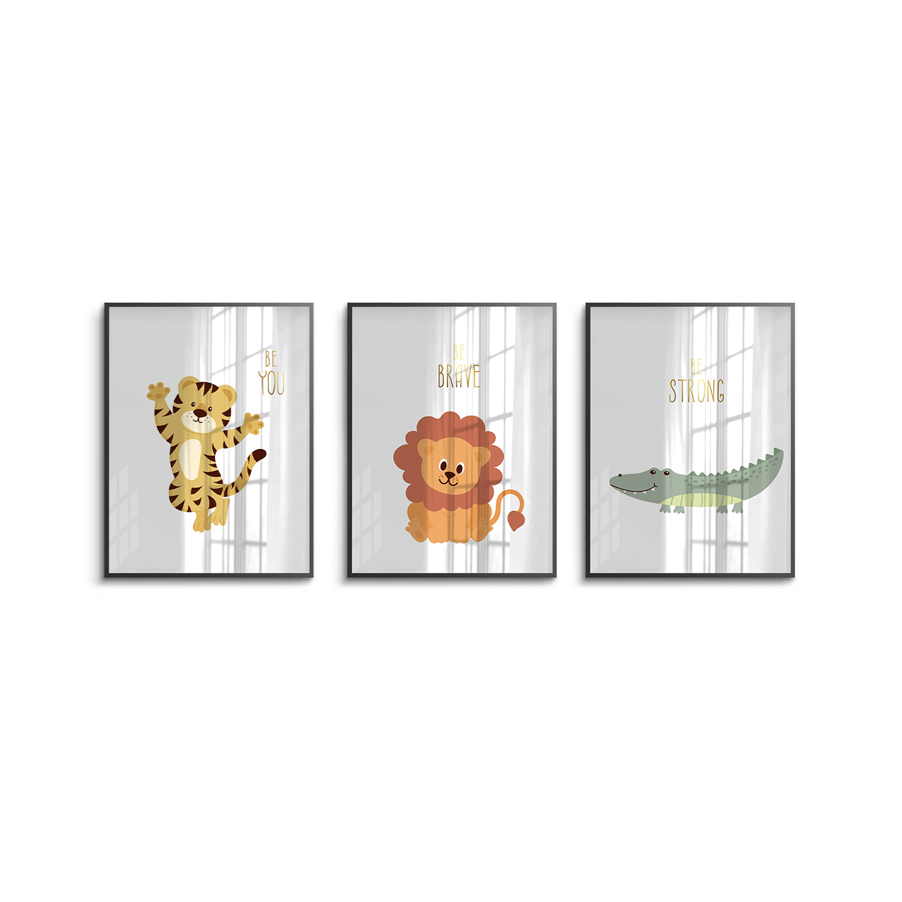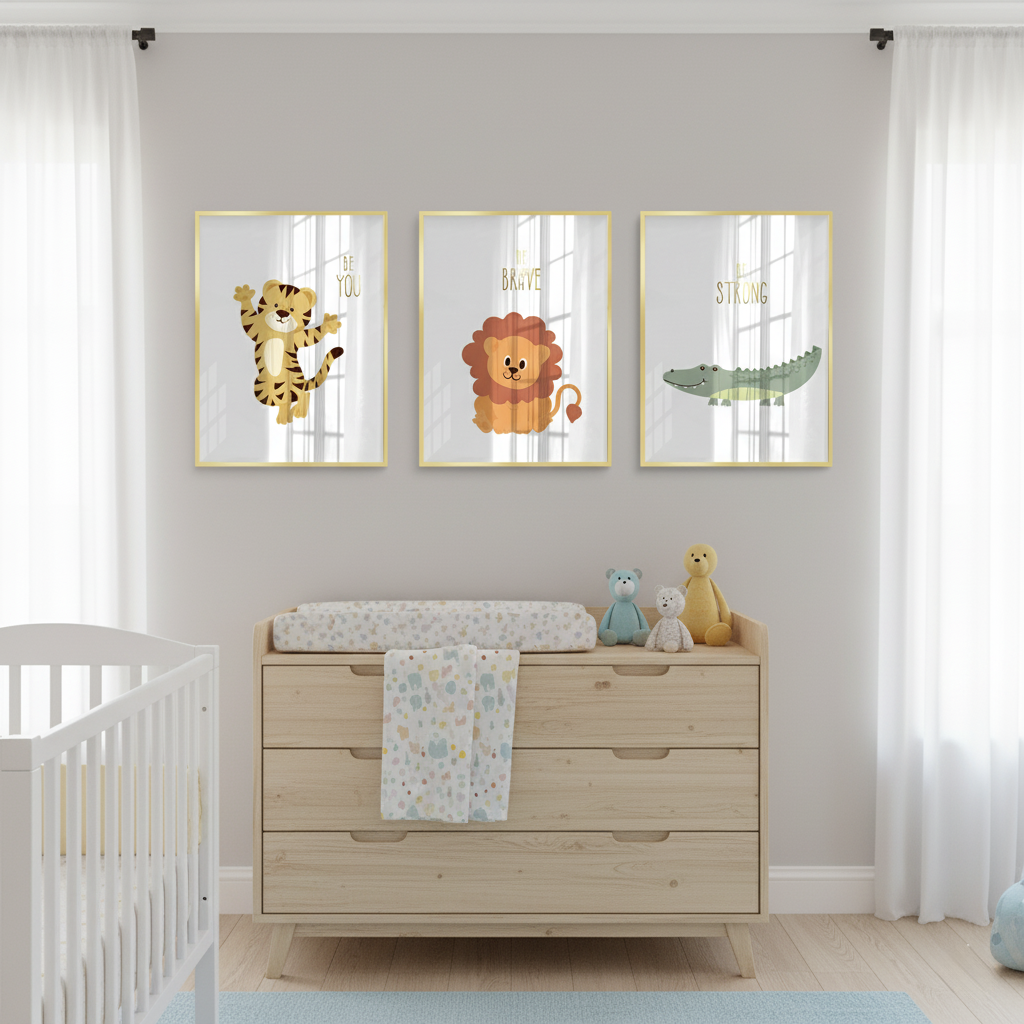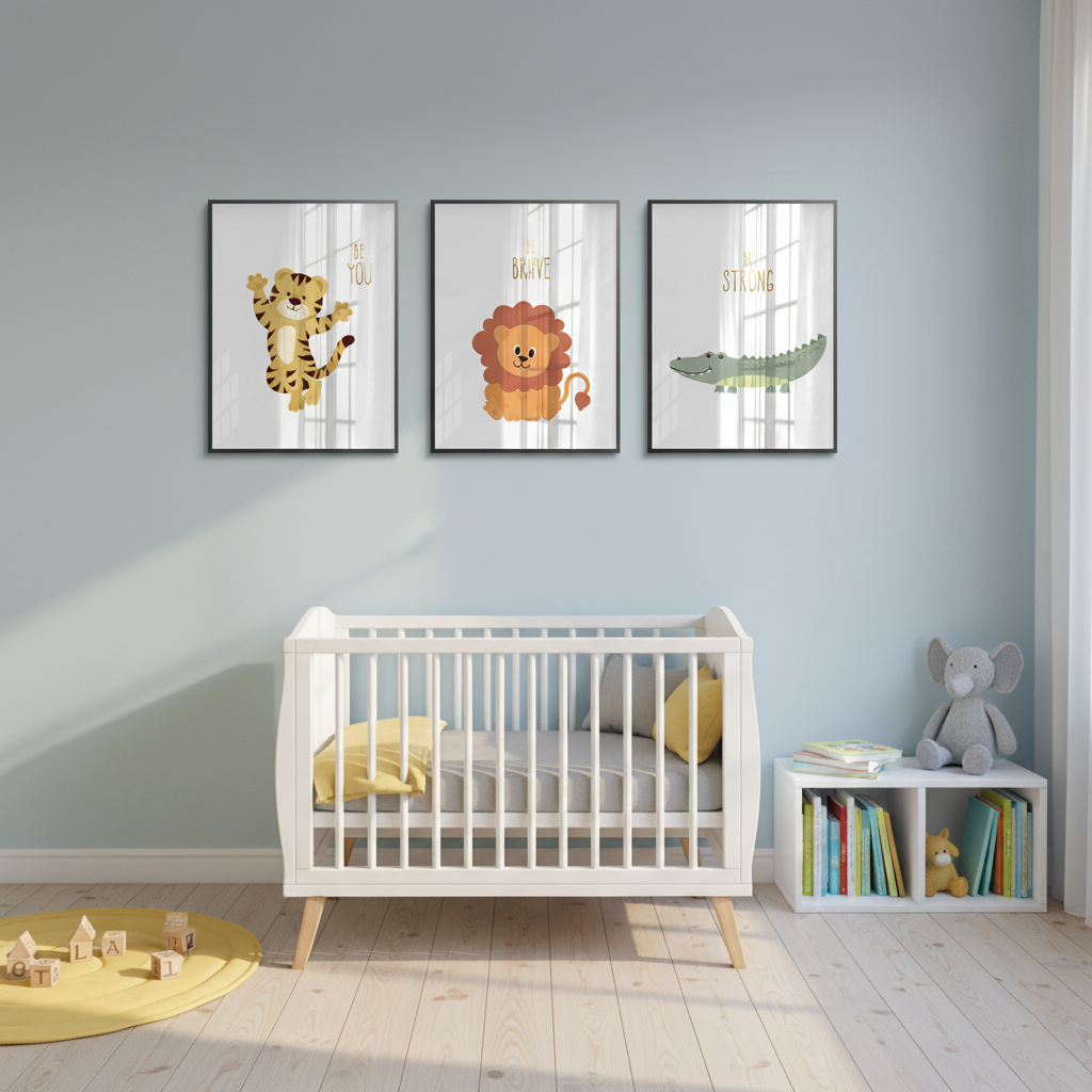 This empowering gold foiled kids’ art set features playful jungle animals paired with affirmations — Be You, Be Brave, Be Strong. The shimmering gold foil details add positivity and courage, making it perfect for nurseries, playrooms, or children’s bedrooms.