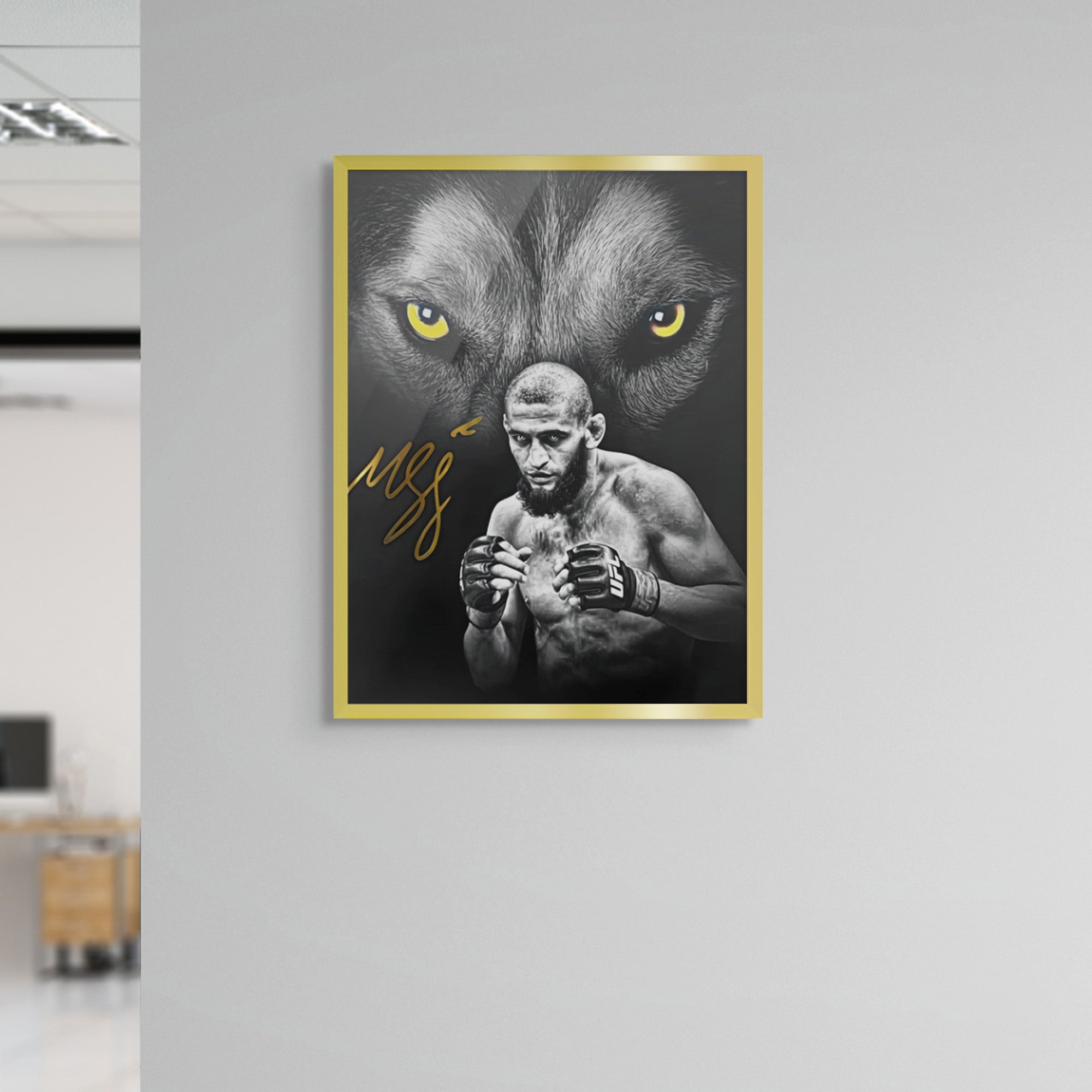 This powerful artwork features UFC fighter Khamzat Chimaev, fused with the image of a wolf to embody focus, ferocity, and fearlessness. Enhanced with gold foiling, it’s perfect for home gyms, studios, or high-impact spaces.