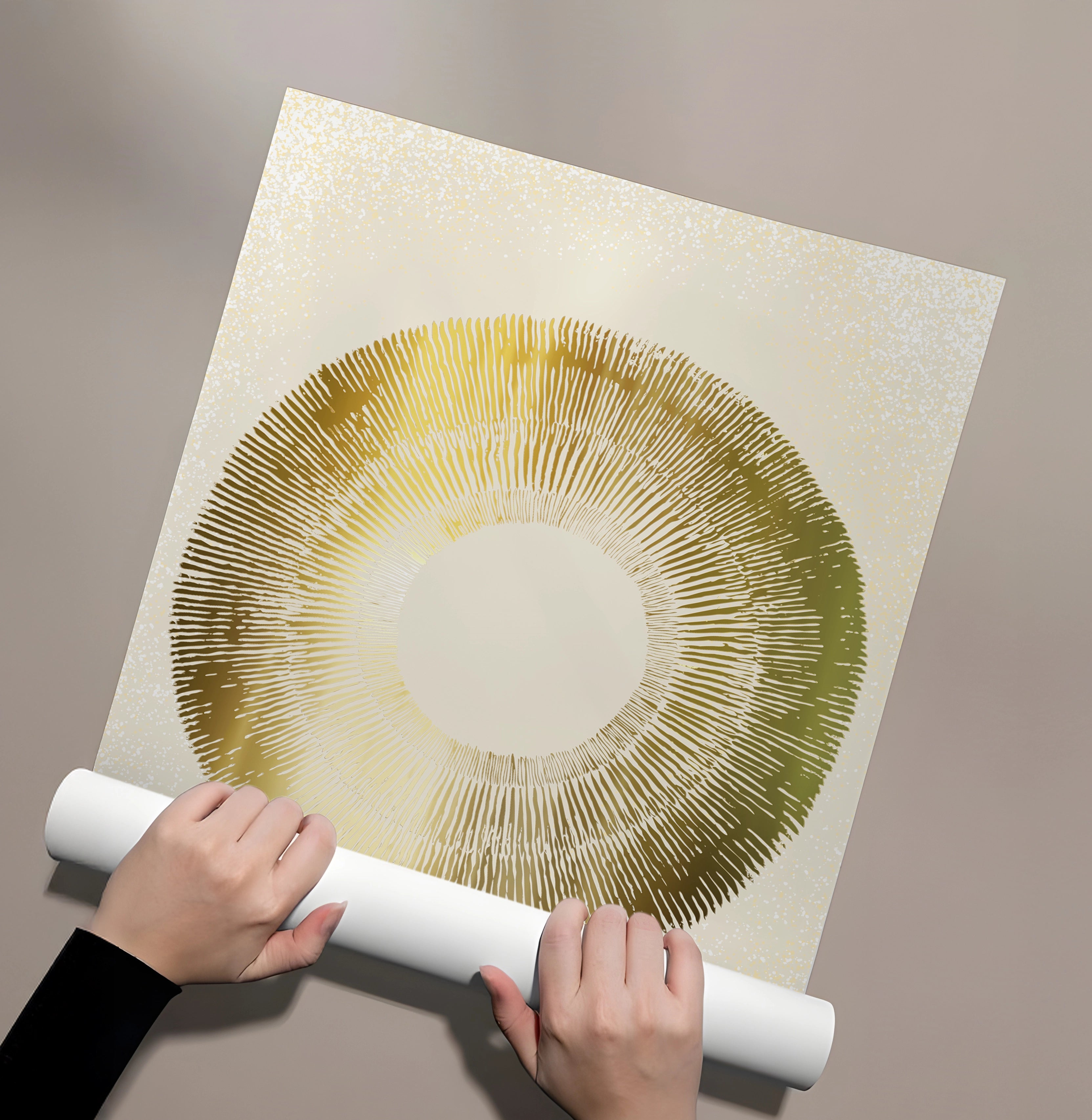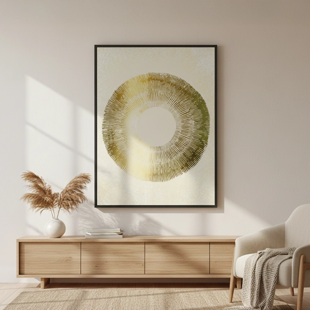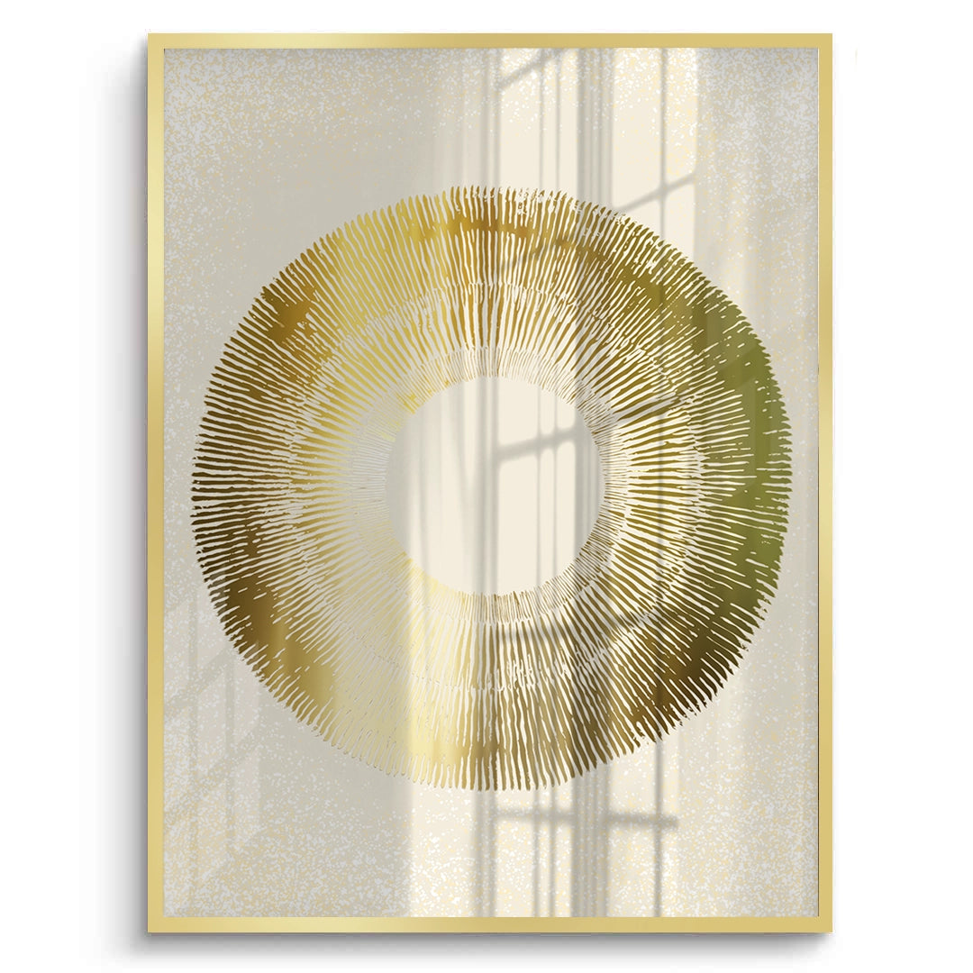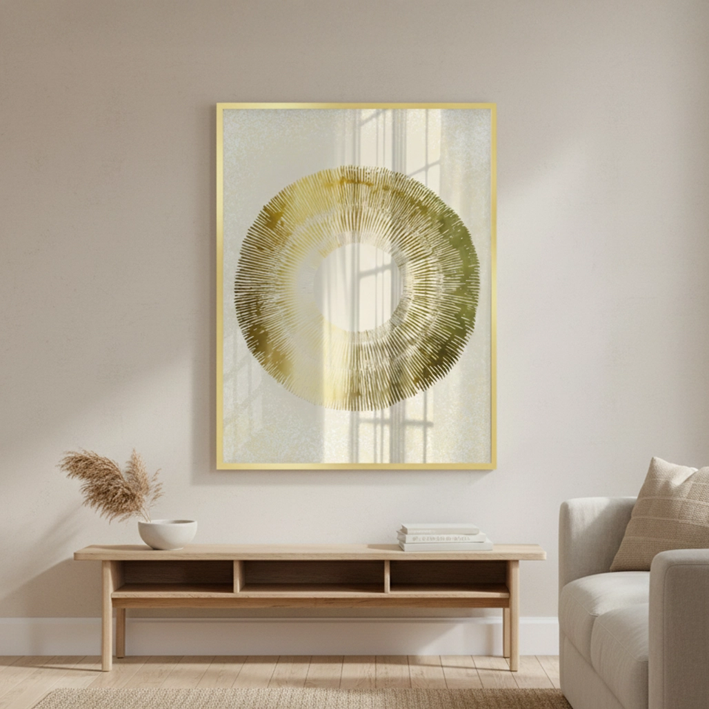 Halo features a radiant circular form built from fine gold foiled strokes, creating a sense of quiet energy and focus. Its luminous simplicity makes it well suited for living rooms, bedrooms, meditation spaces, and modern interiors.