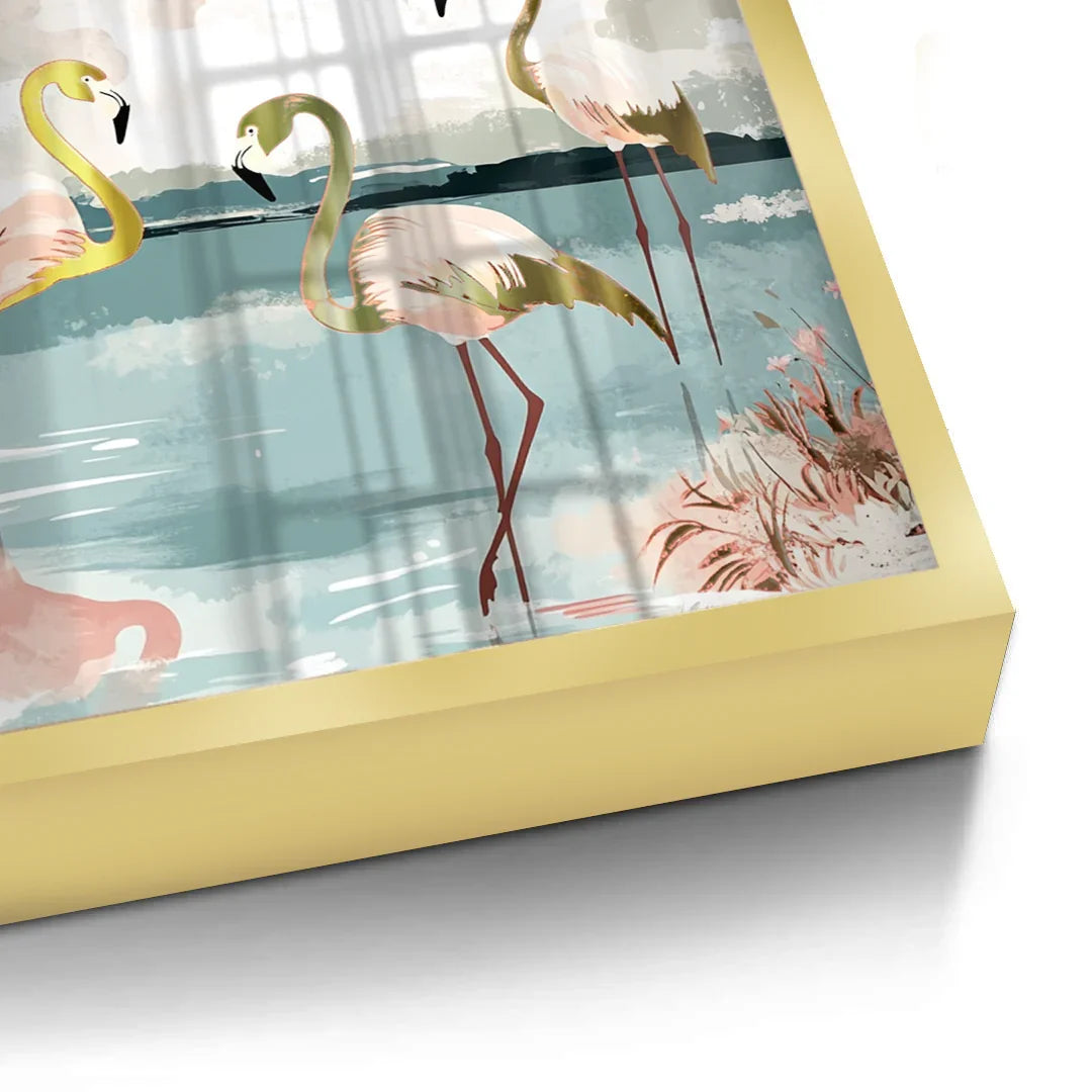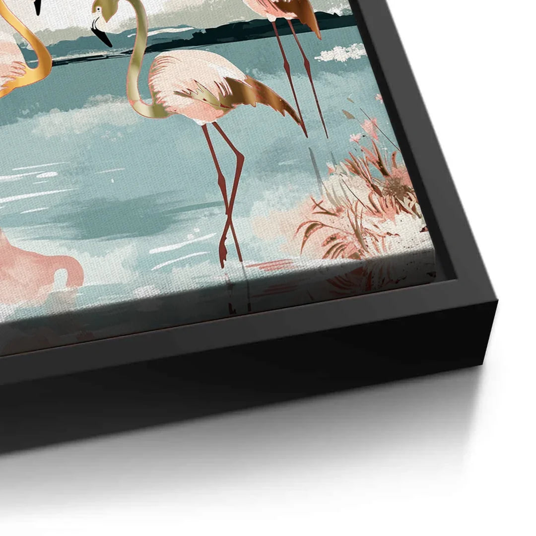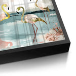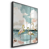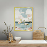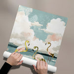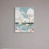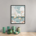 Three elegant flamingos wade through tranquil coastal waters under soft, dreamy clouds in this pastel-toned artwork. Perfect for brightening living areas, bathrooms, or children’s rooms with a gentle splash of charm and colour.