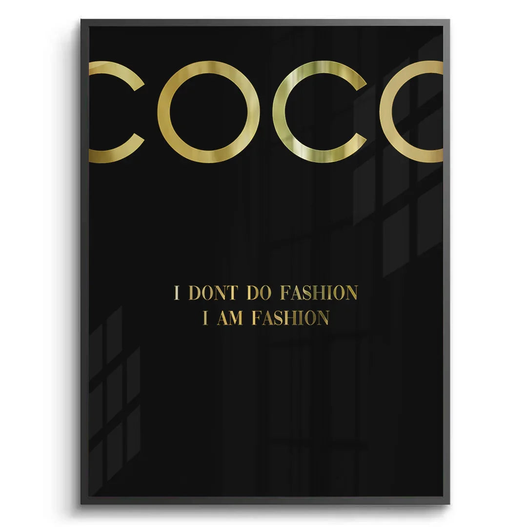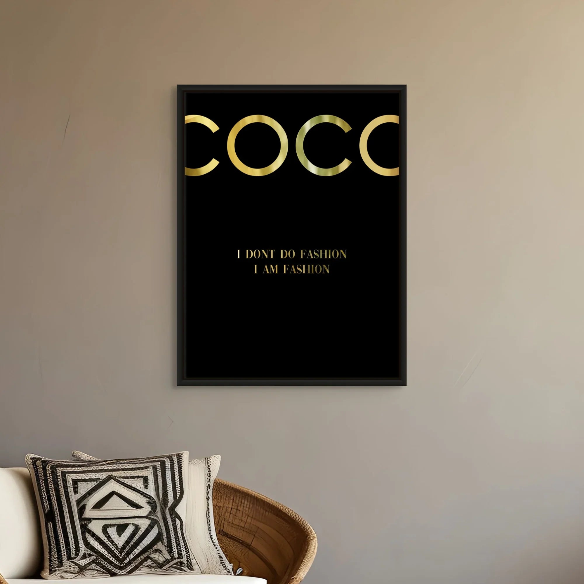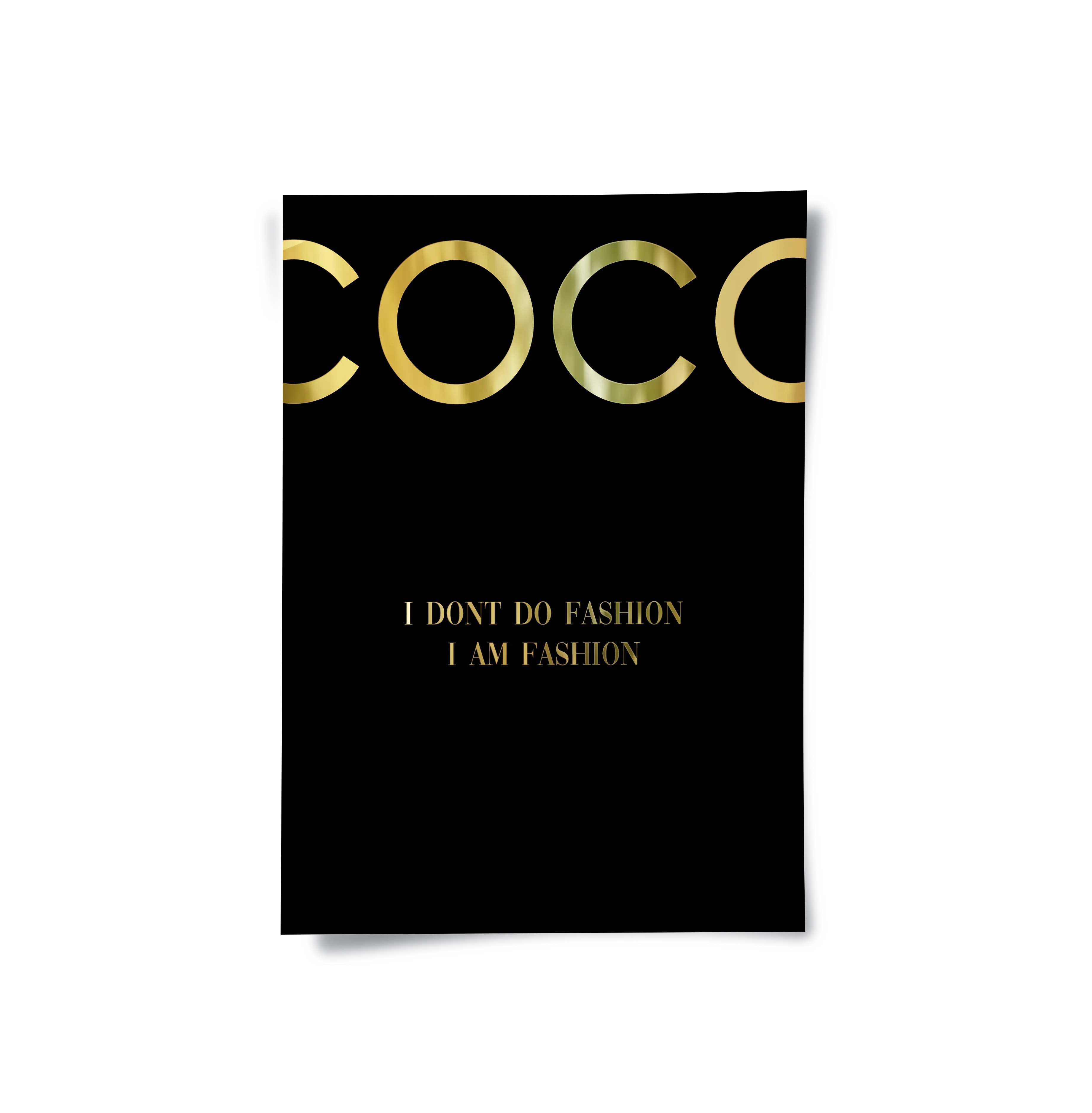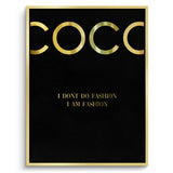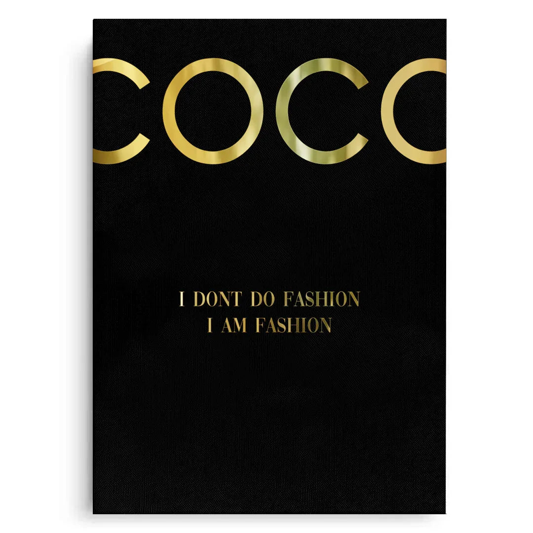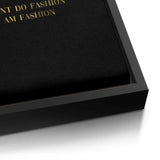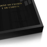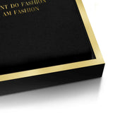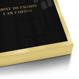 A bold and empowering artwork showcasing the iconic quote “I don’t do fashion, I am fashion” in gold foil against a deep black backdrop. Ideal for fashion lovers who live, breathe, and embody timeless style.